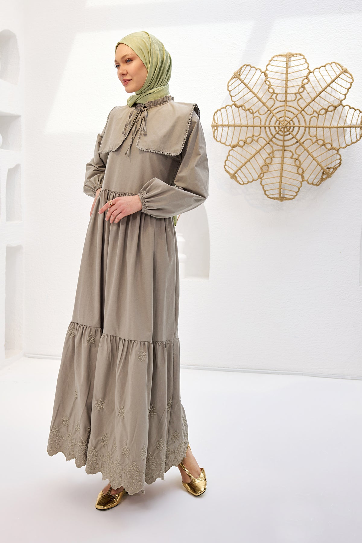 Moss Green Dress with Broderie Anglaise Detail and Sailor Collar