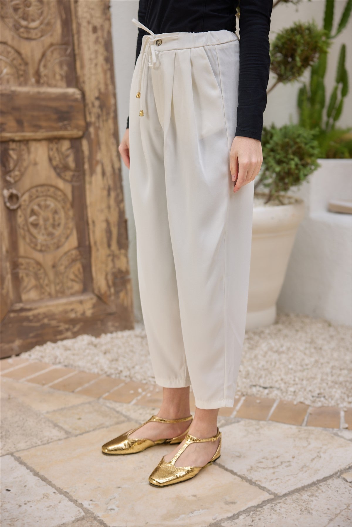 White Elastic-Waist Tapered Pants