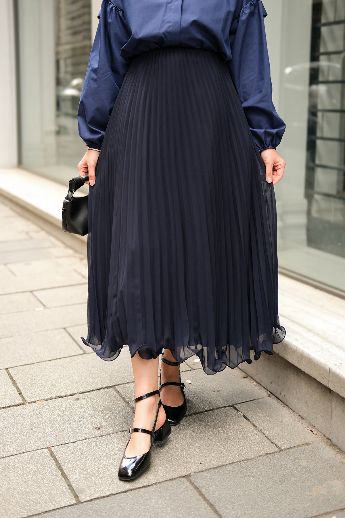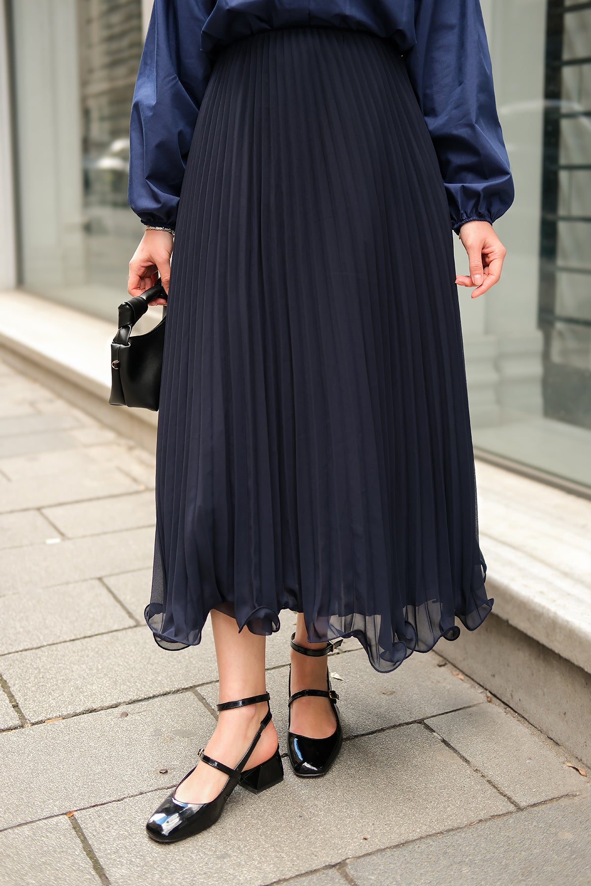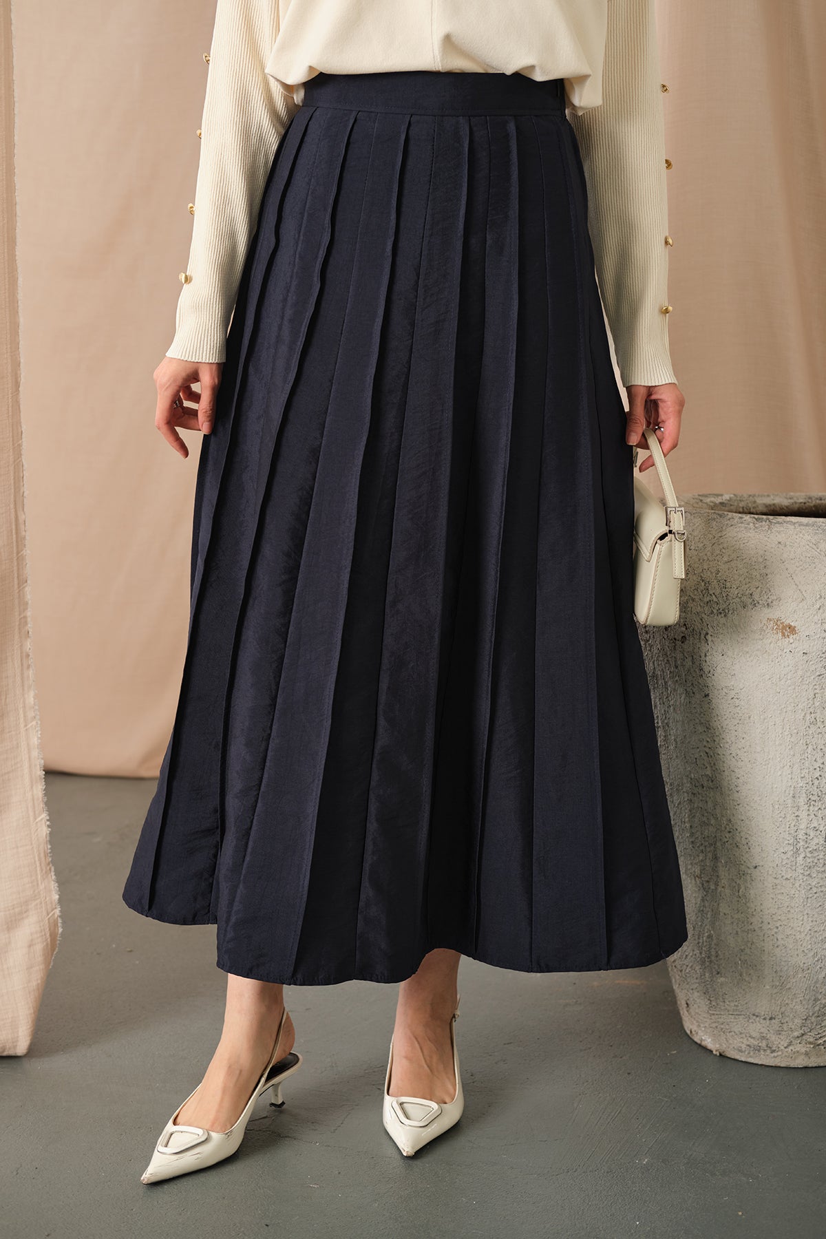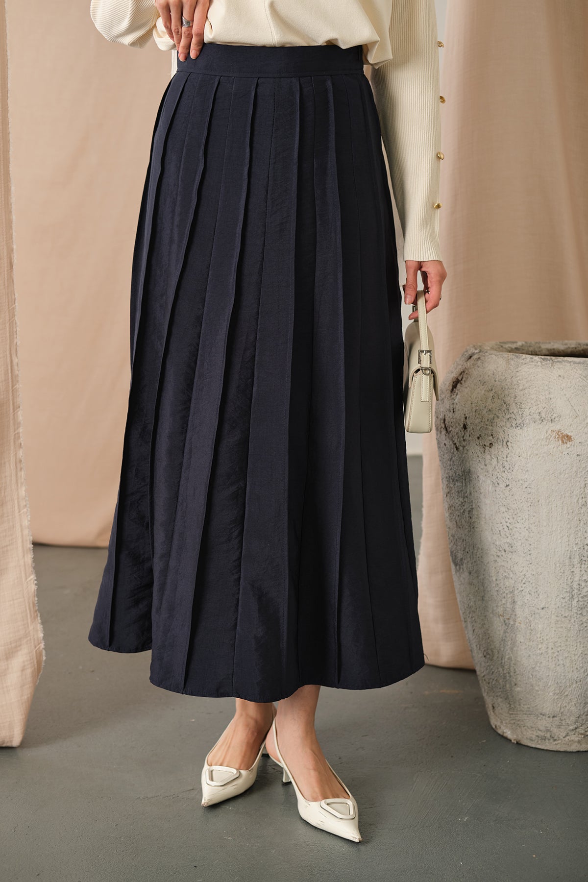 Elastic Waist Pleated Skirt Navy Blue
