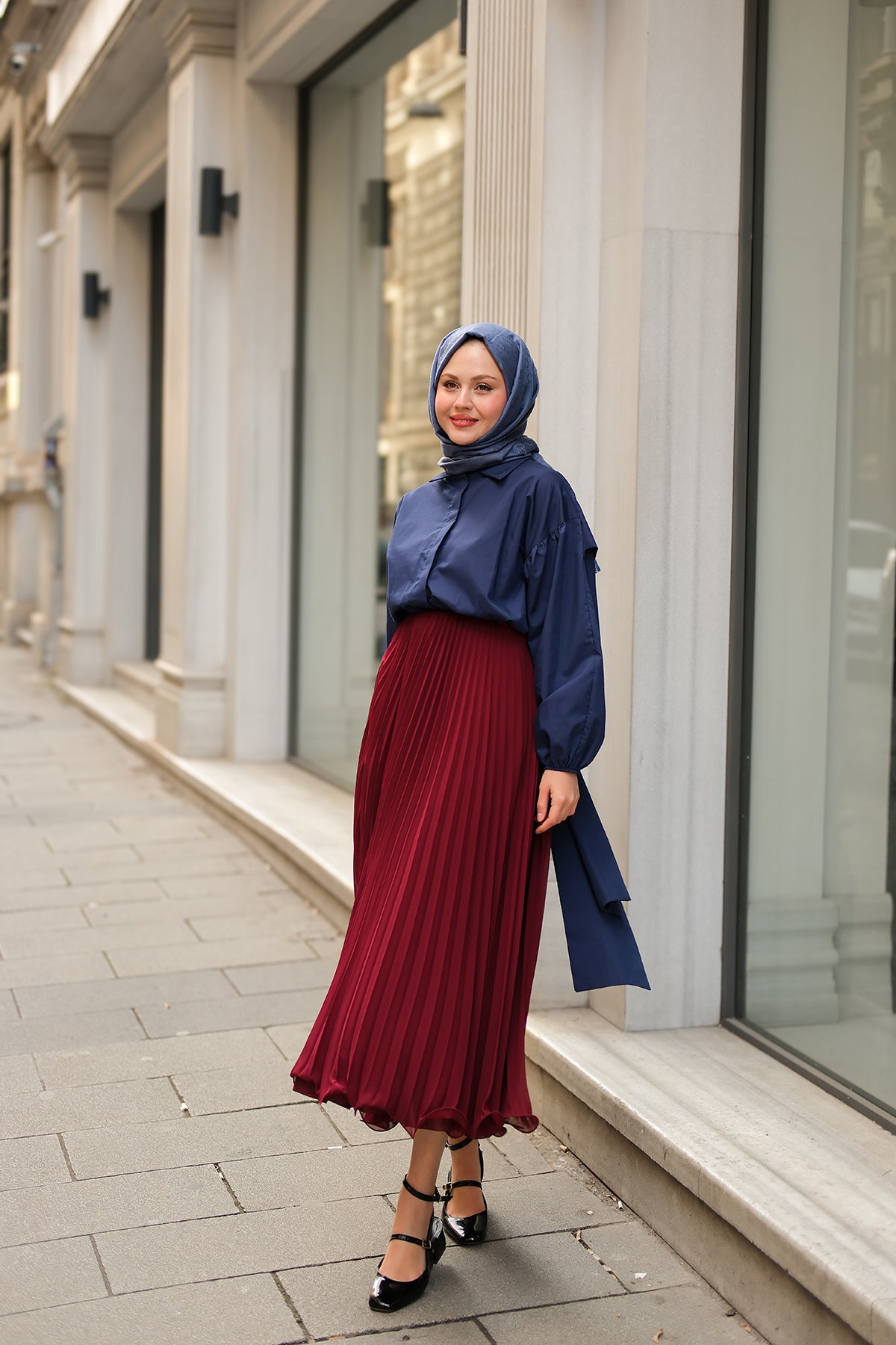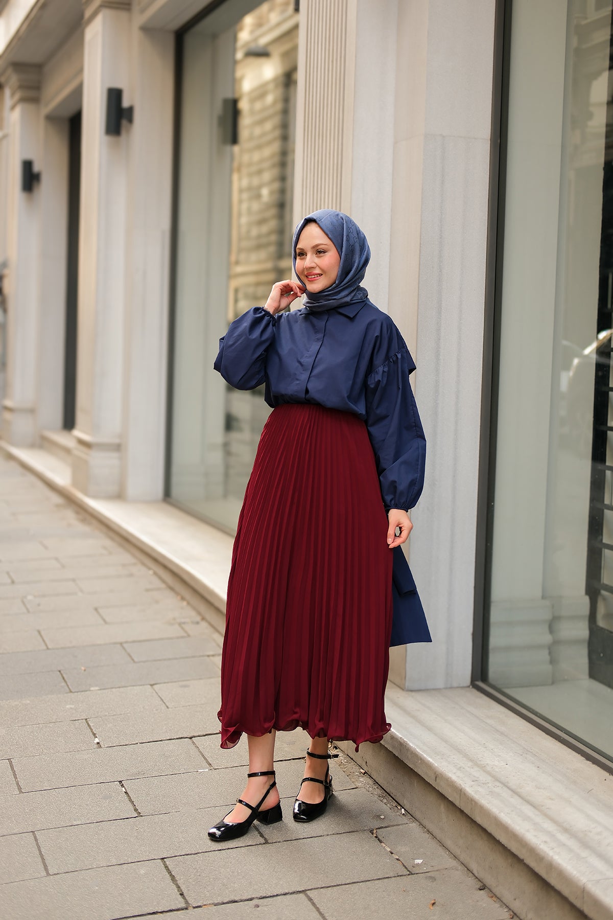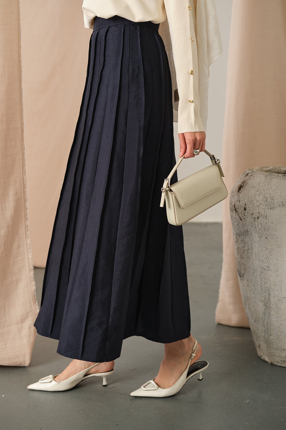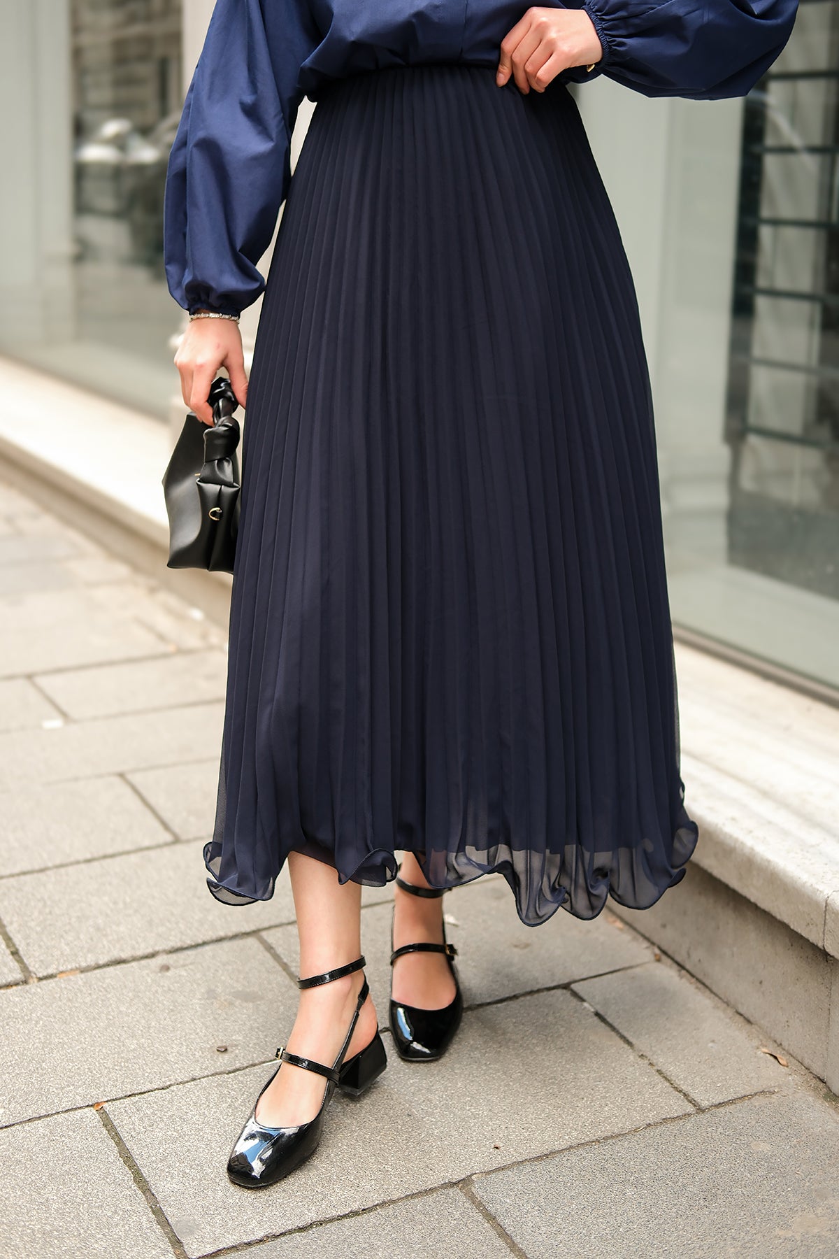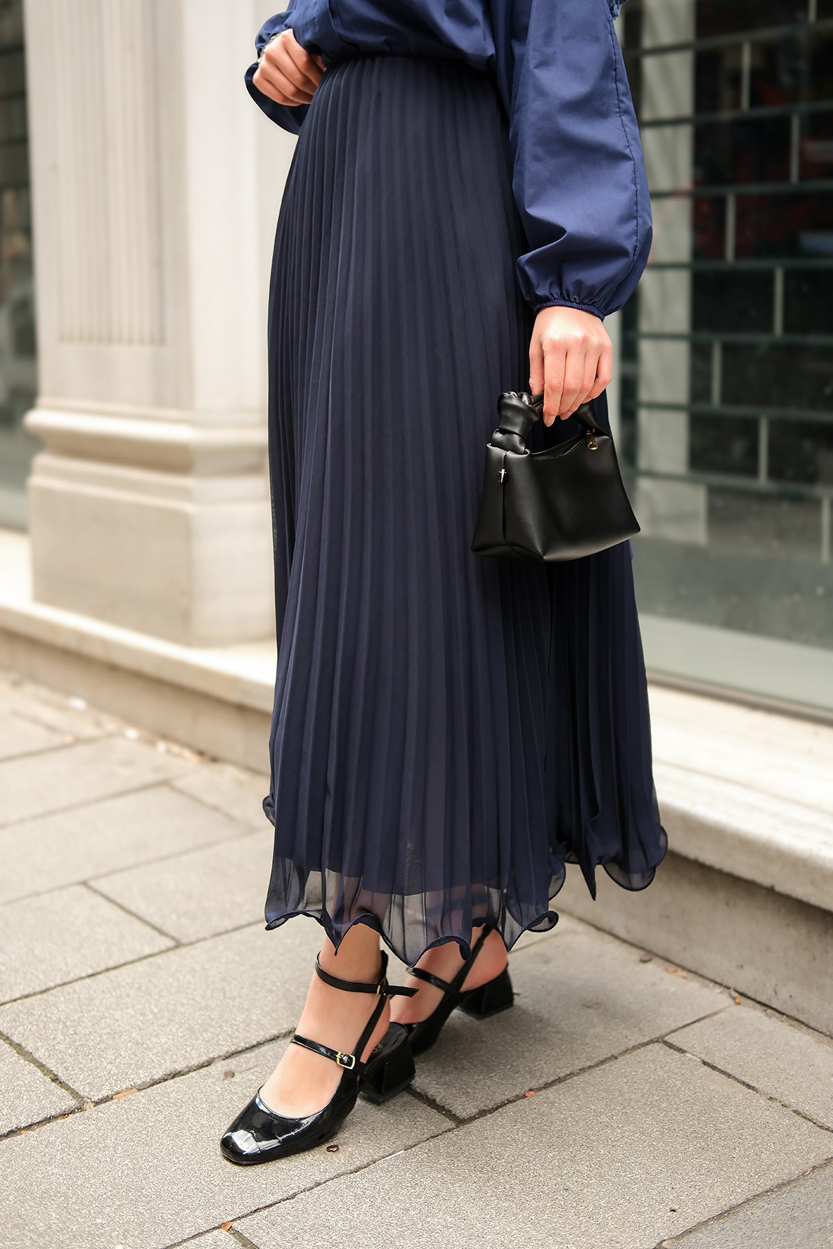Elastic Waist Pleated Skirt Navy Blue