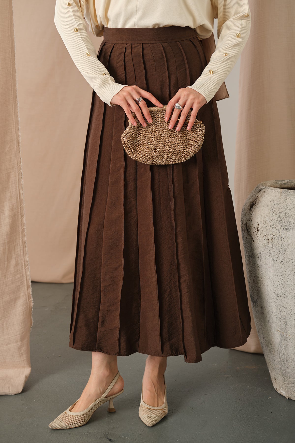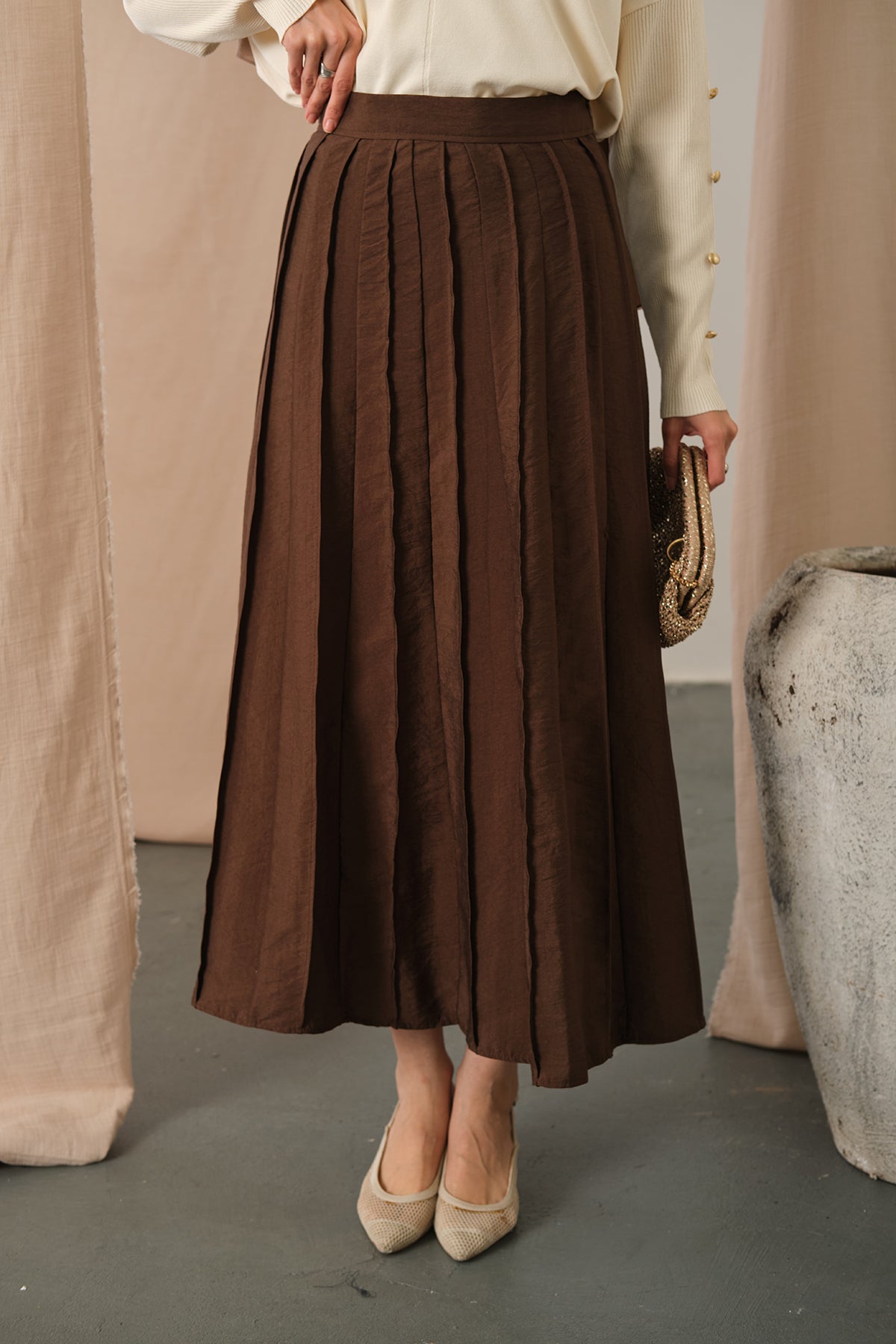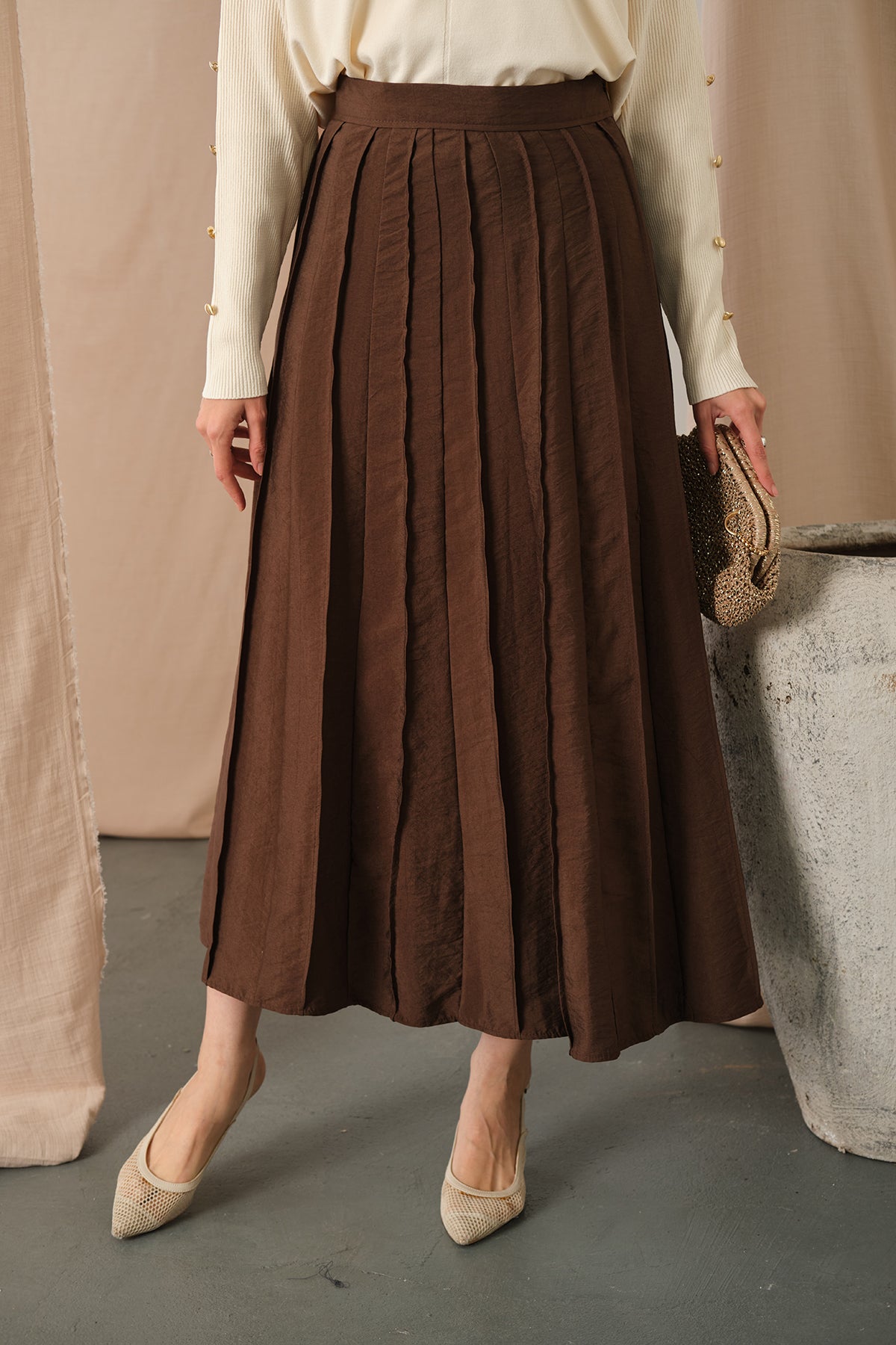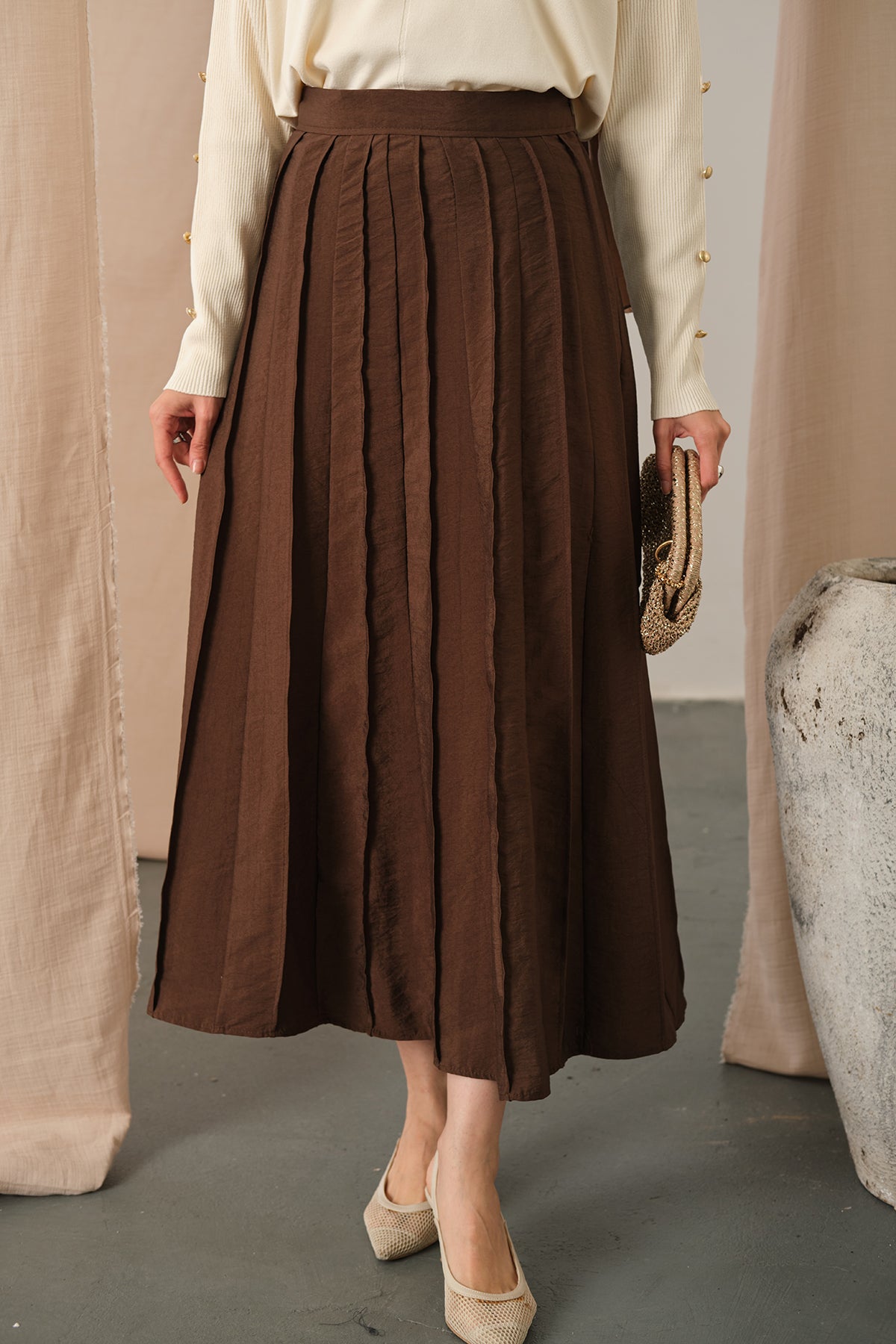 Elastic Waist Pleated Skirt Brown
