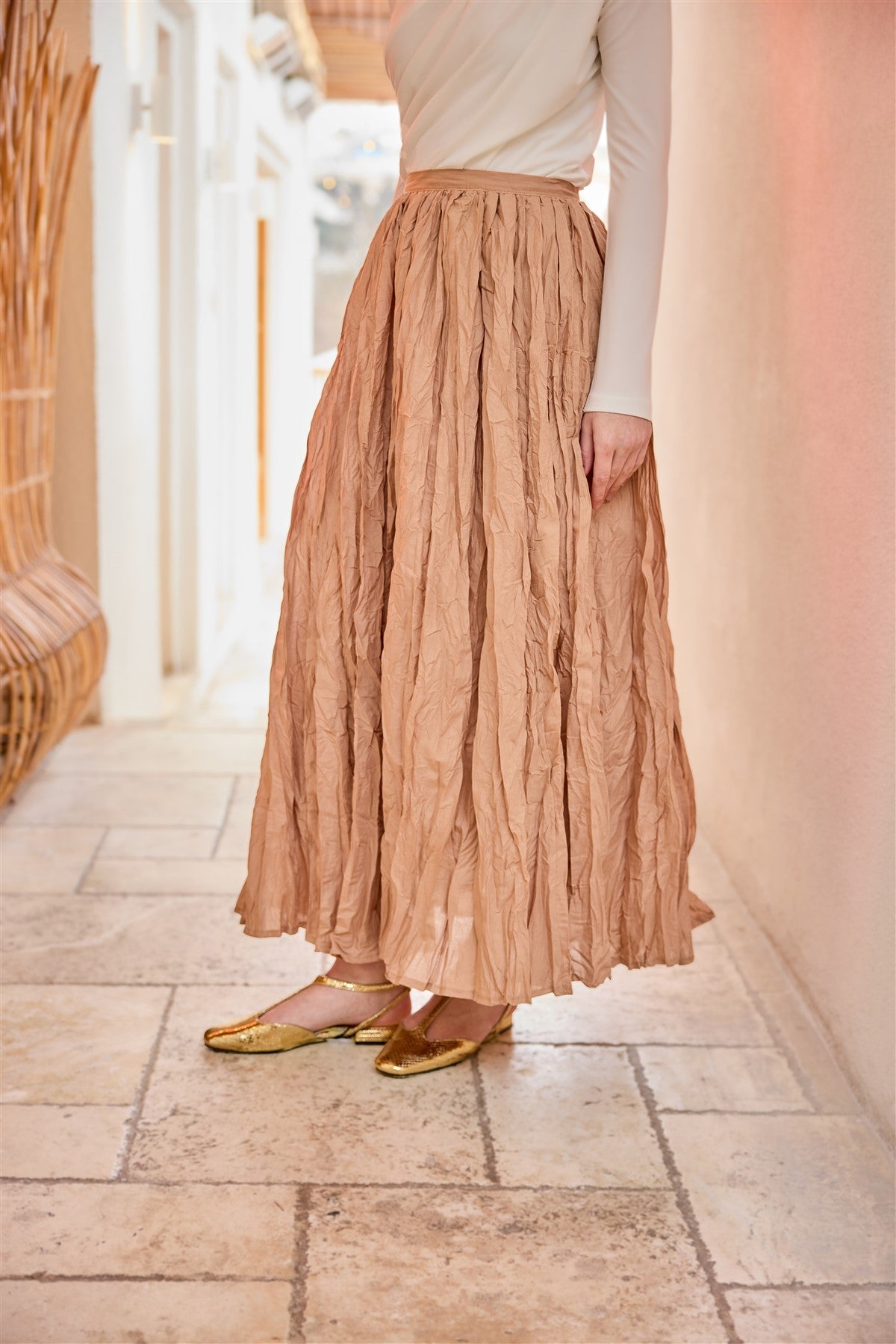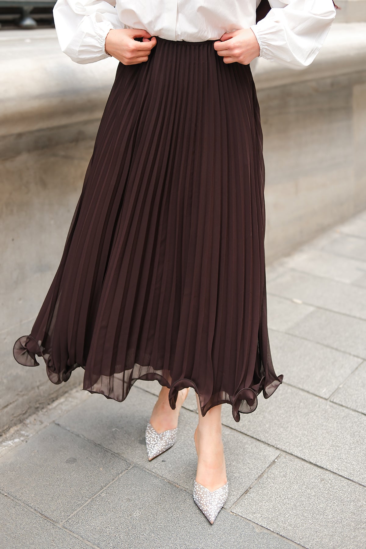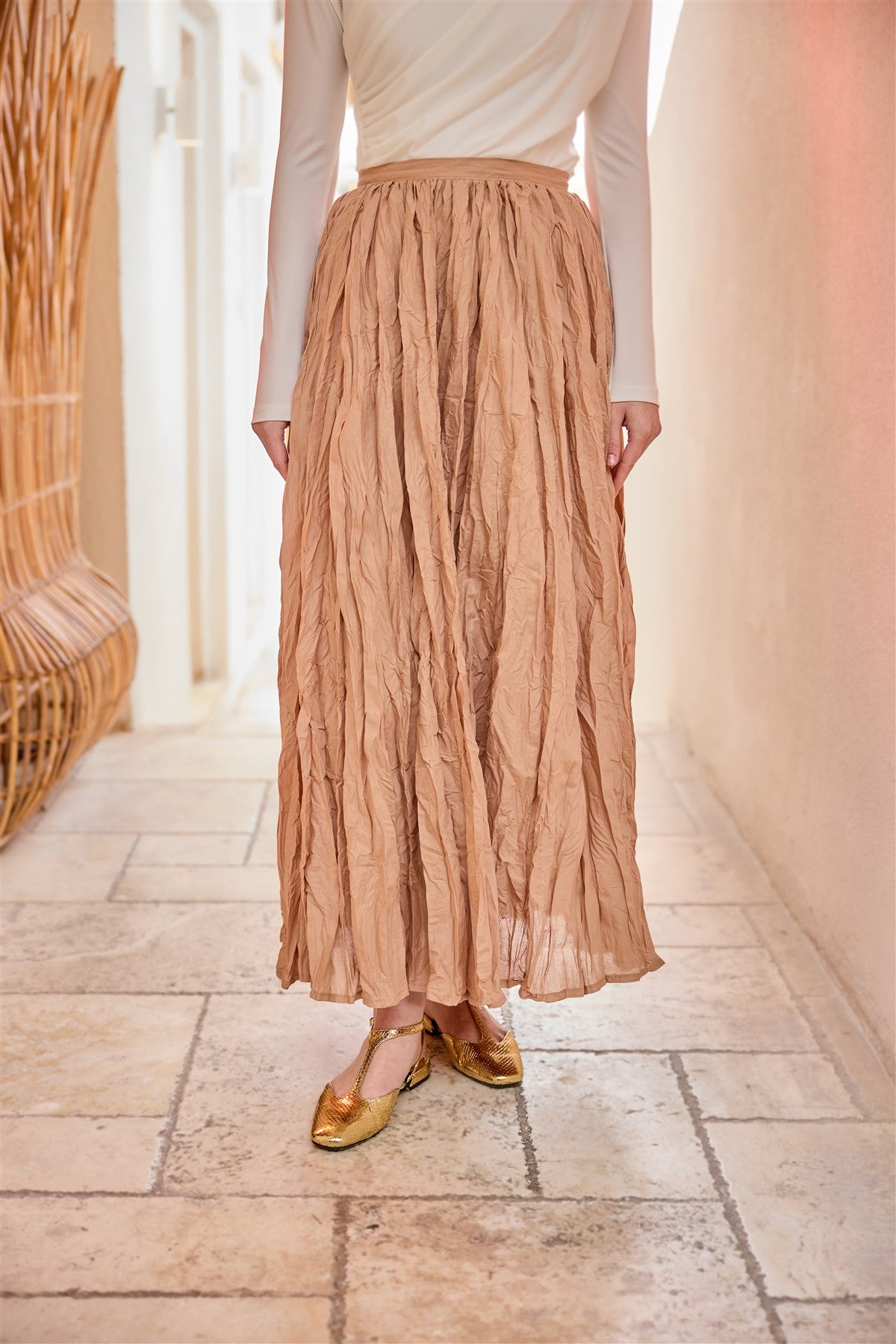 Elastic Waist Pleated Skirt Brown