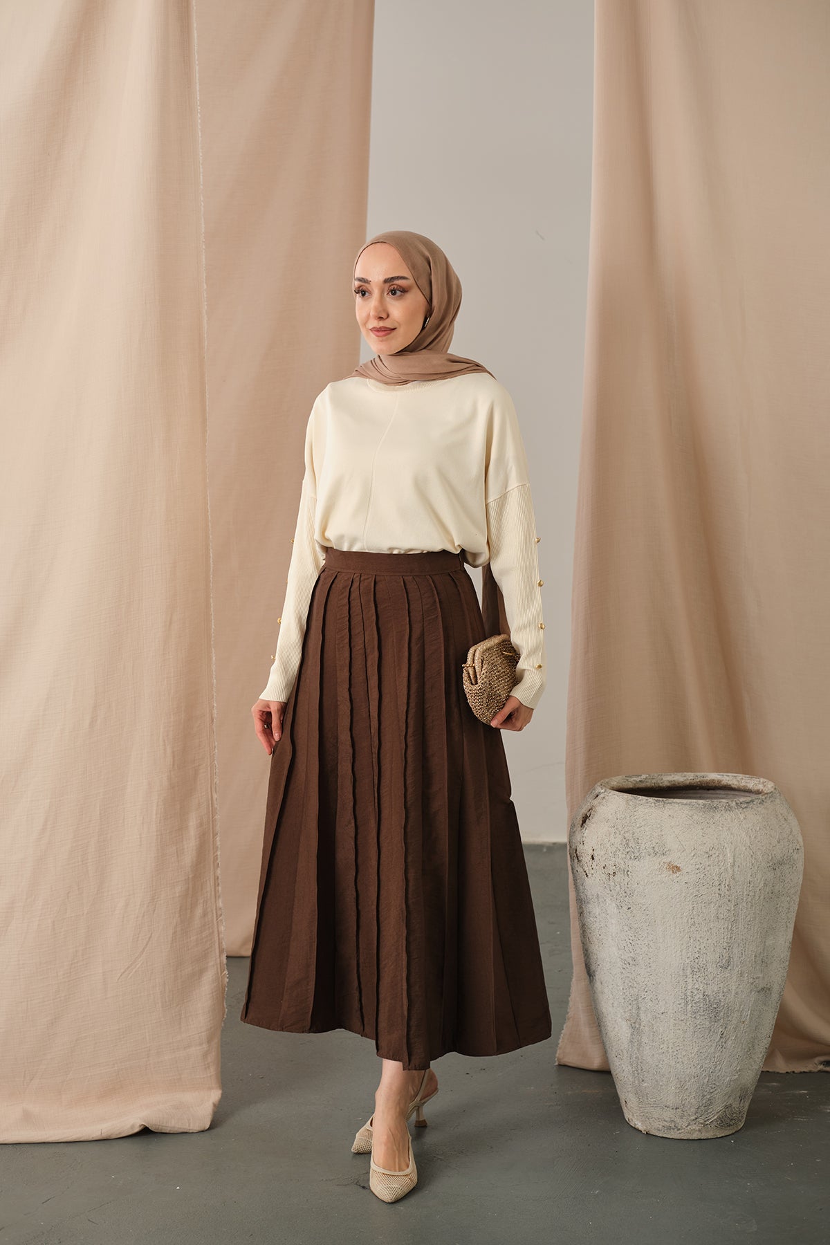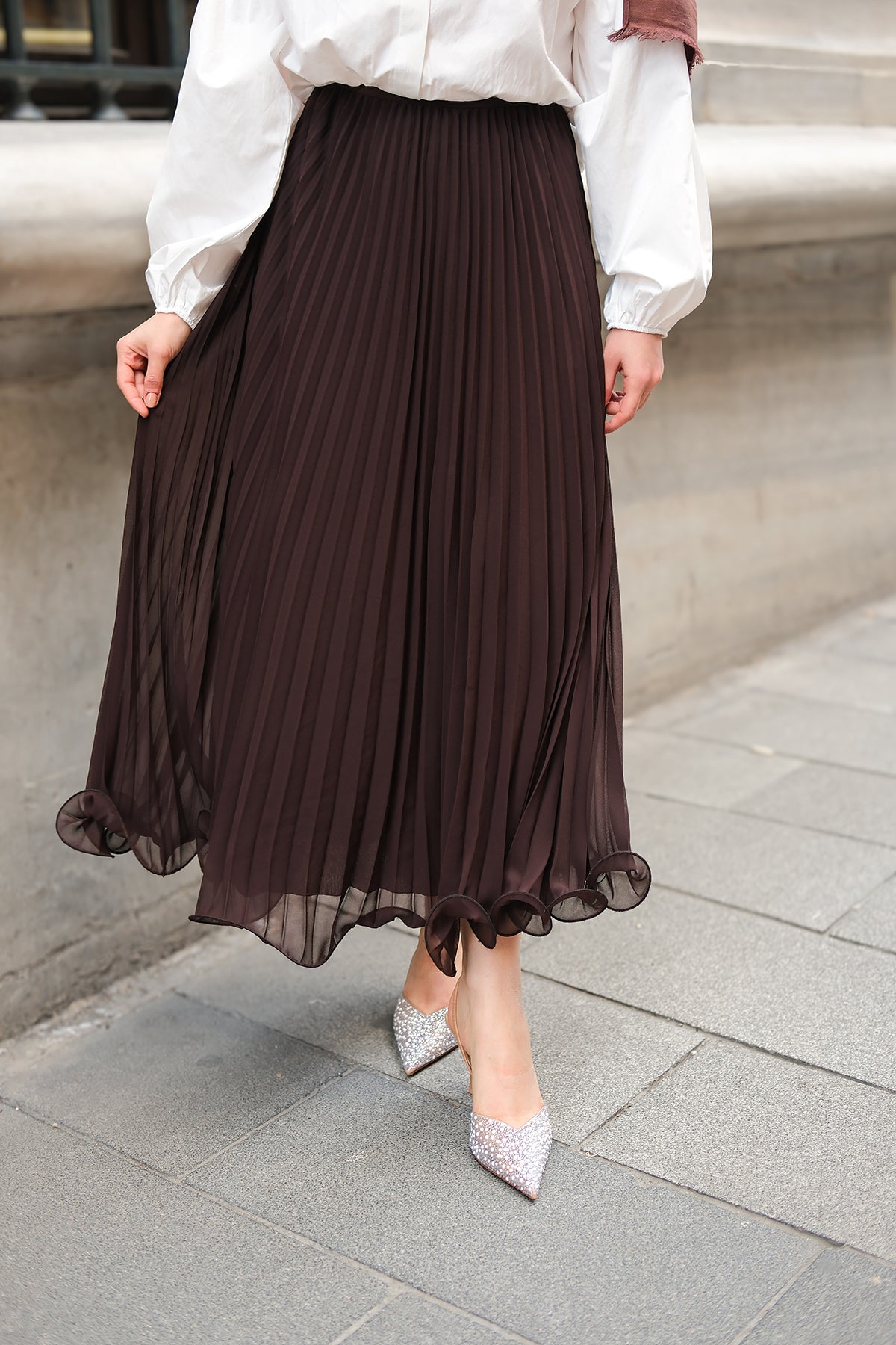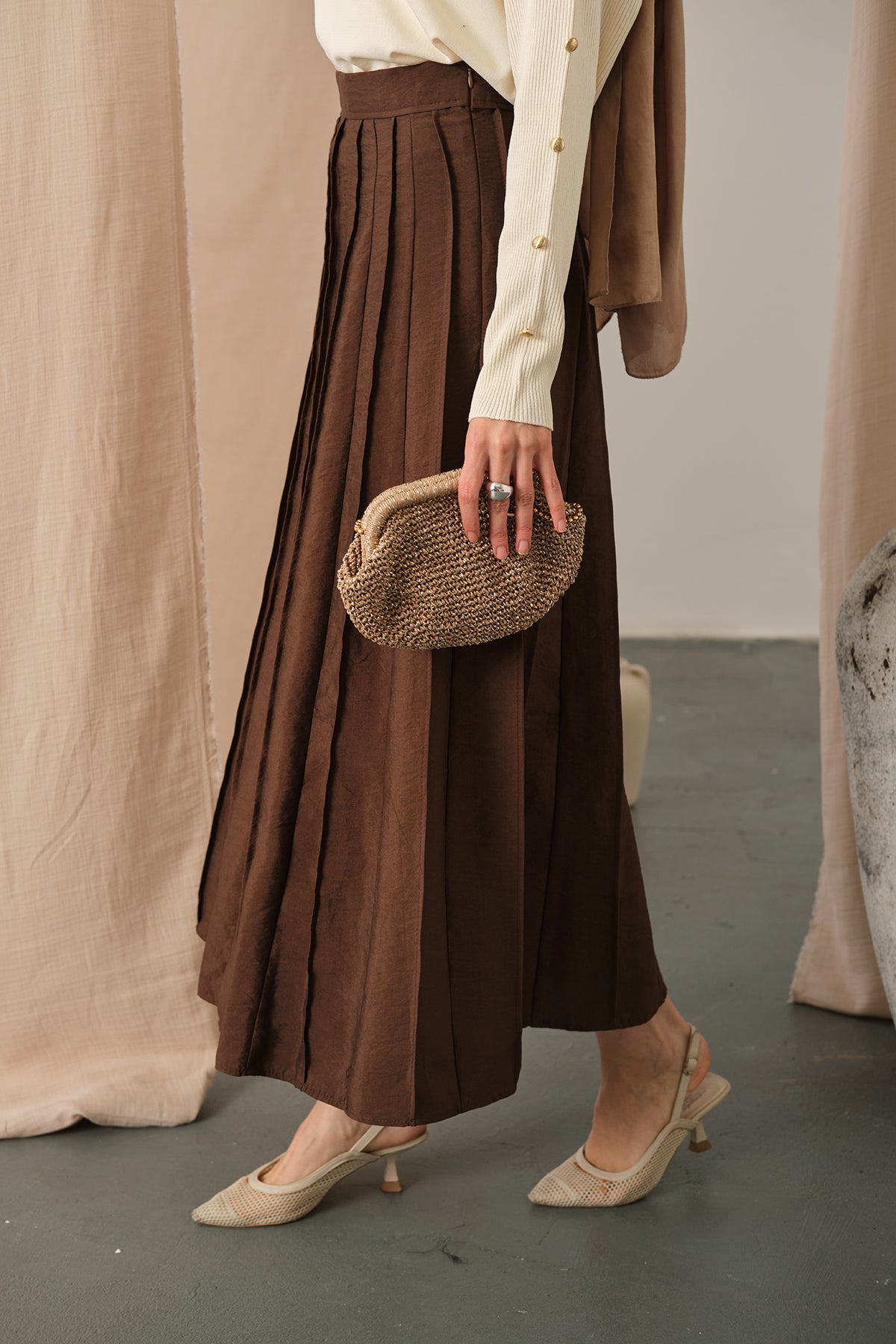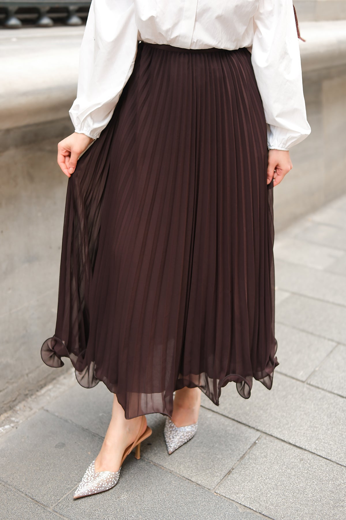 Elastic Waist Pleated Skirt Brown