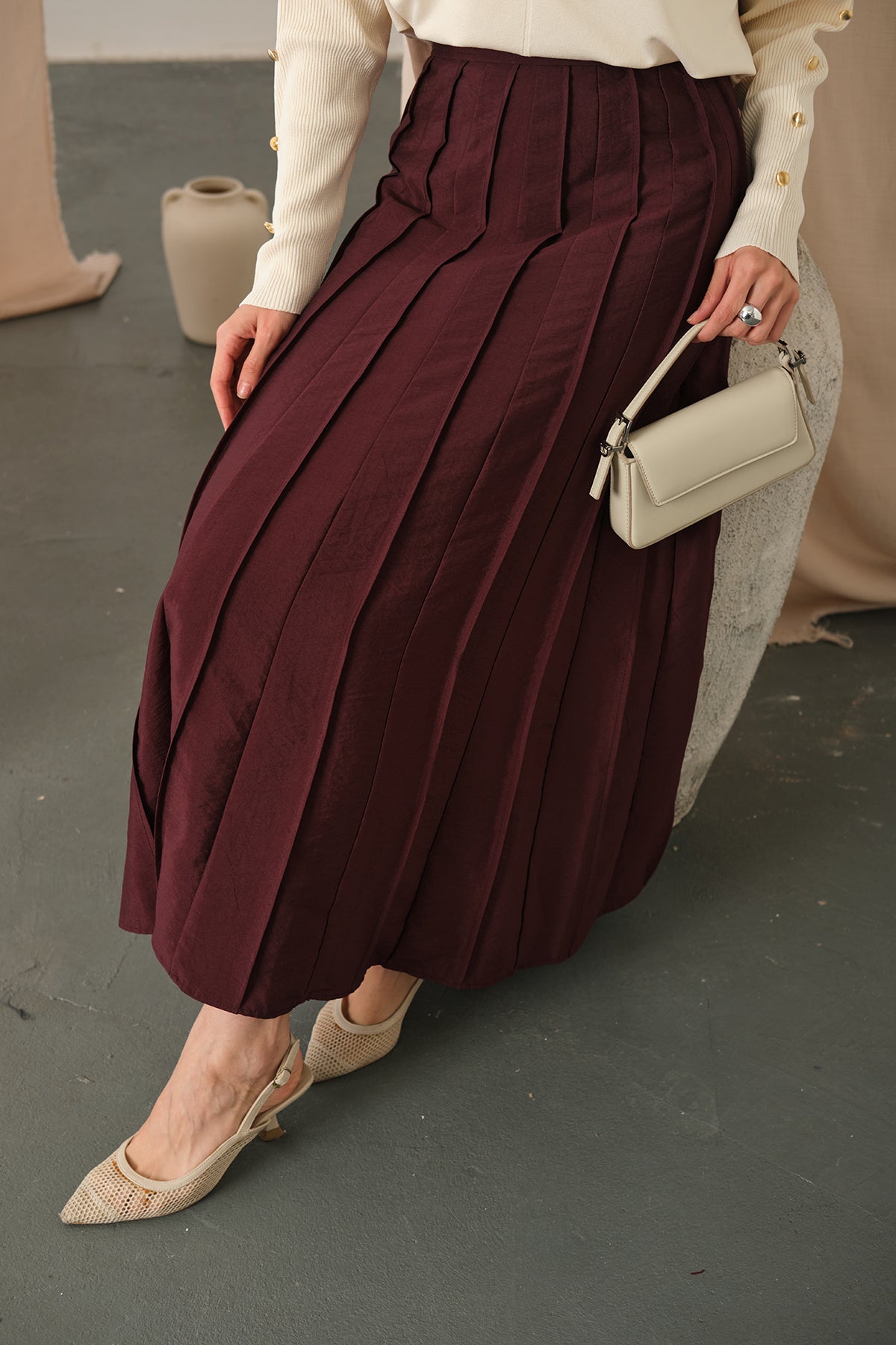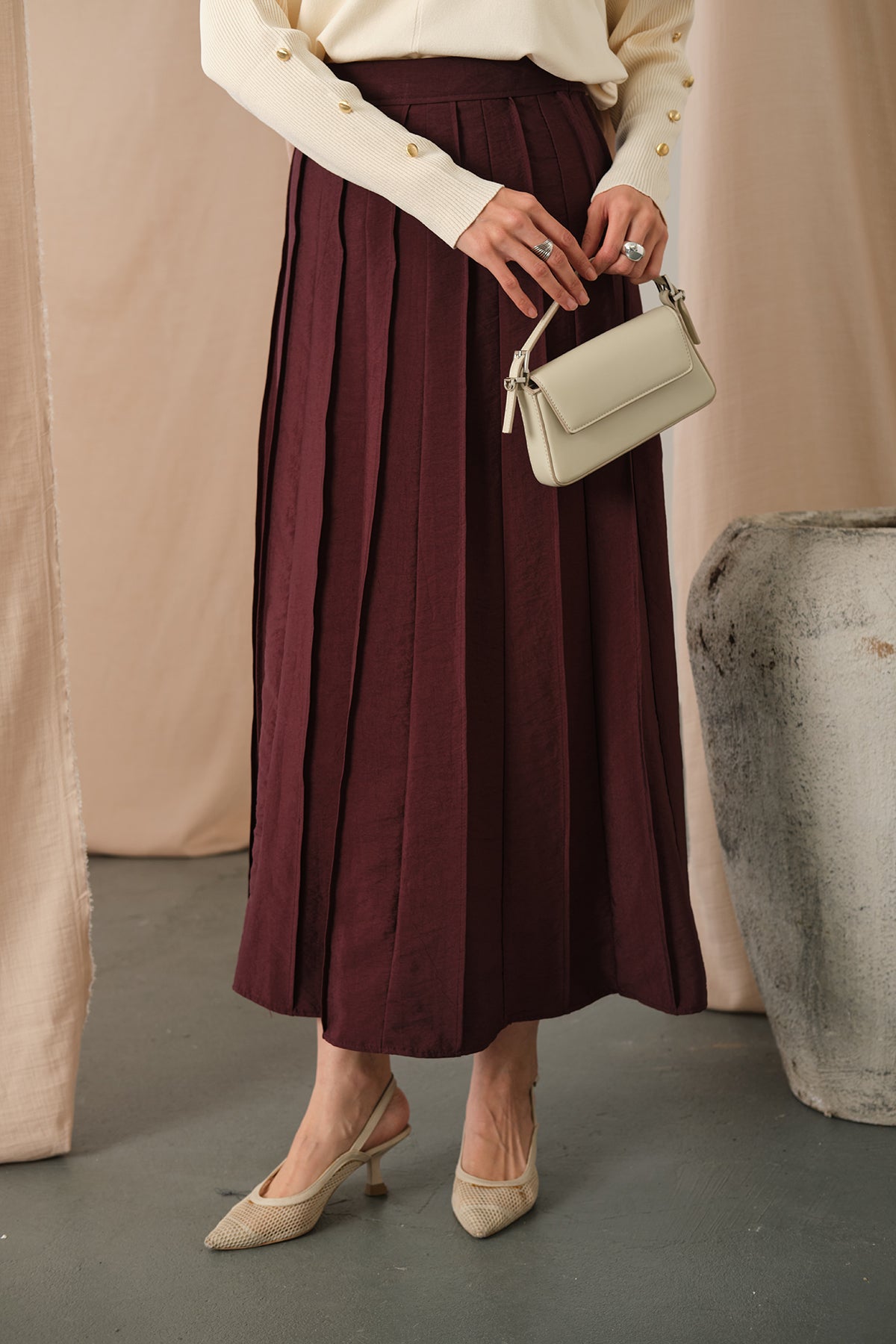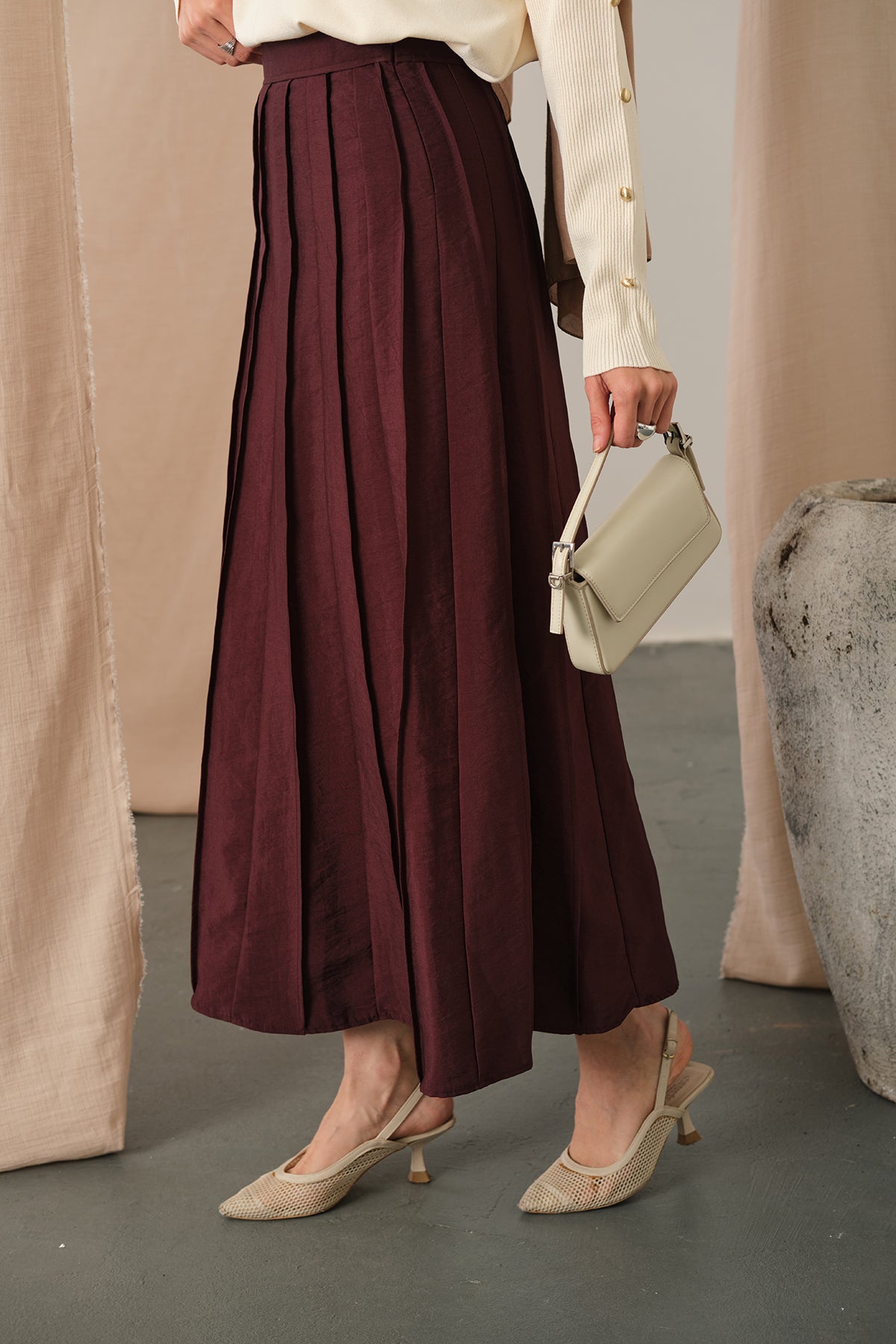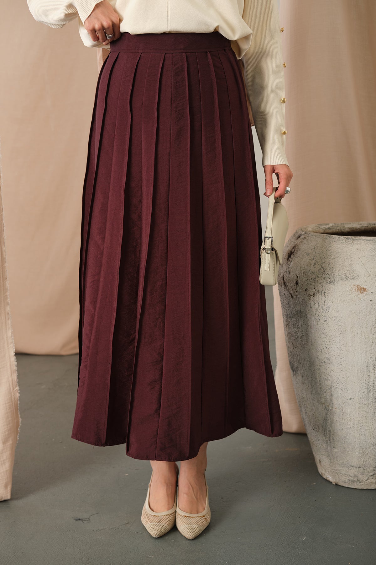 Elastic Waist Pleated Skirt Burgundy