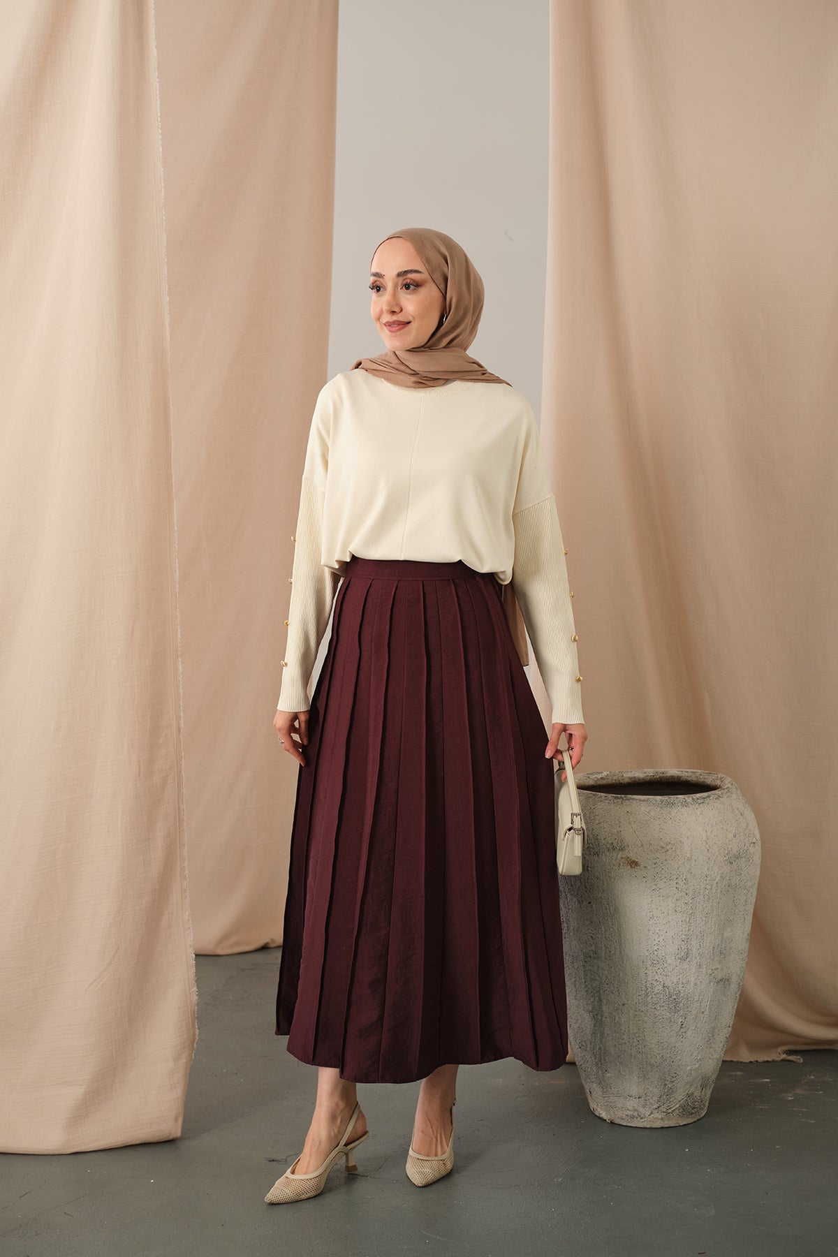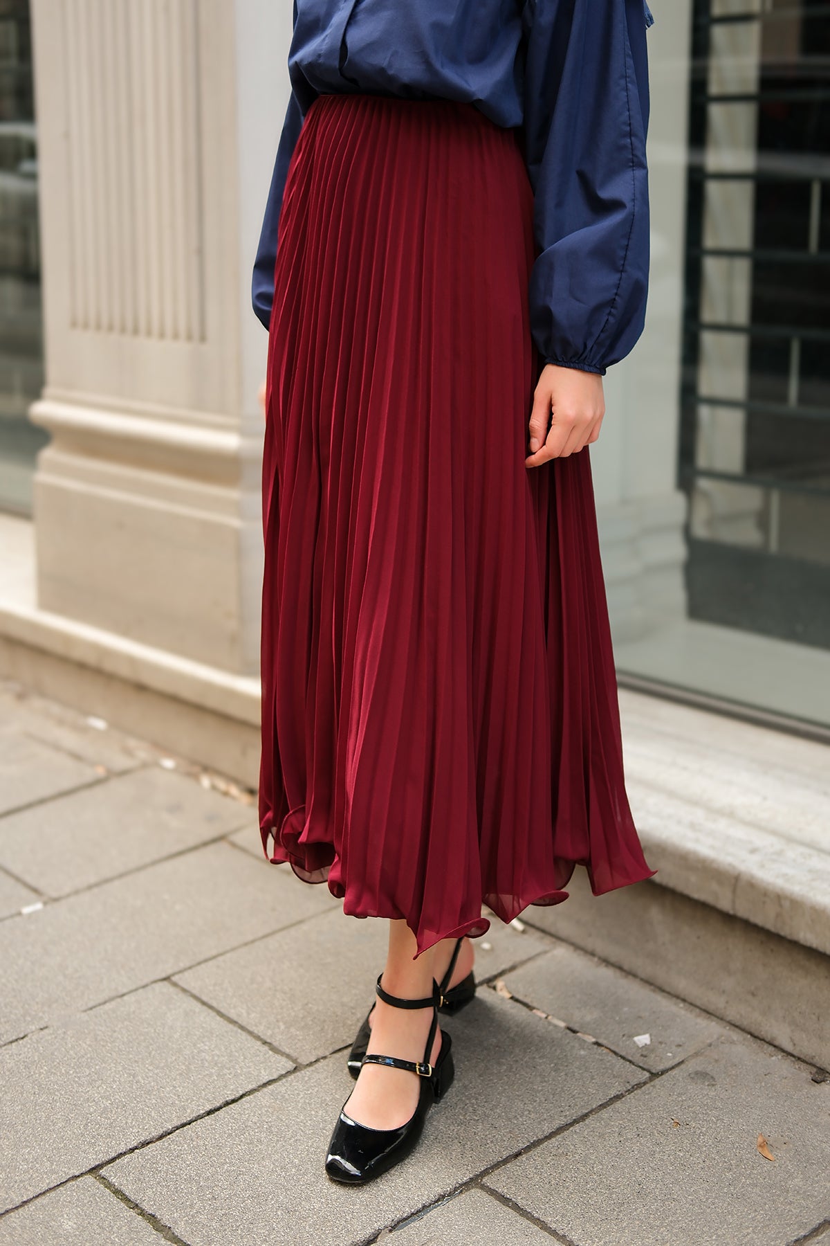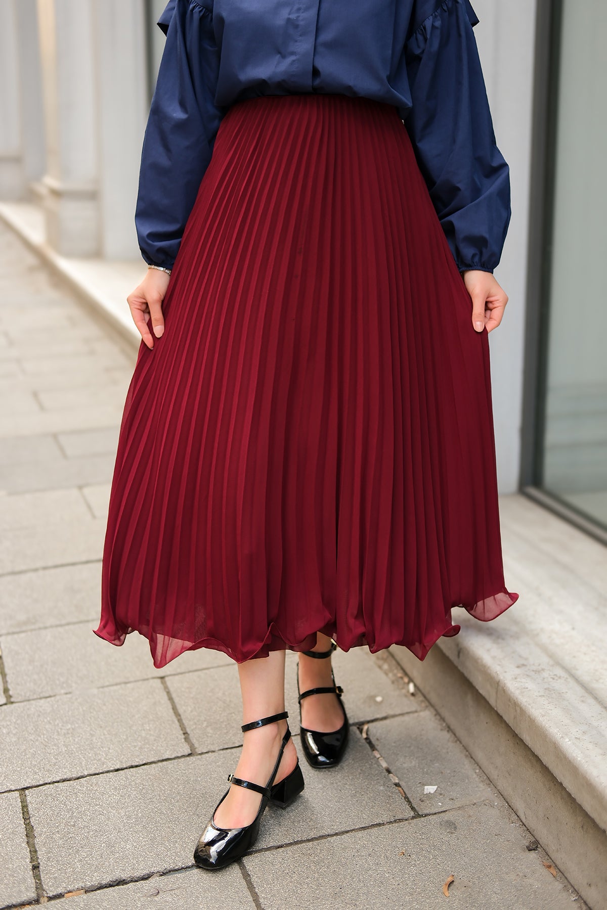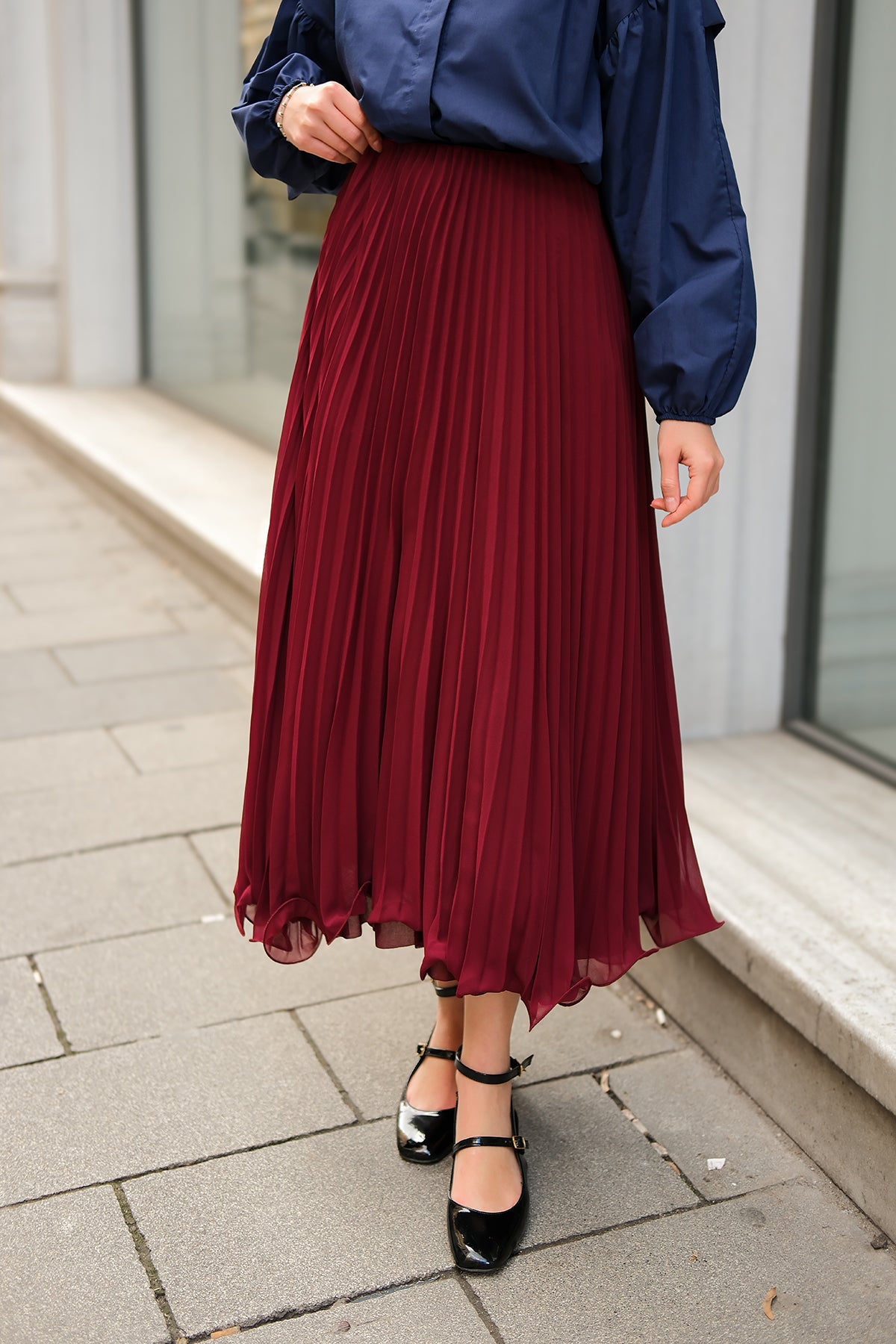 Elastic Waist Pleated Skirt Burgundy