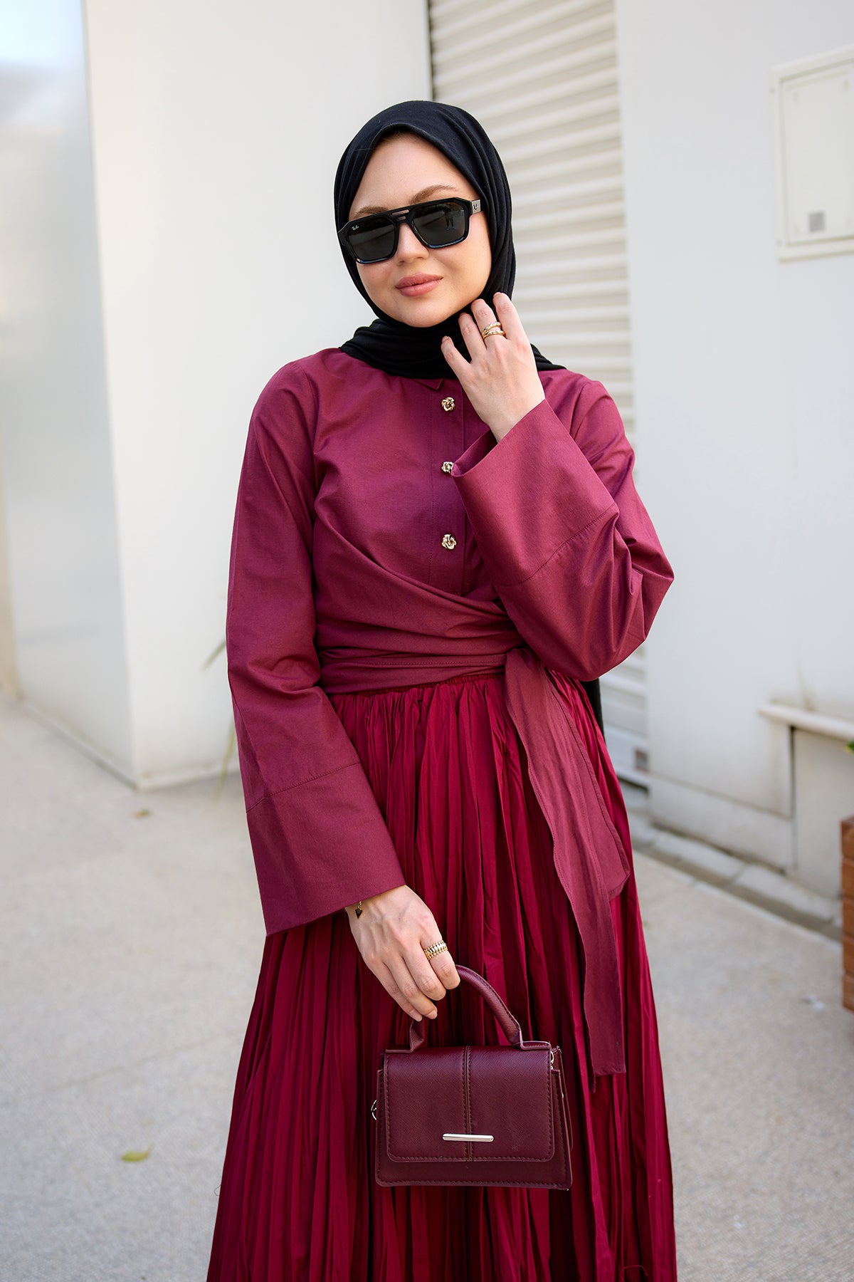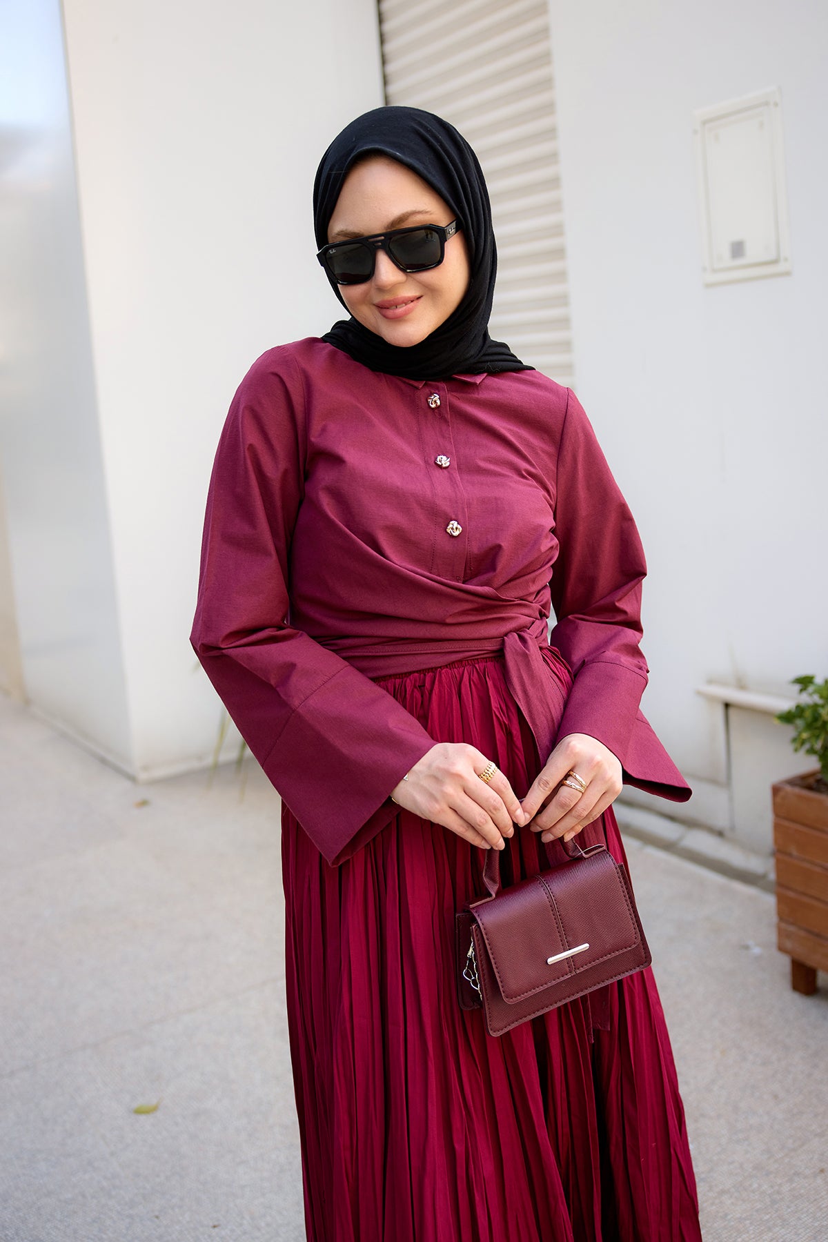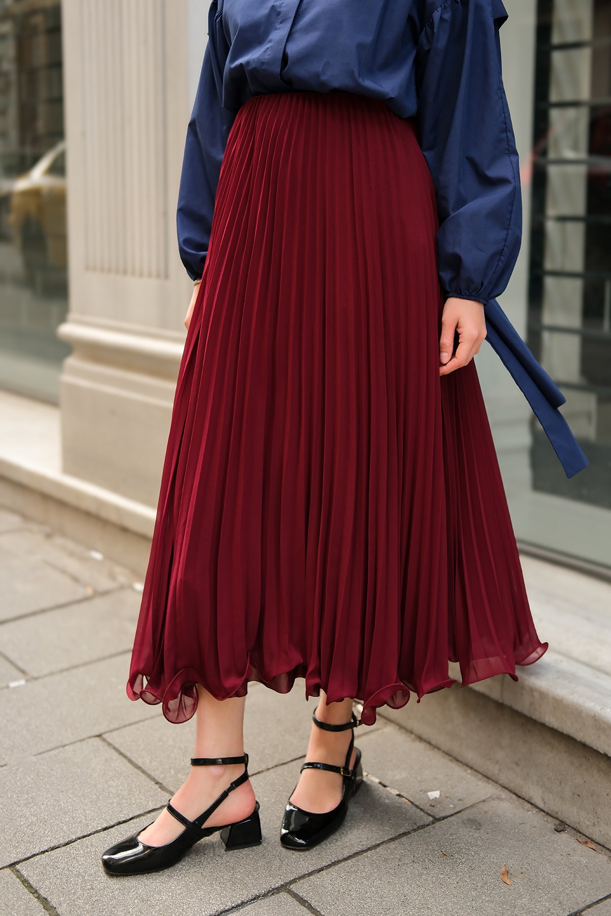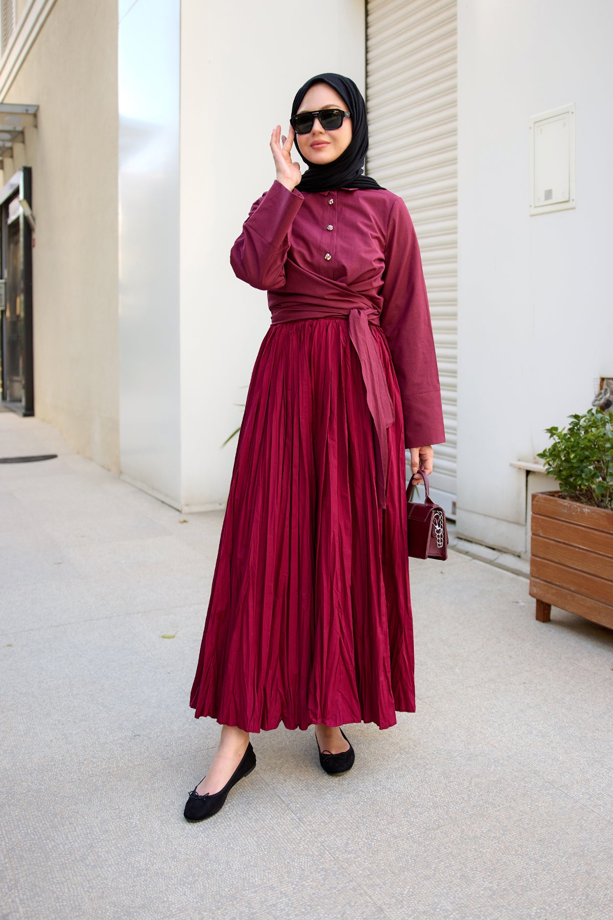Elastic Waist Pleated Skirt Burgundy