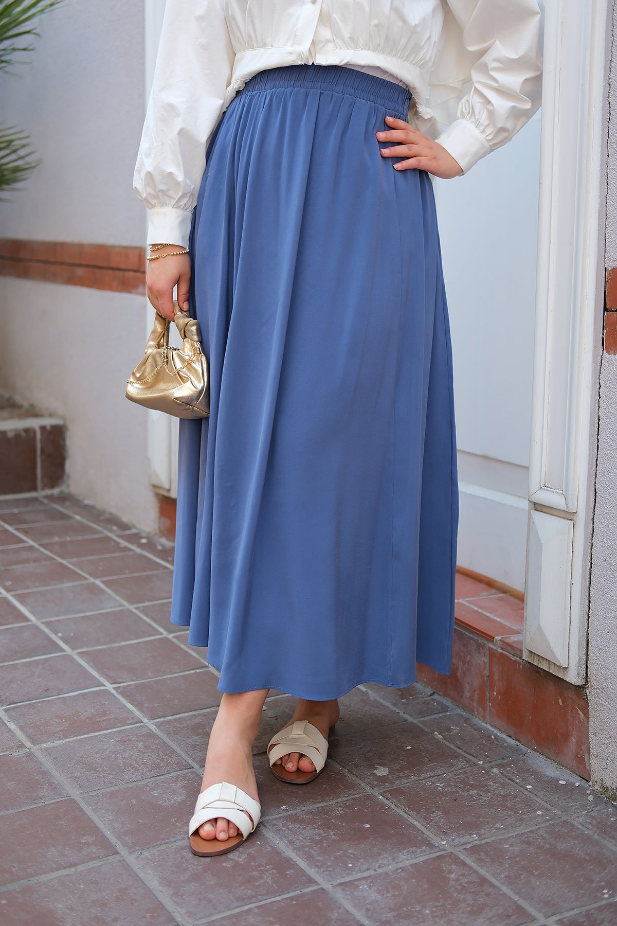 Elastic Waist Crushed Skirt Indigo Blue