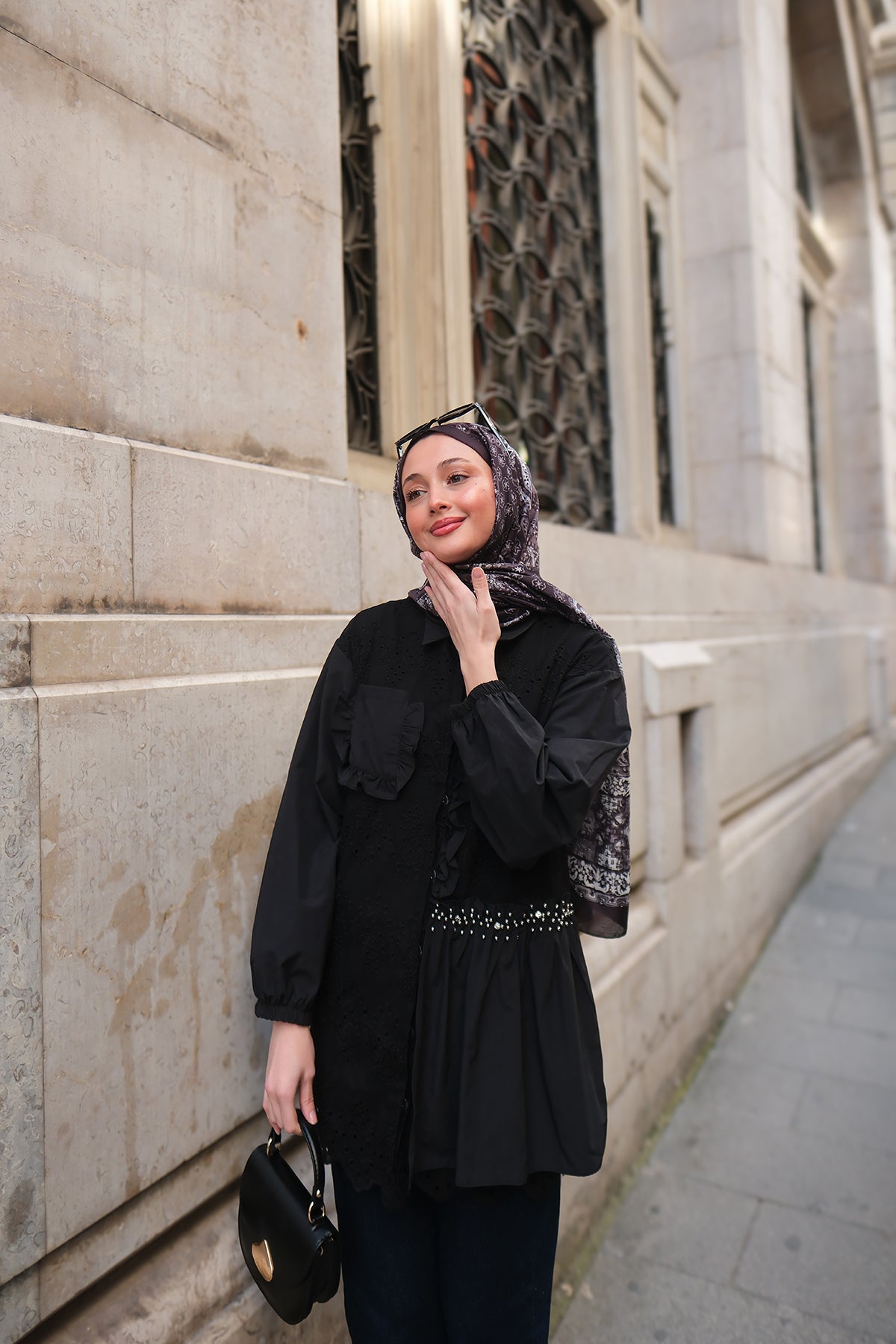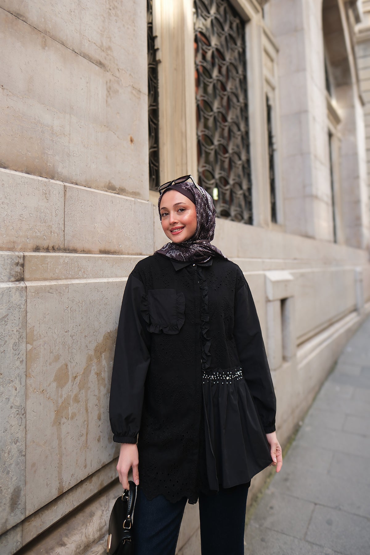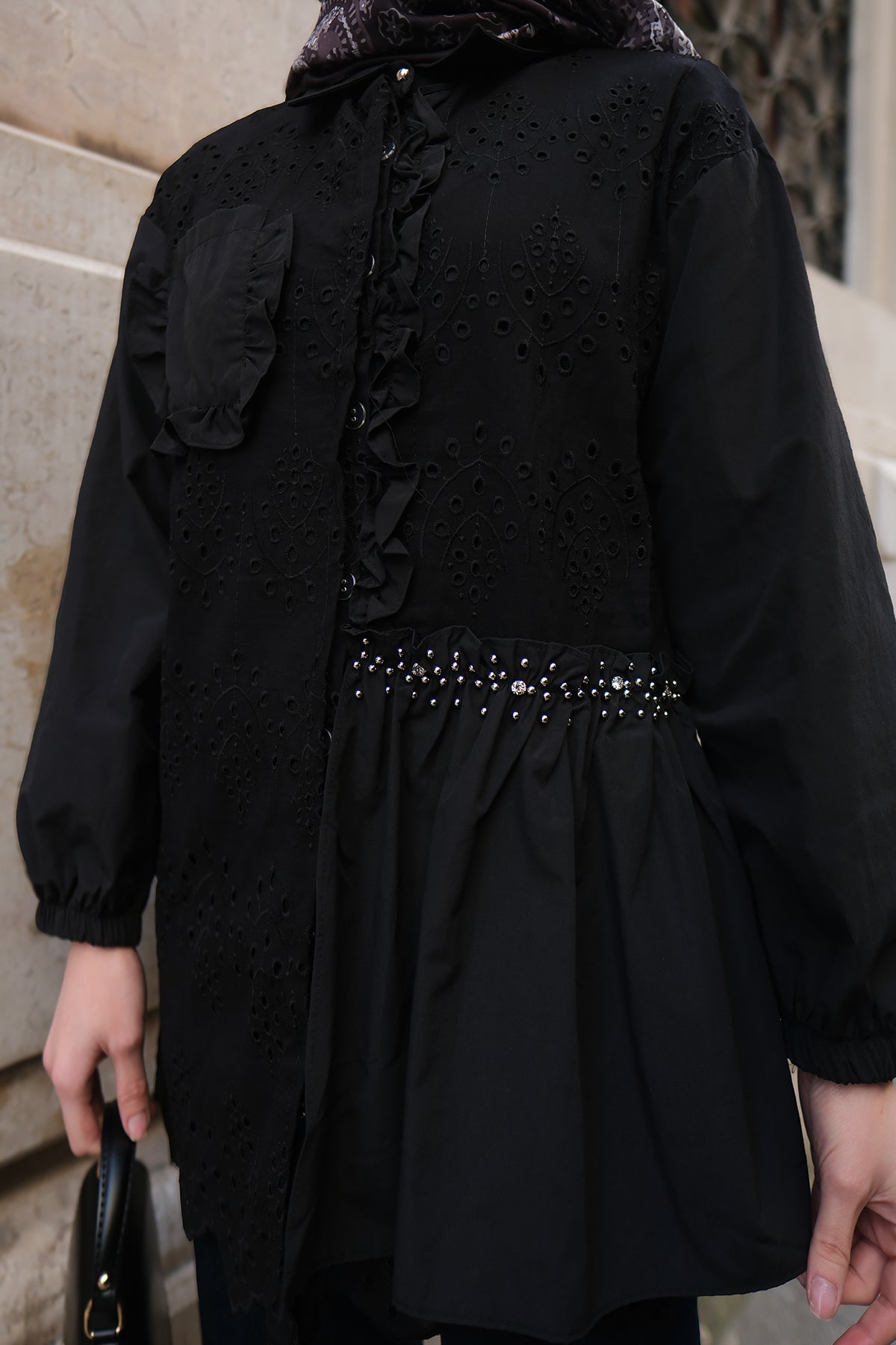 Black Shirt with Embroidered Detail and Semi-Stone Accents