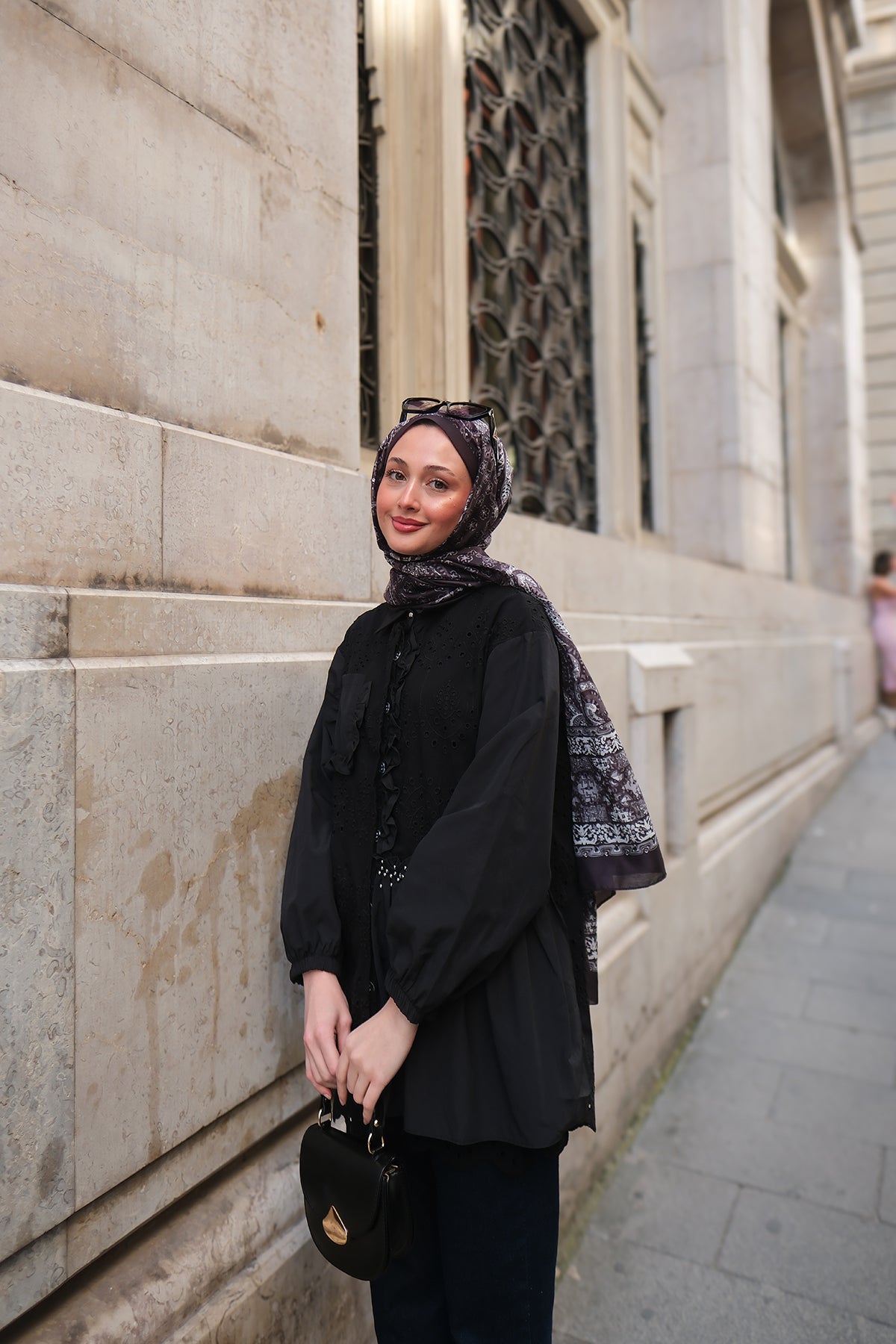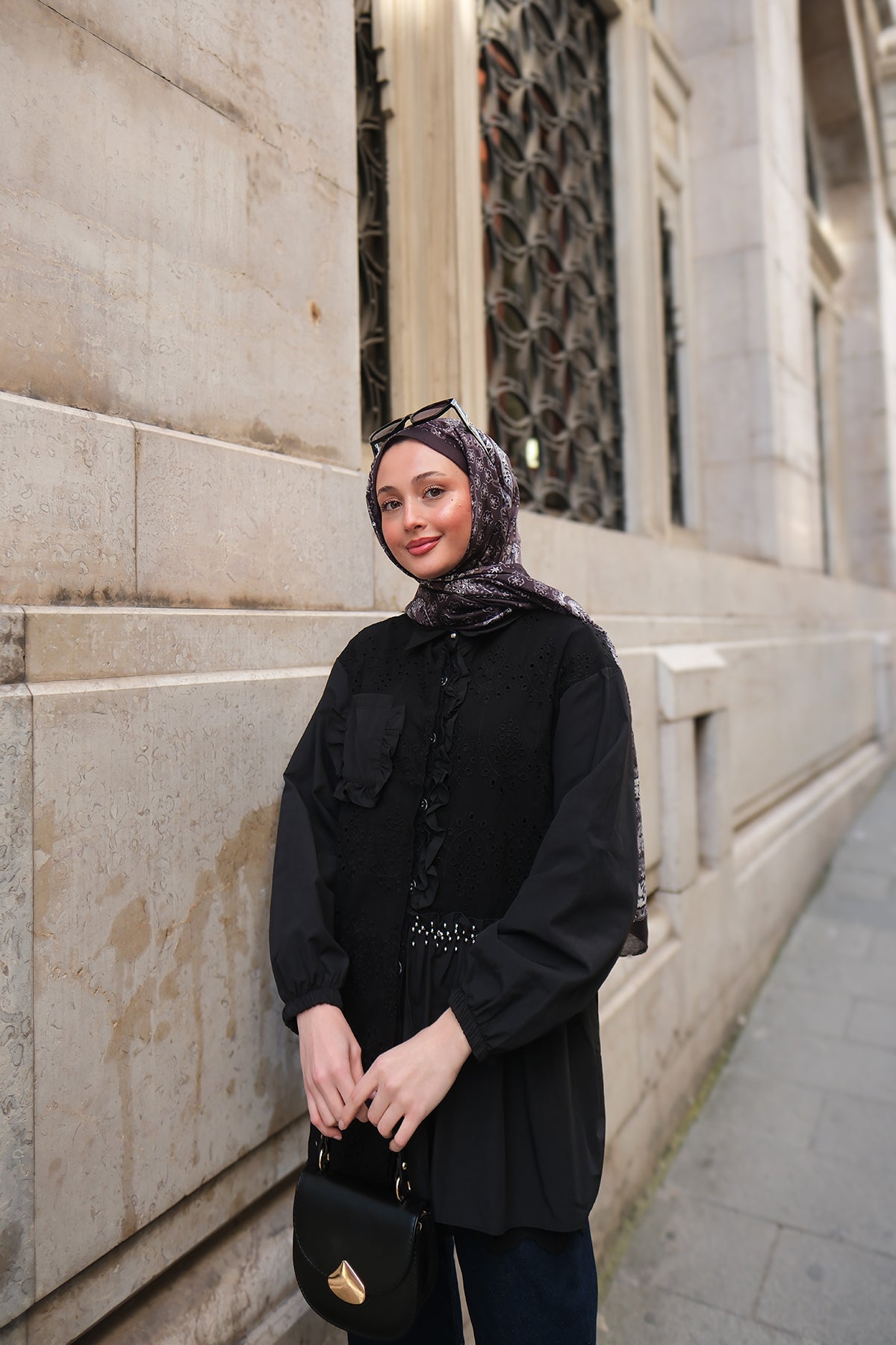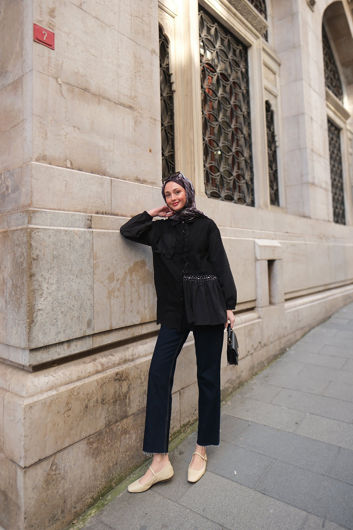 Black Shirt with Embroidered Detail and Semi-Stone Accents