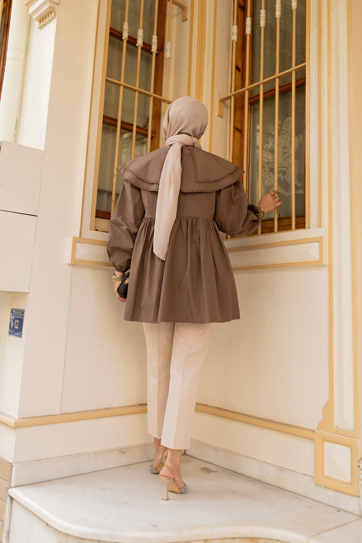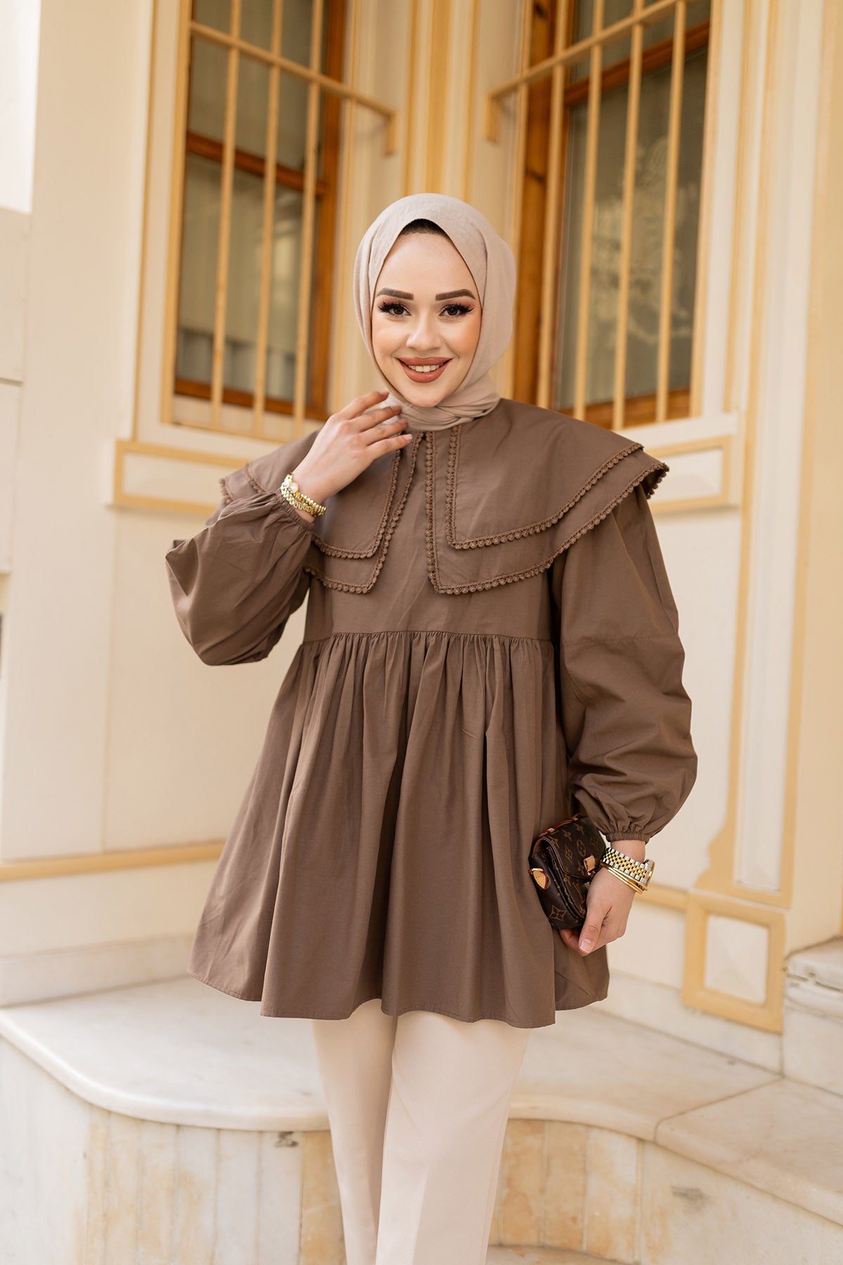 Brown Shirt with Double Collar and Guipure Lace