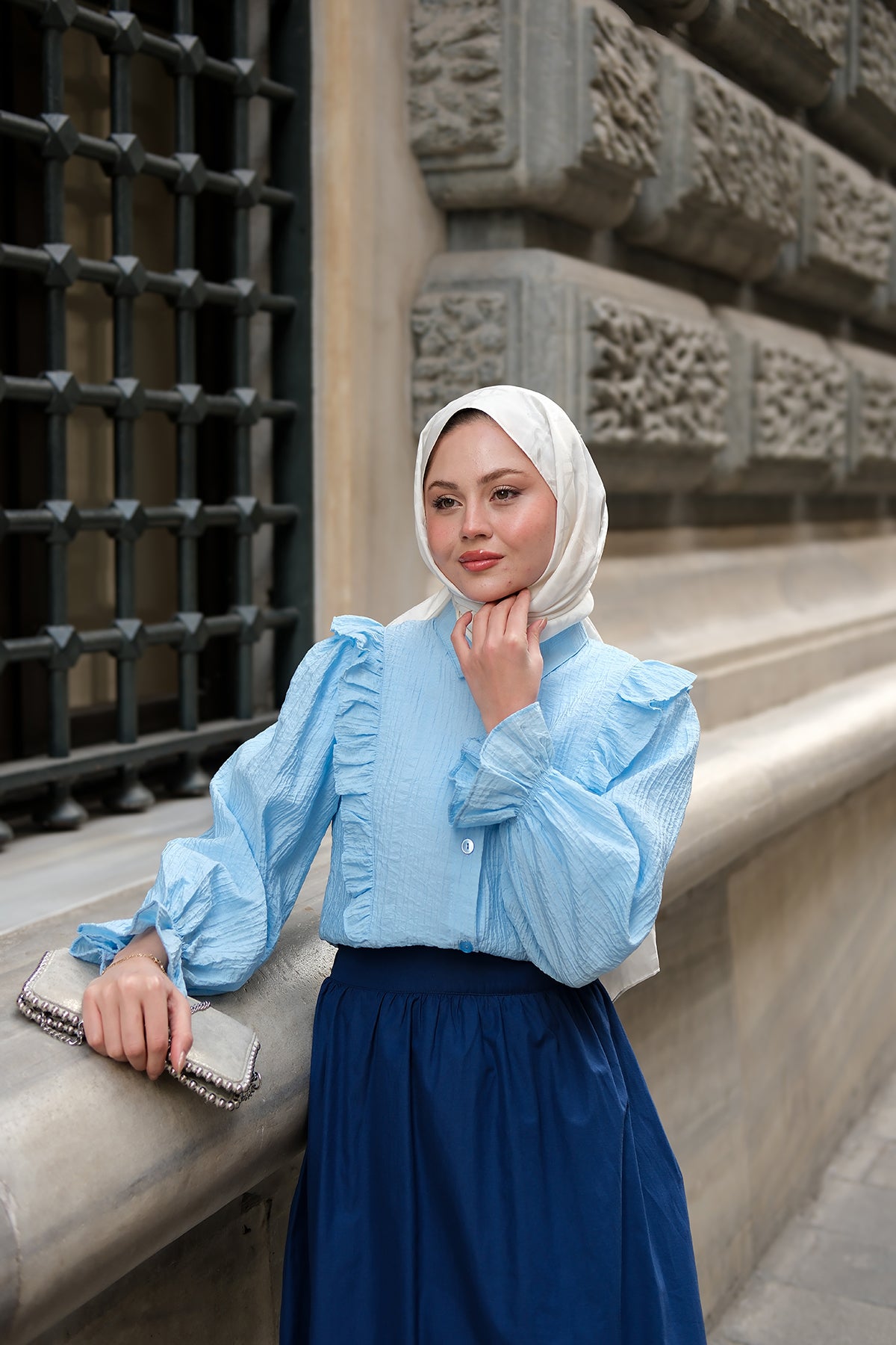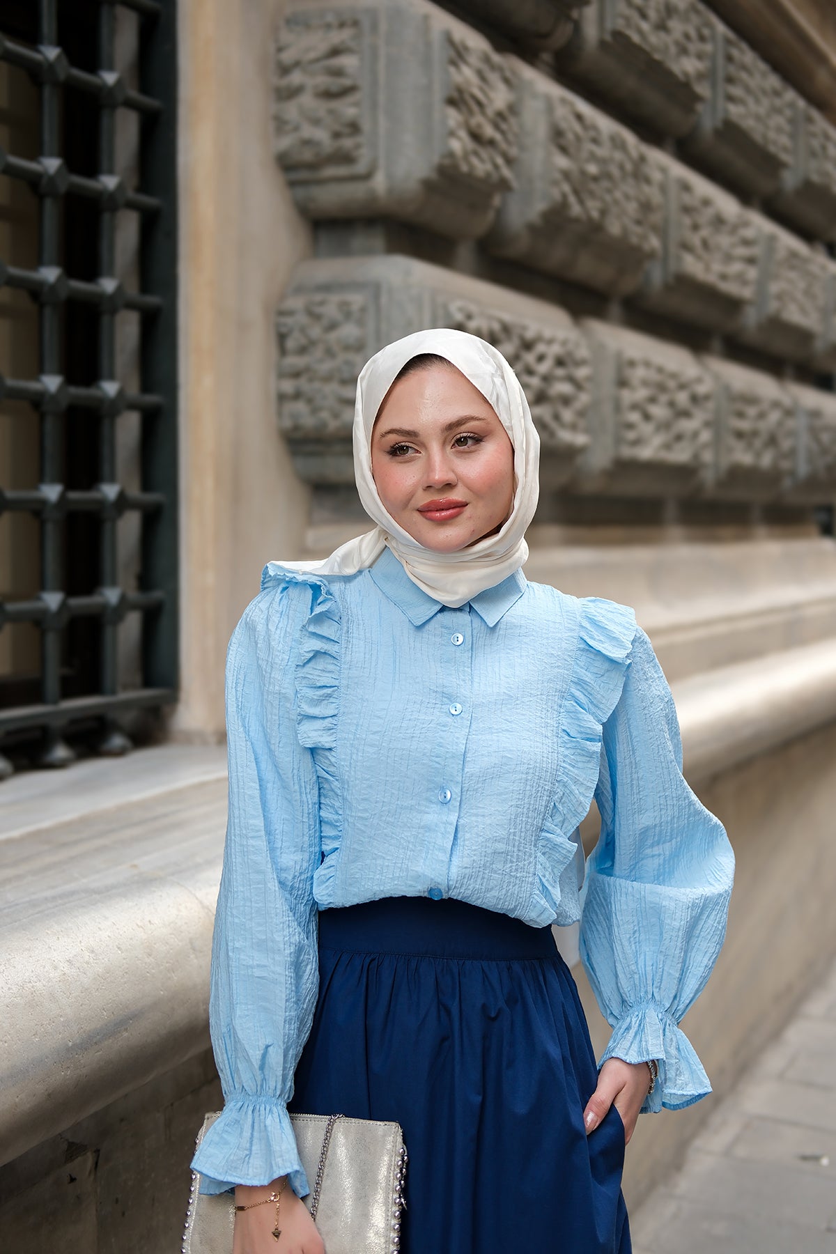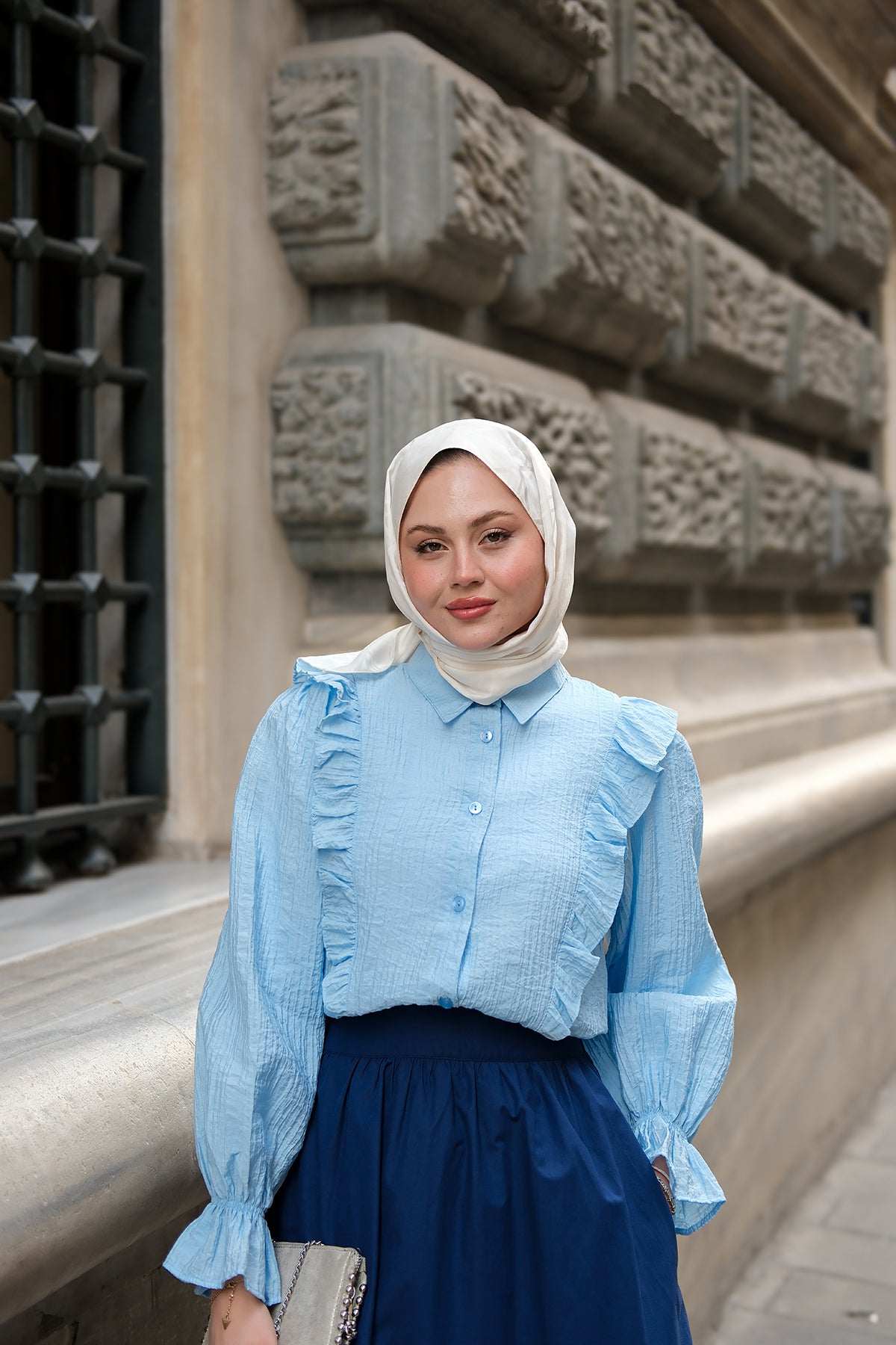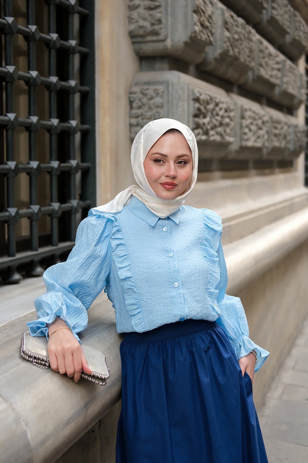 Front Ruffle Detailed Linen Shirt in Baby Blue
