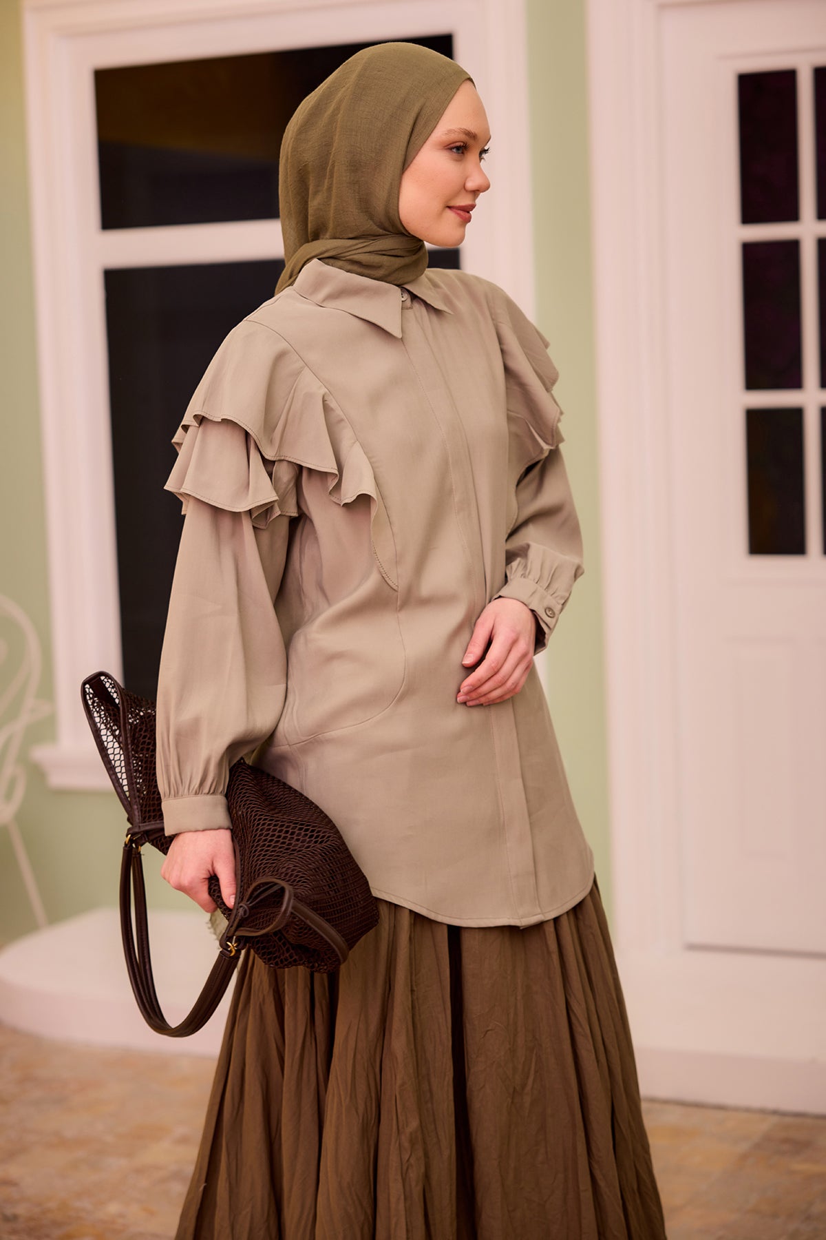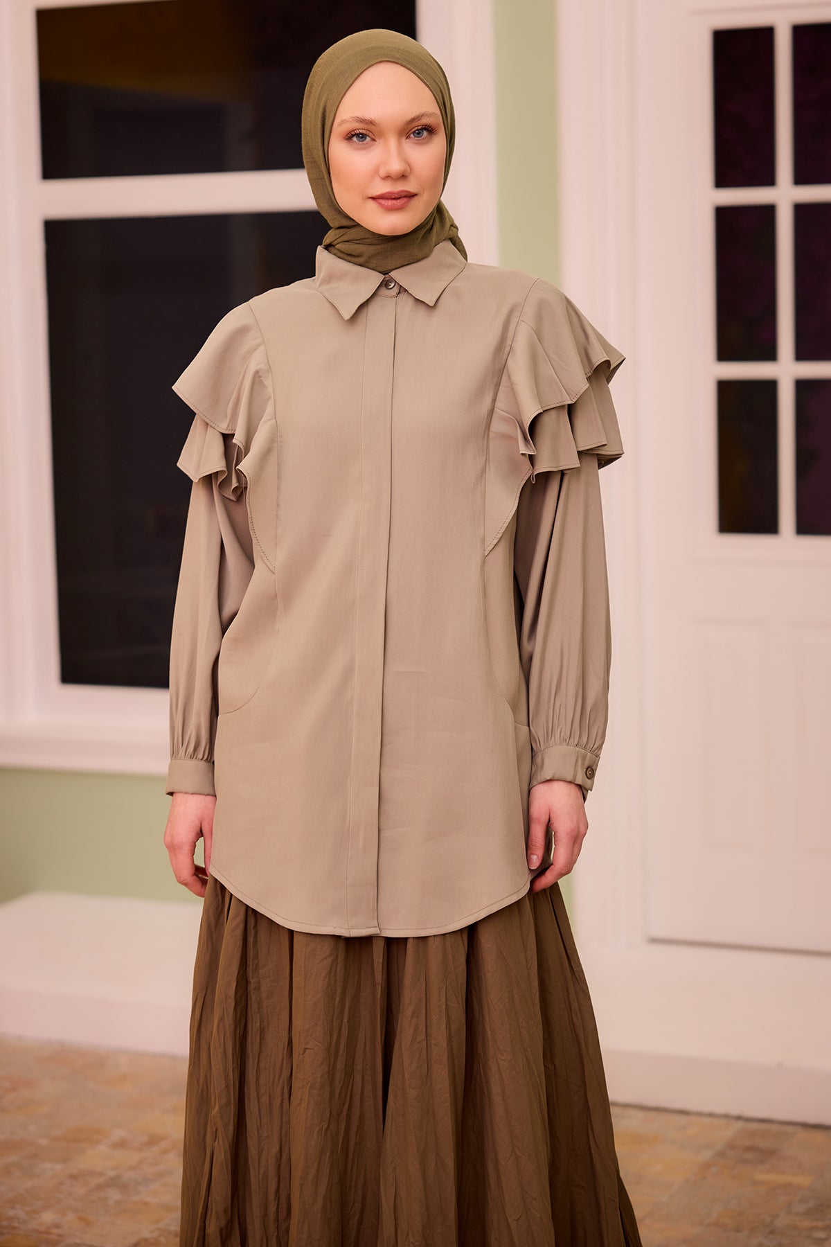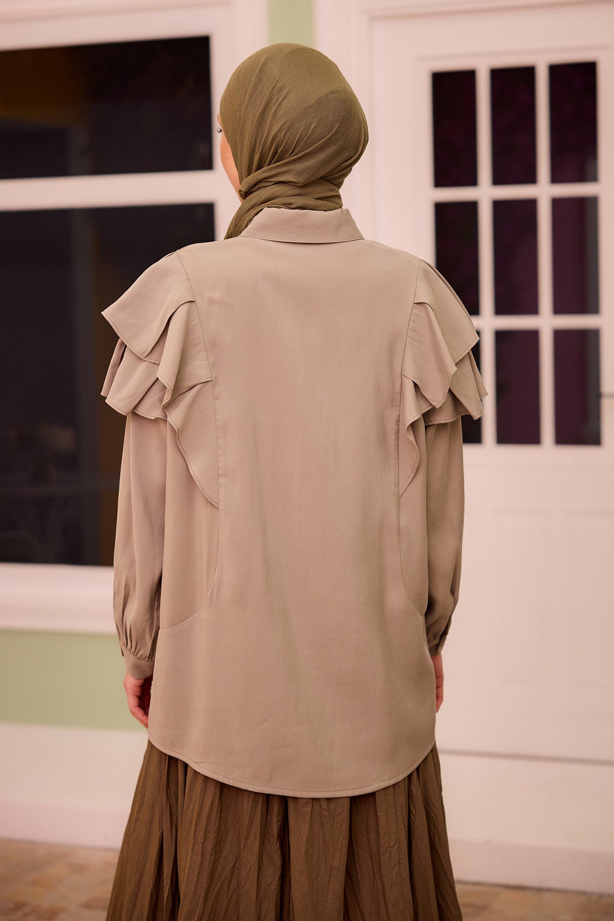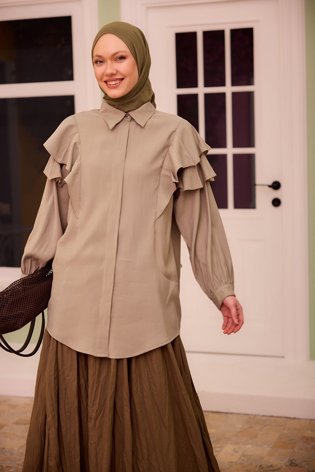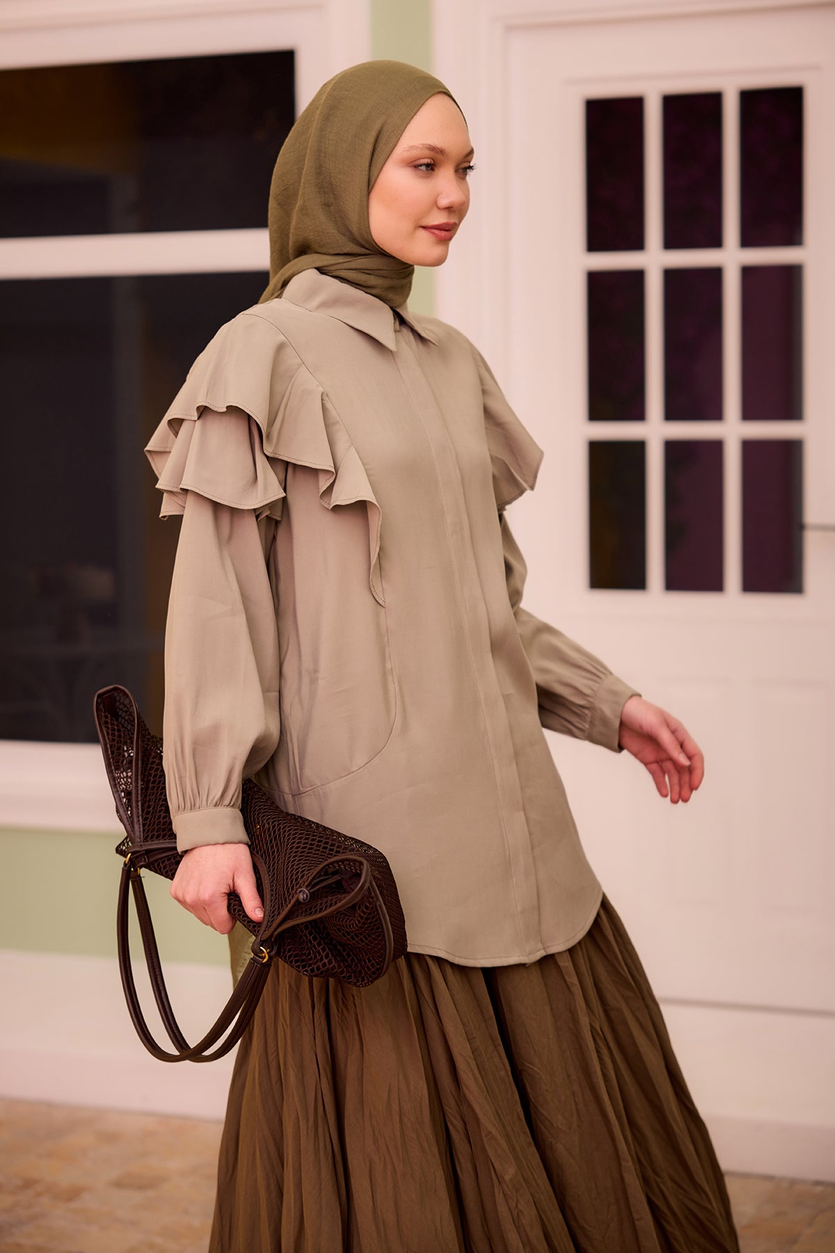 Moss Green Shirt with Ruffled Sleeves and Button Details