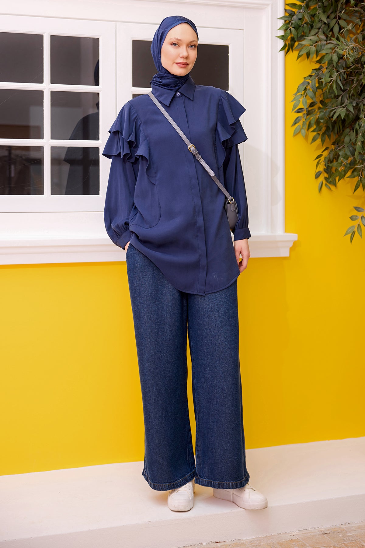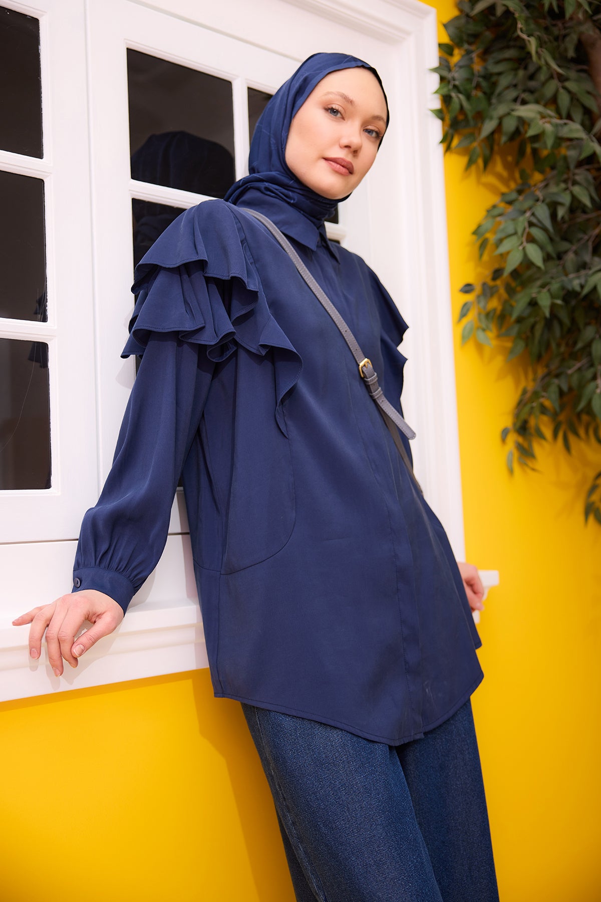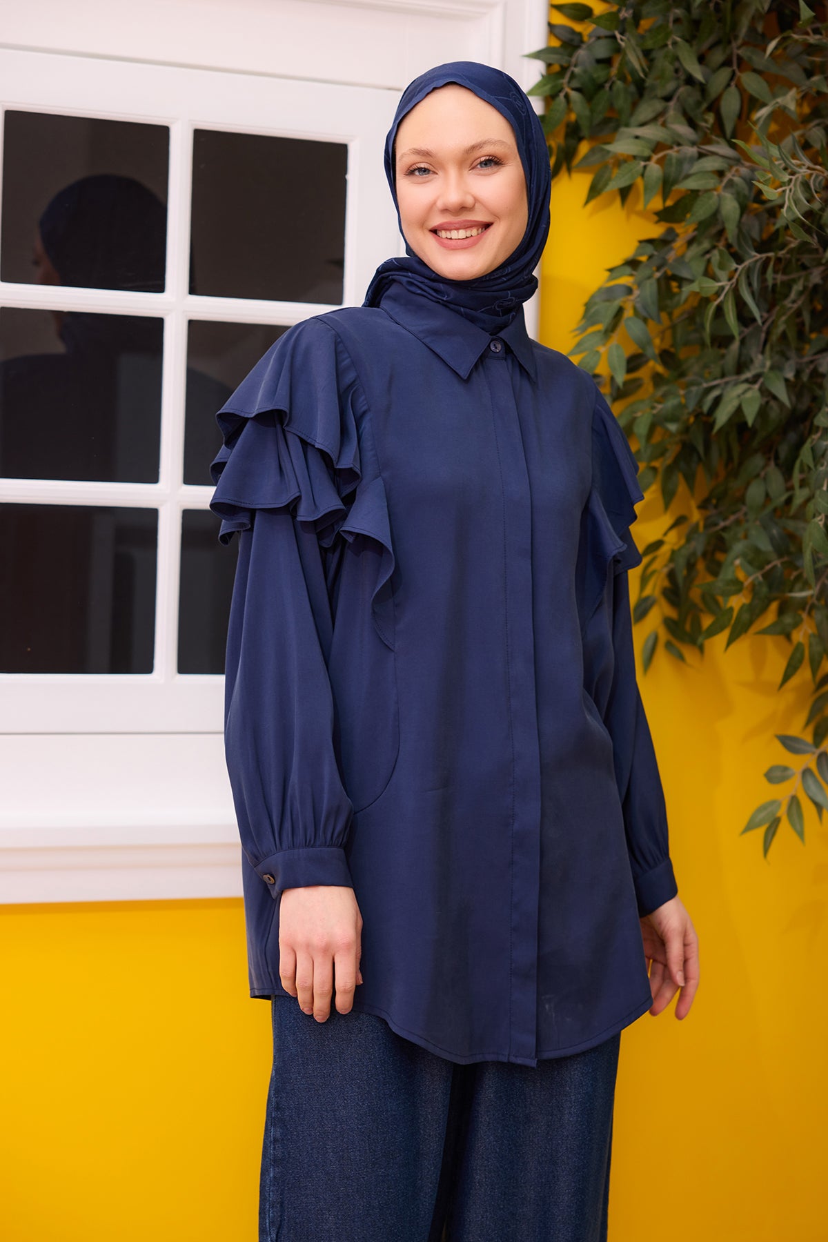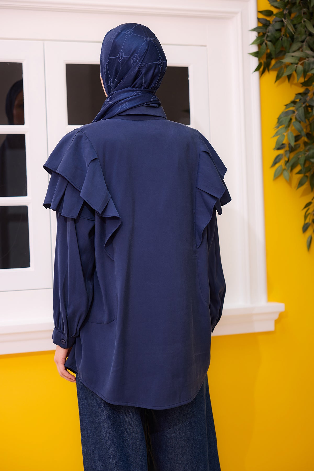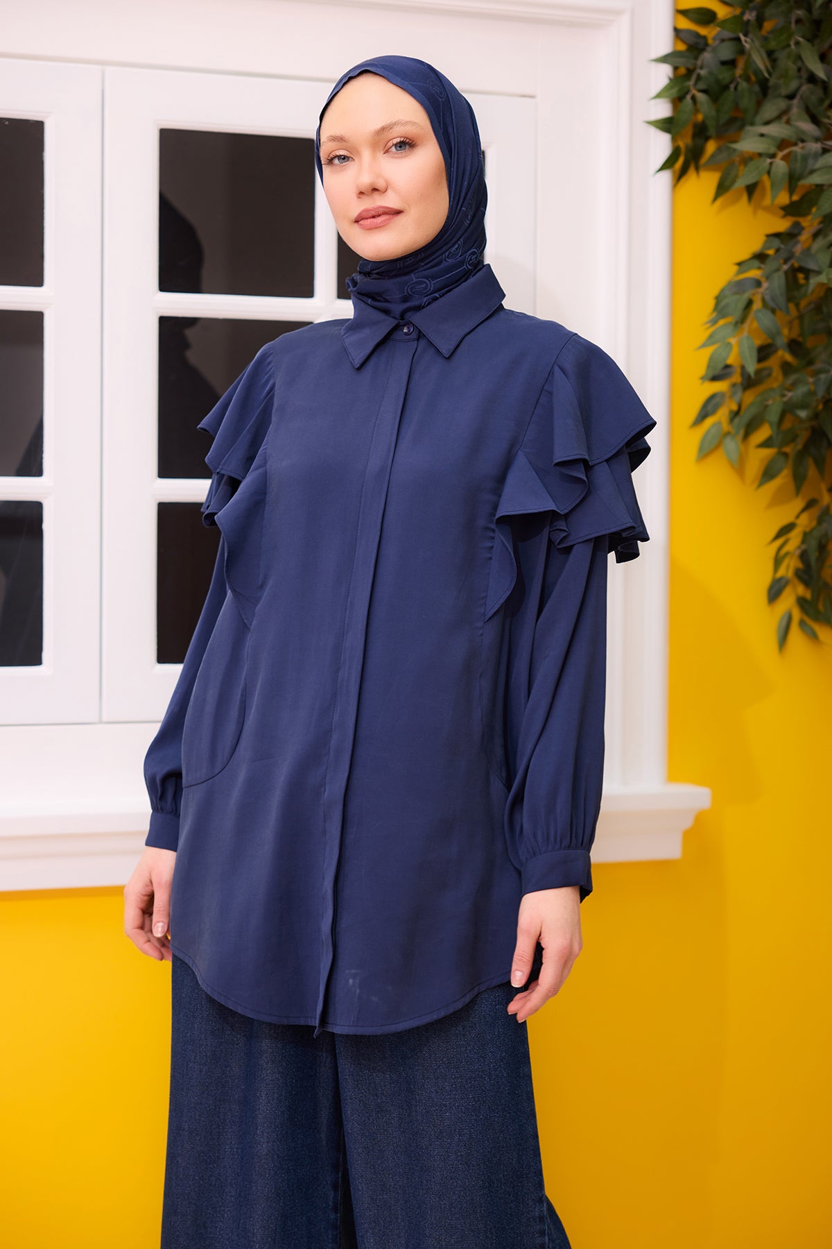 Navy Blue Shirt with Ruffled Sleeves and Button Details