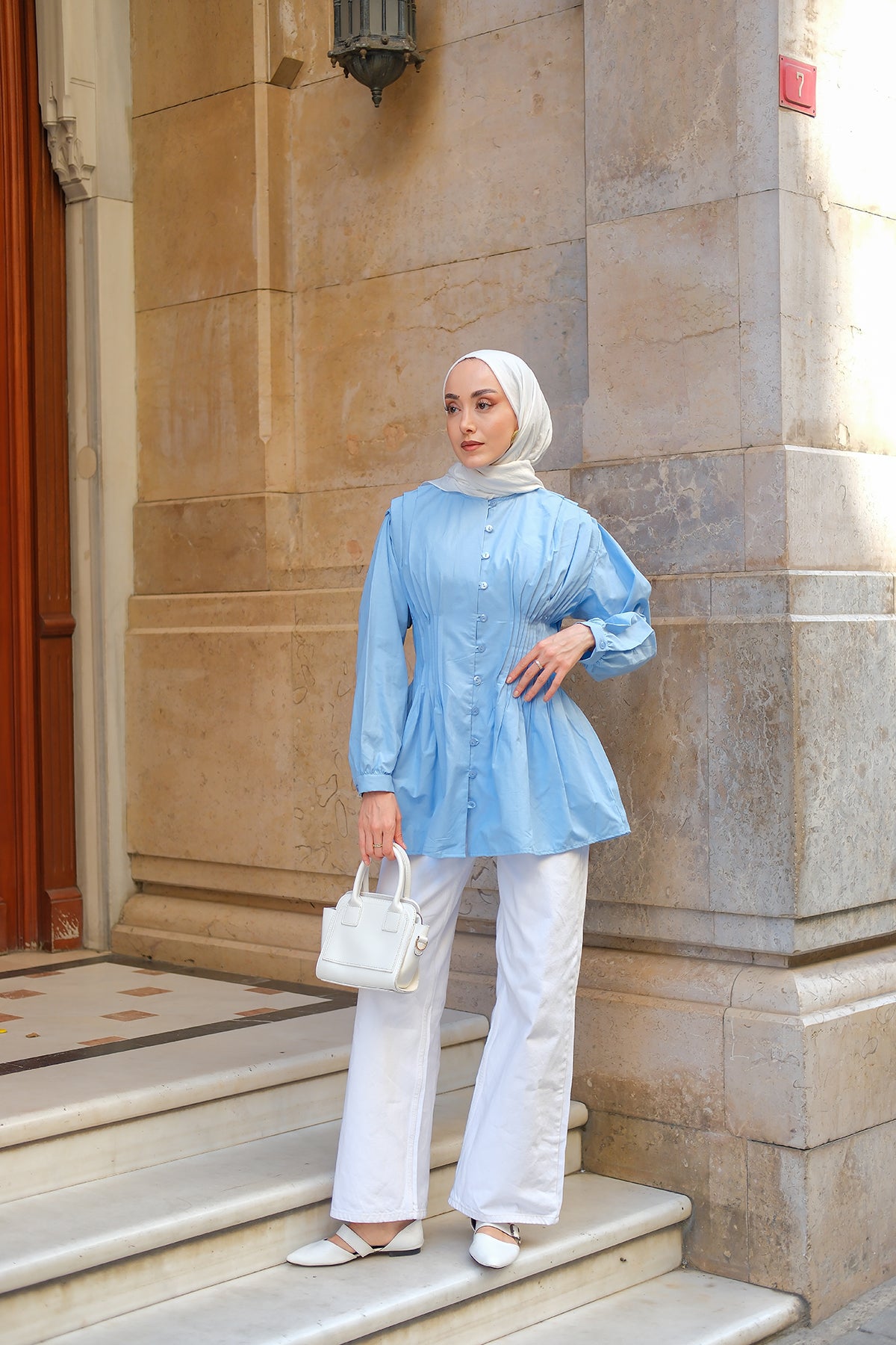 Waist-Pleated Poplin Shirt – Blue