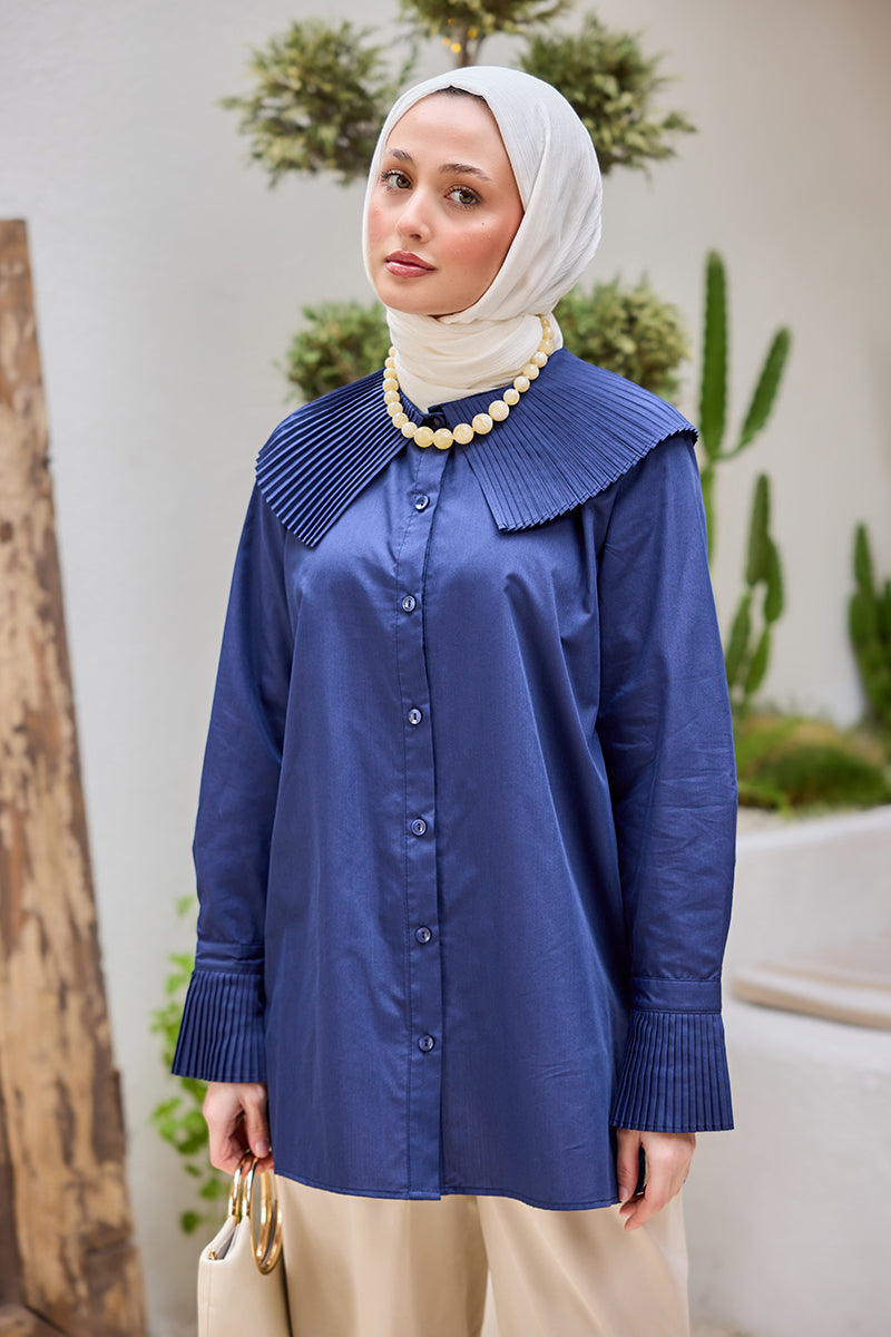 Shirt with Pleated Collar and Sleeve Details Navy Blue