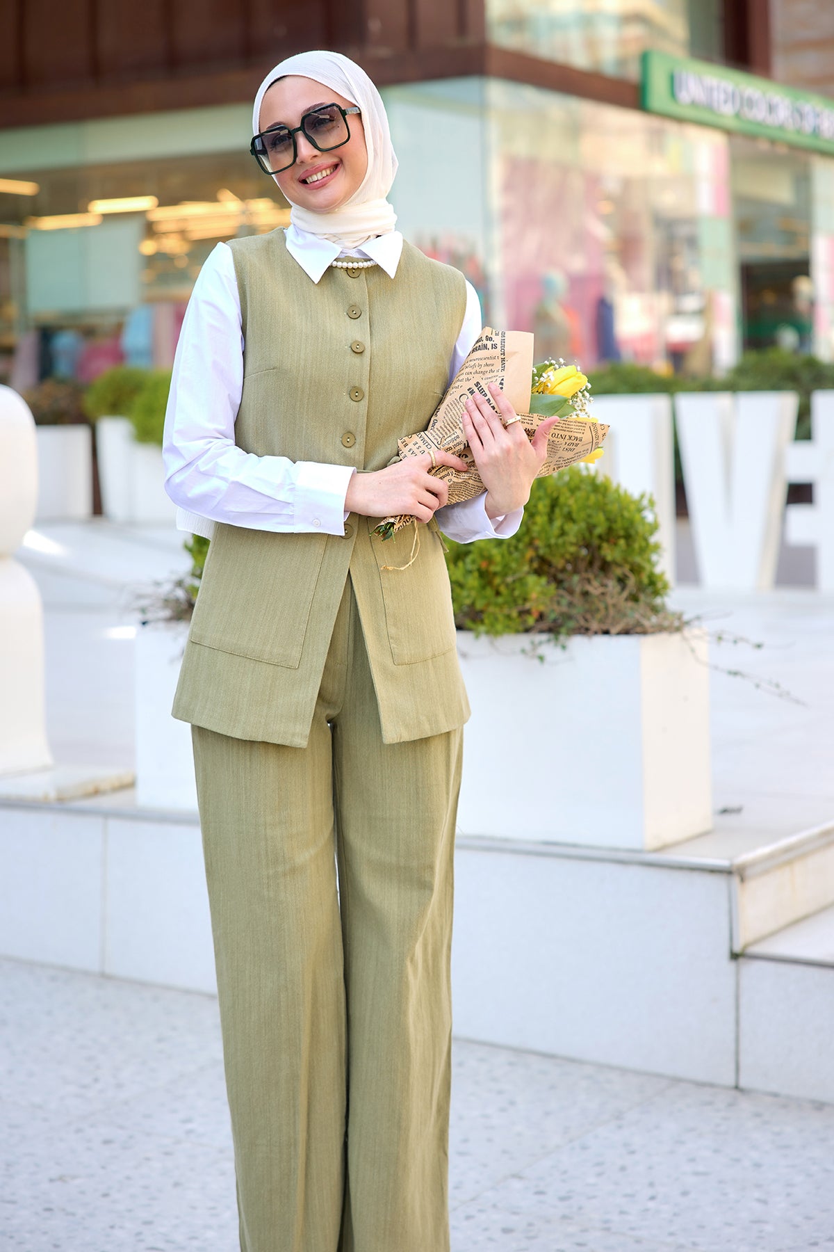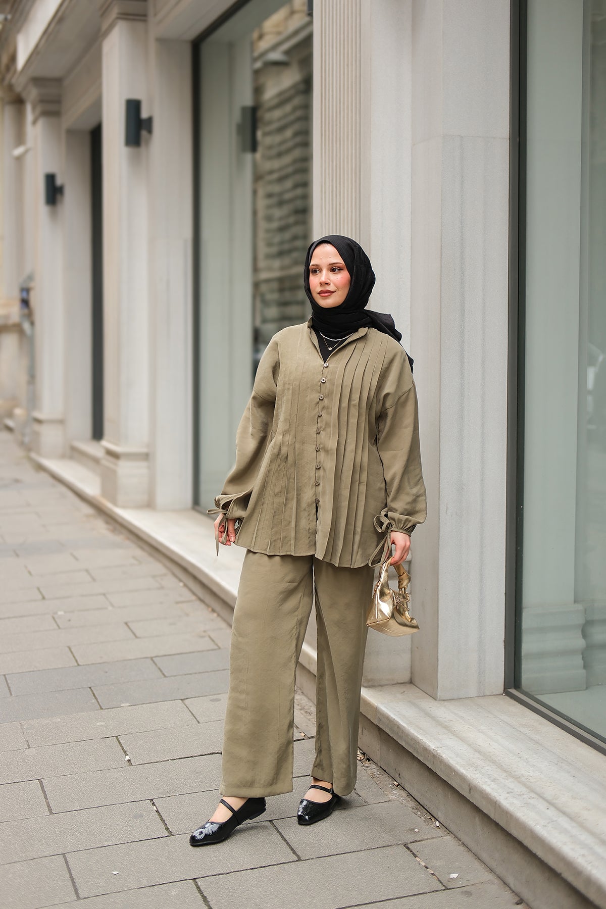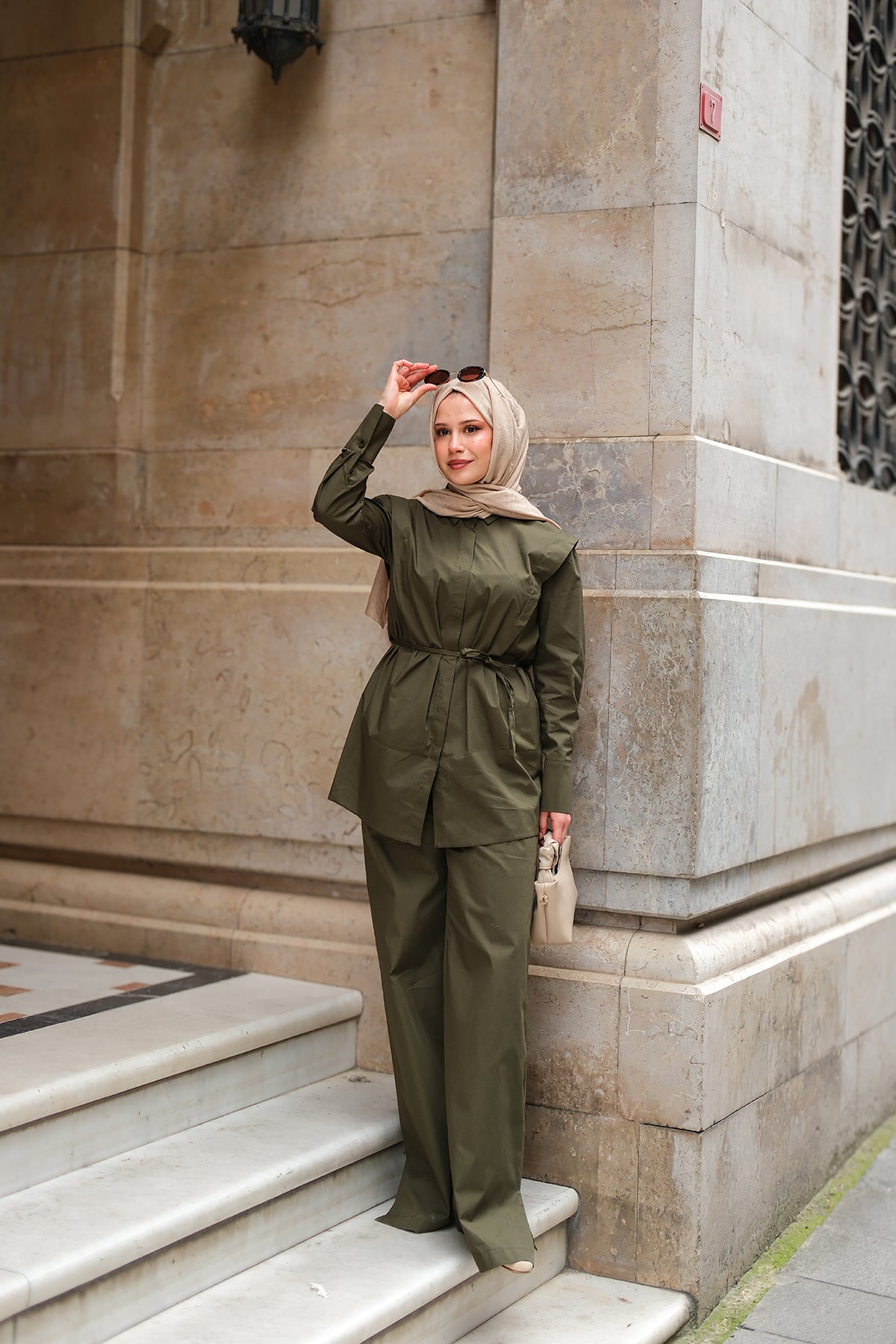 Elegant Set with External Padding Detail Khaki Green