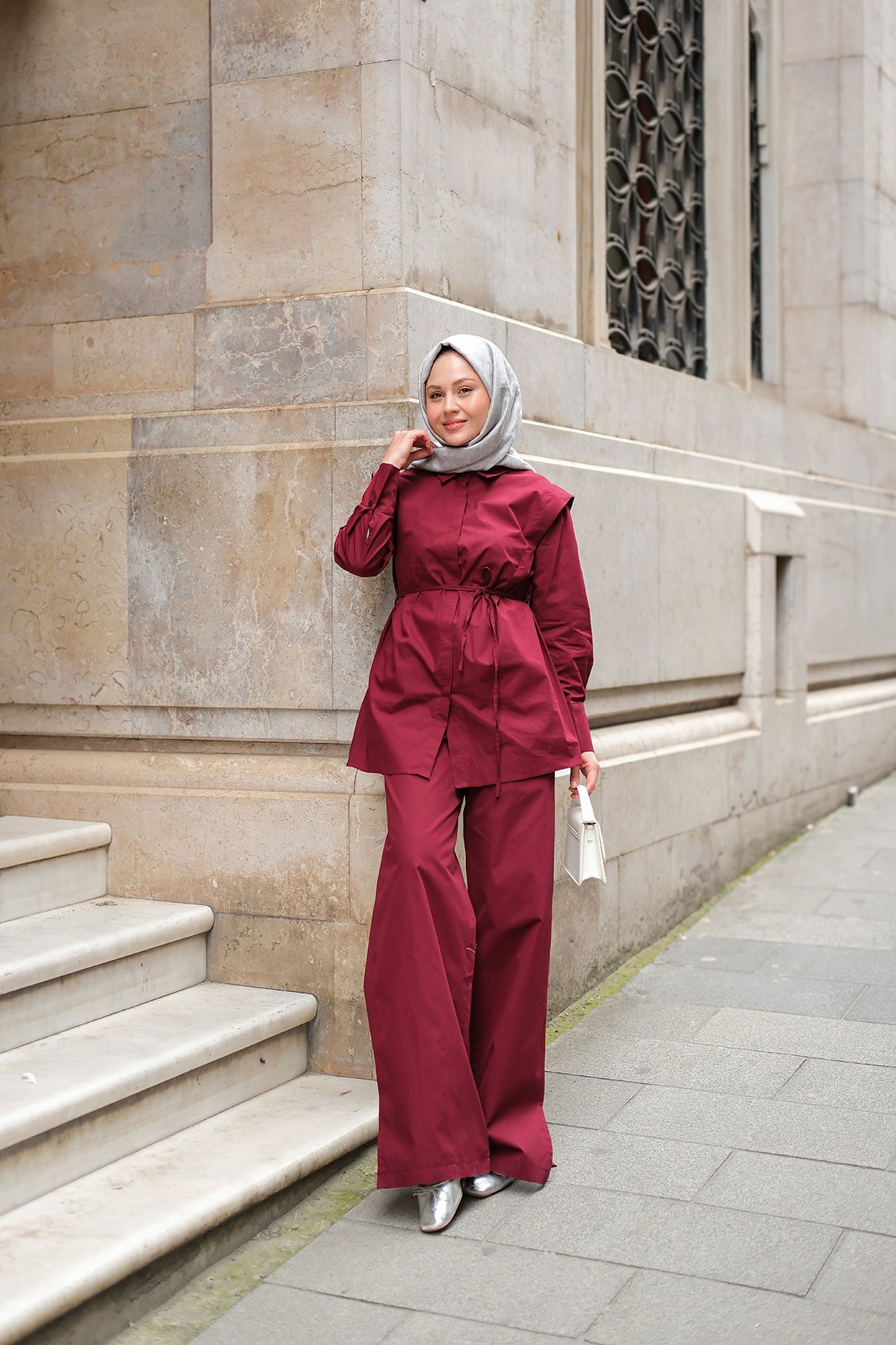 Wrap Collar Rose Belted Suit Burgundy