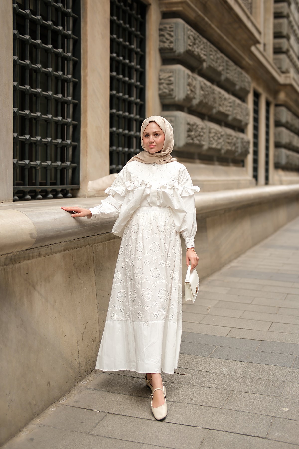 Ruffled Stone Embroidered Set White