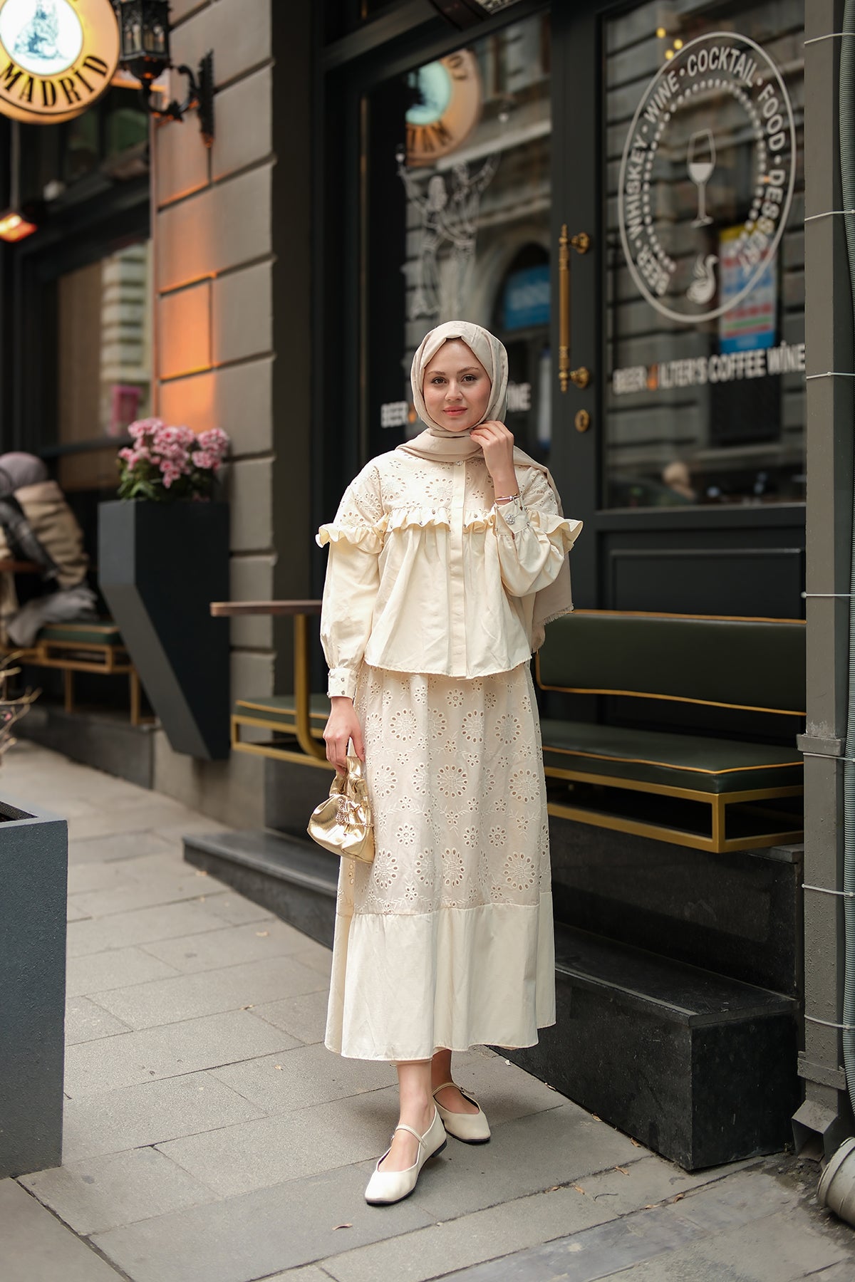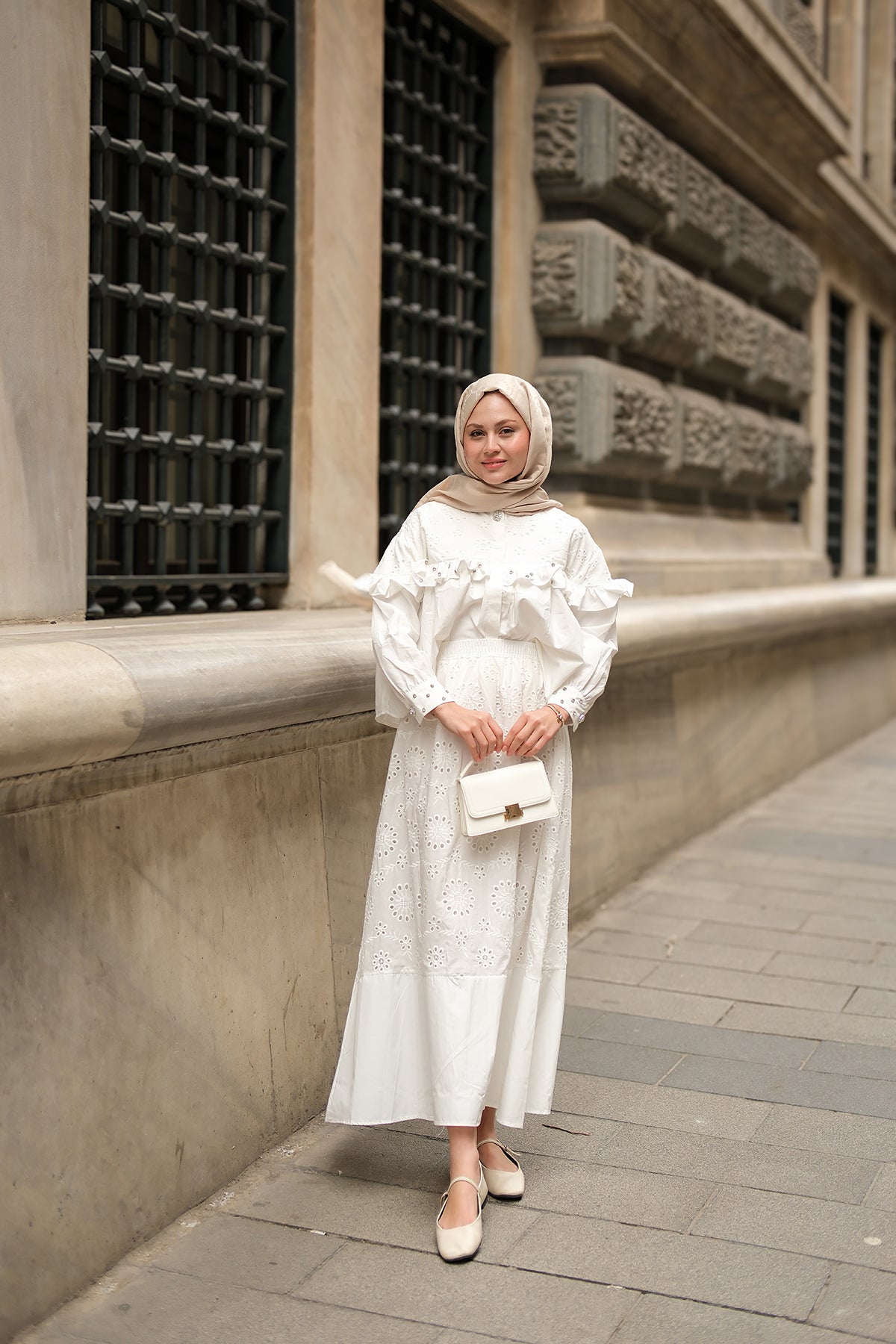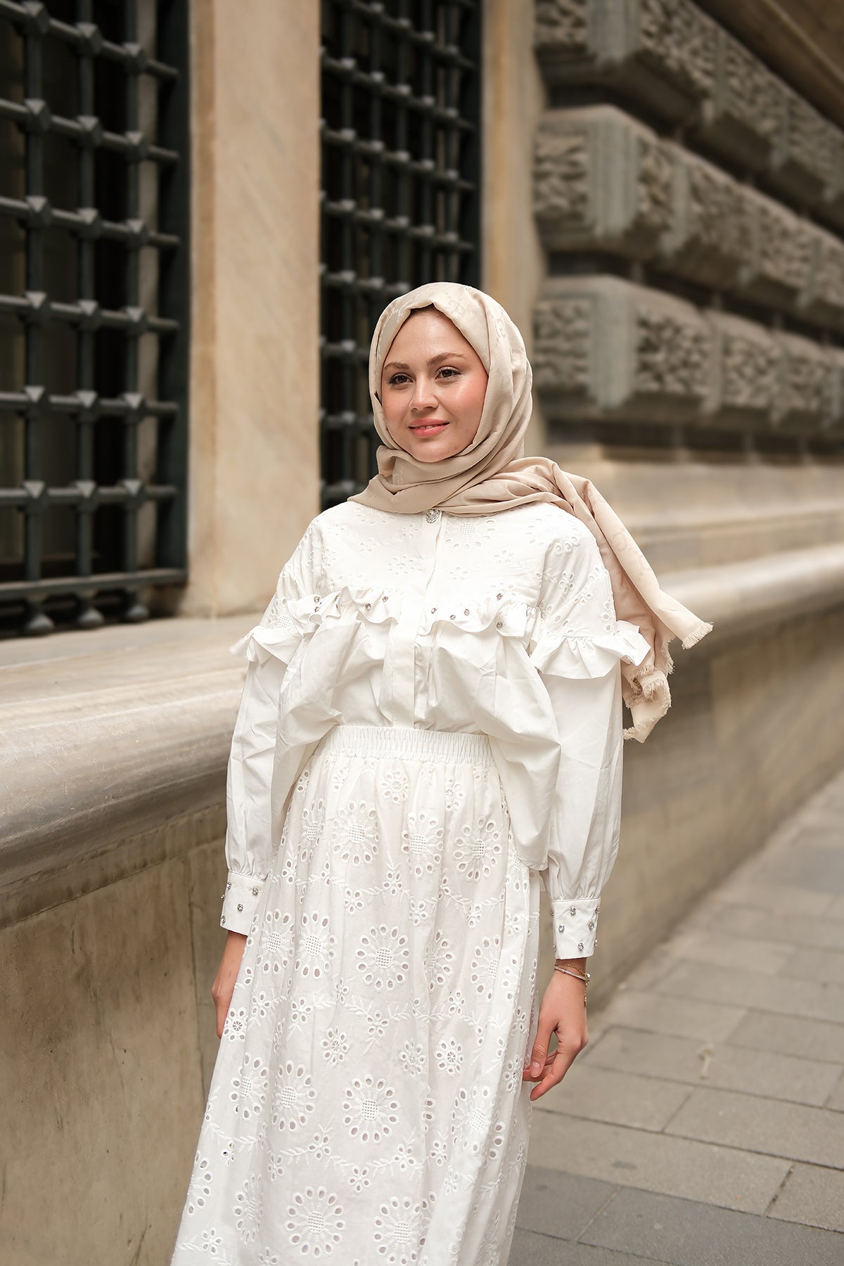 Ruffled Stone Embroidered Set Cream