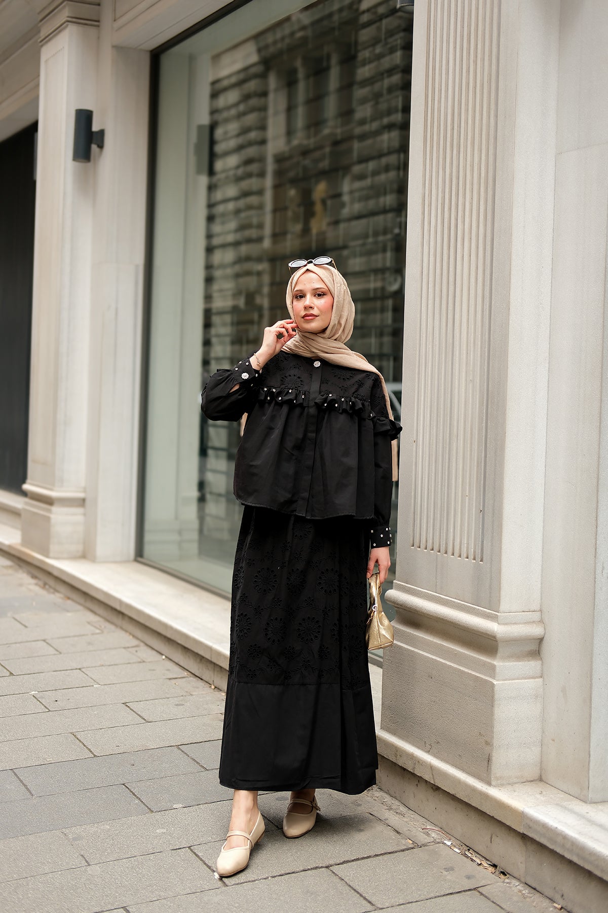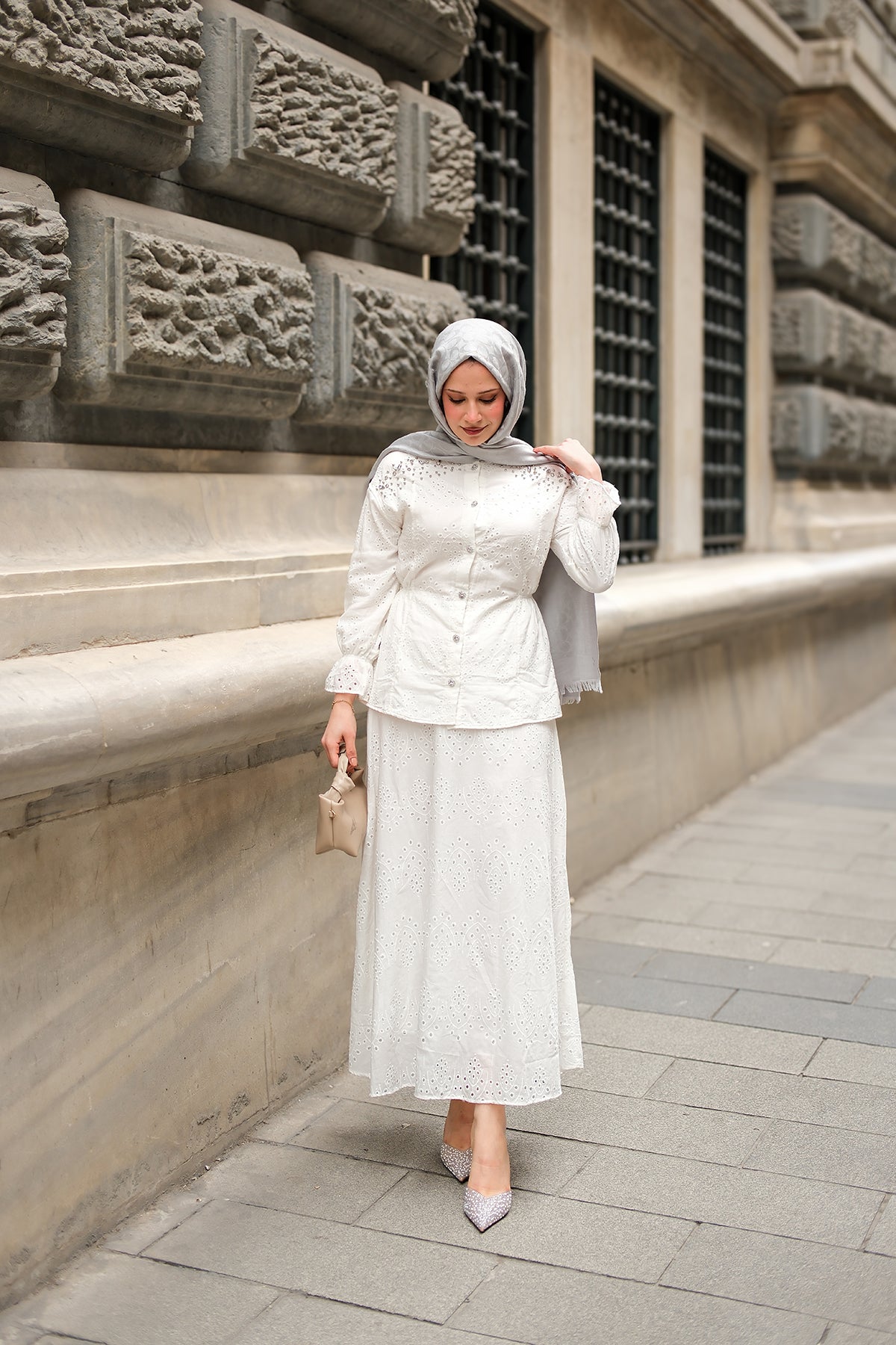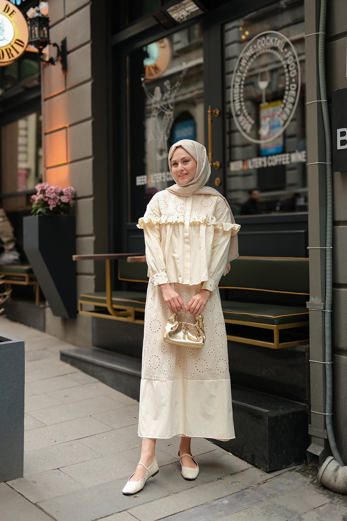 Ruffled Stone Embroidered Set Cream