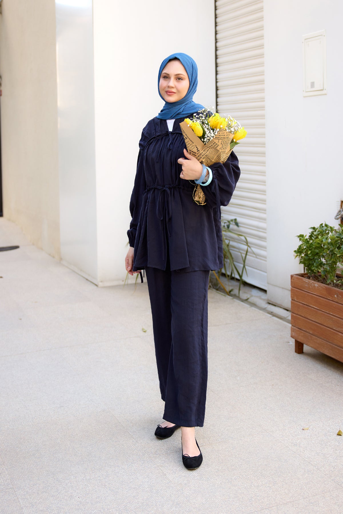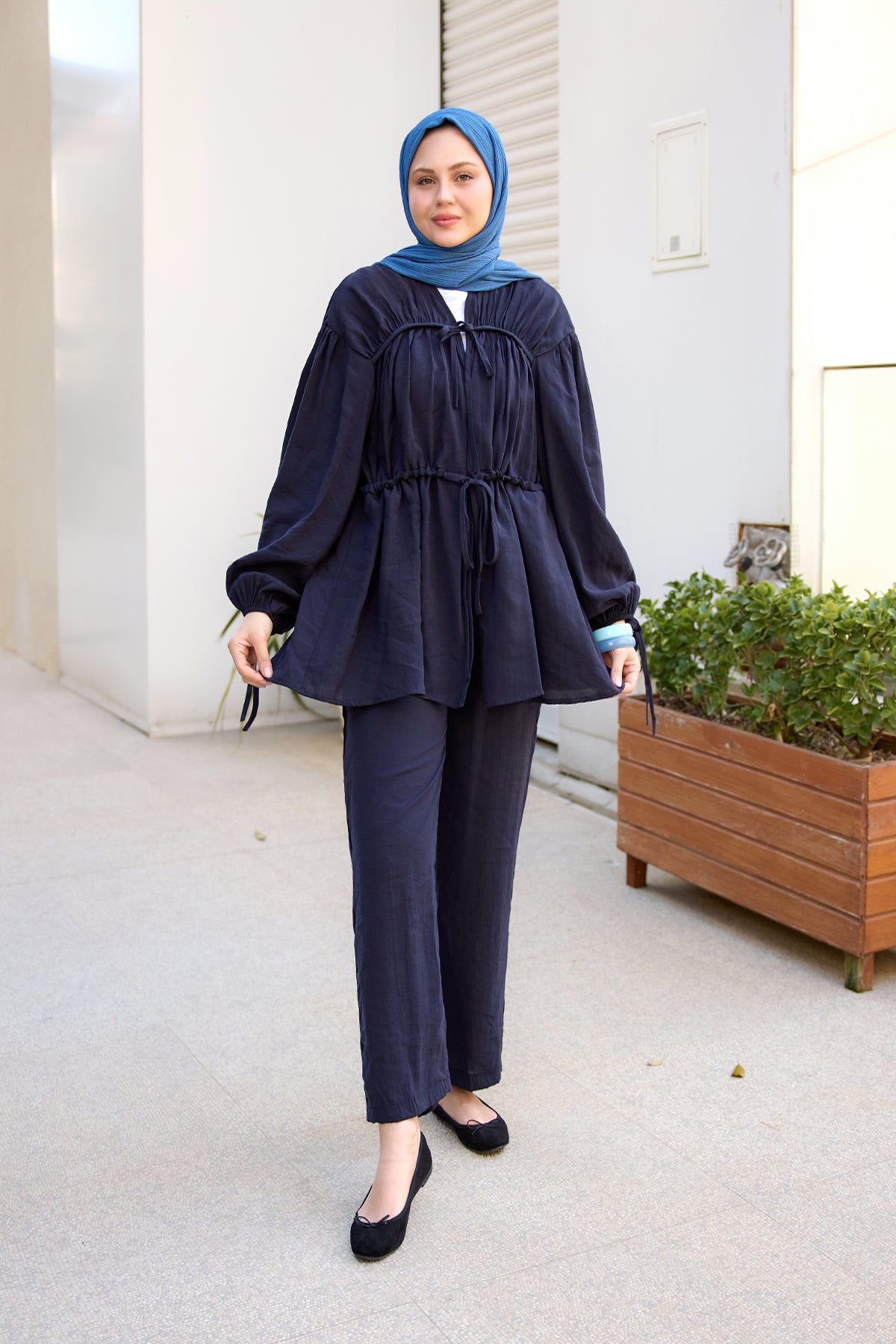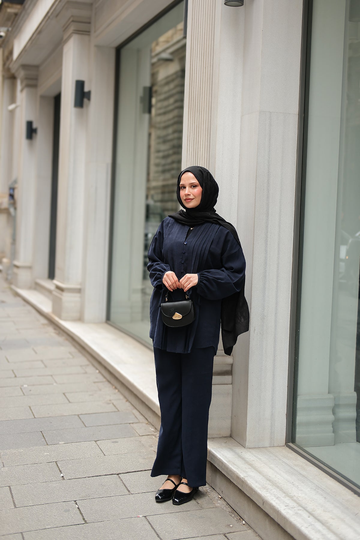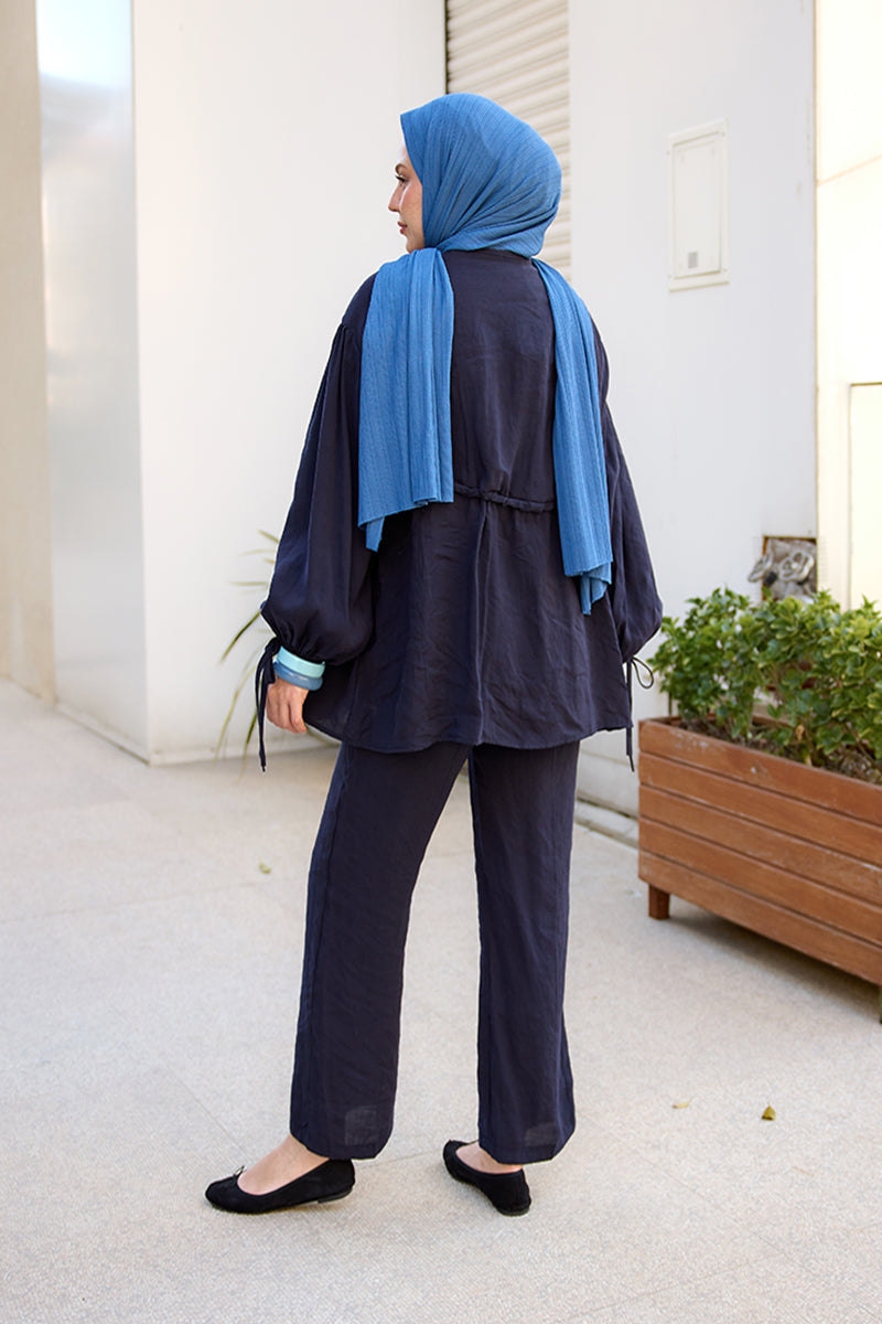 Decorative-Stitched Gathered Set in Navy Blue