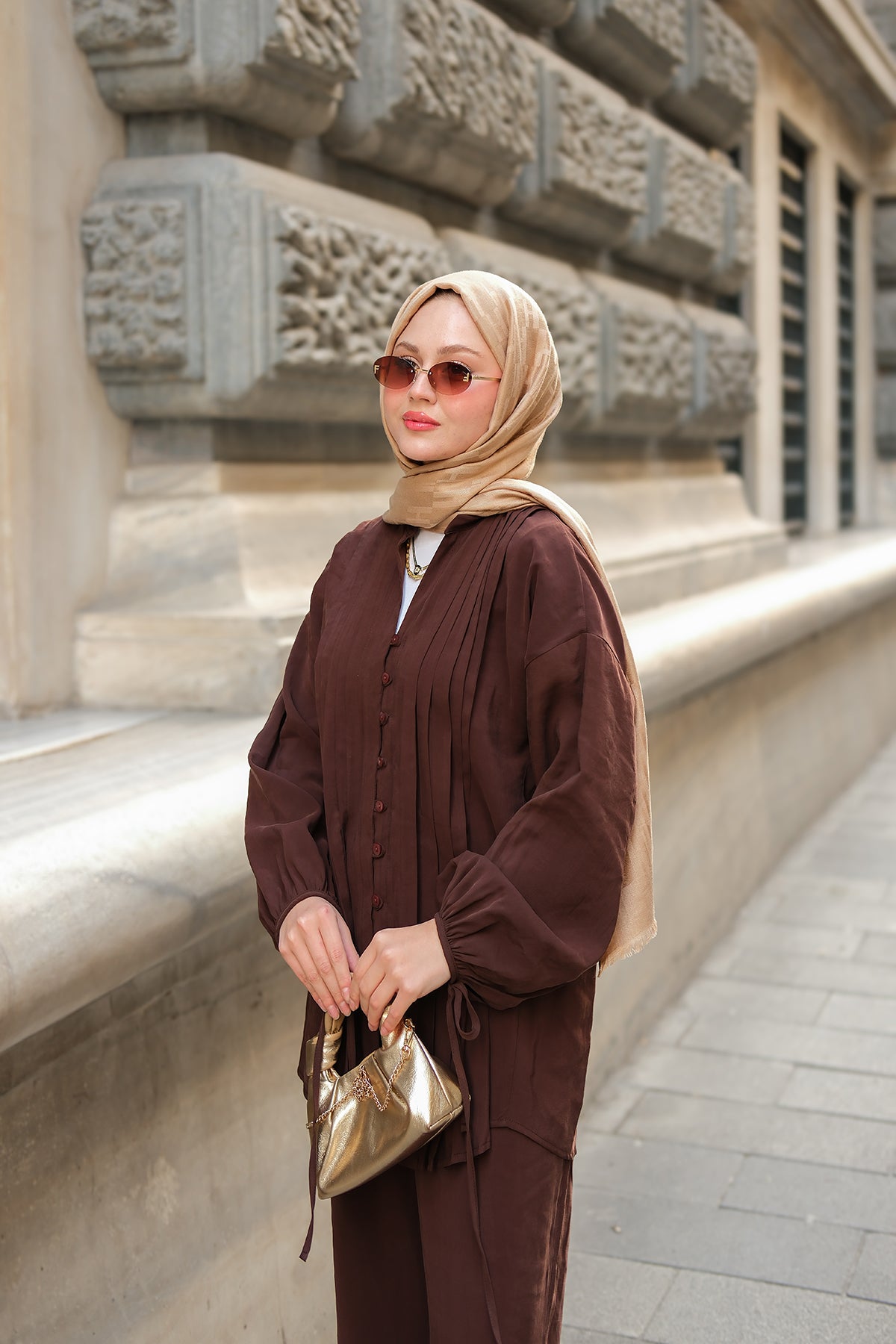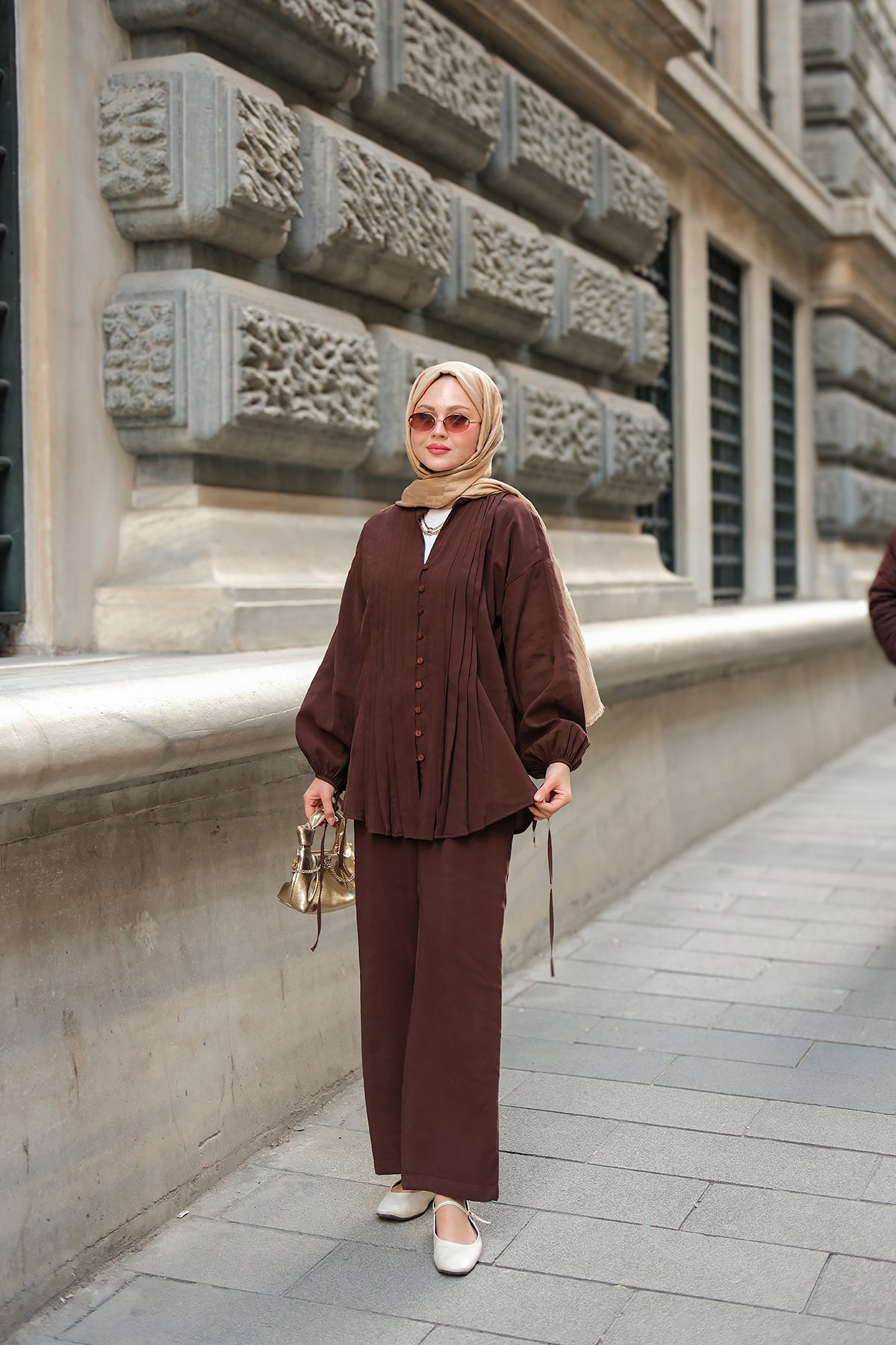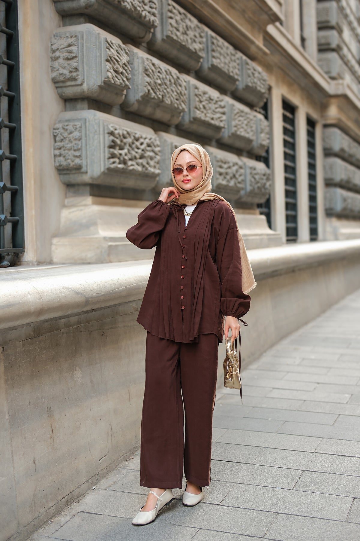 Decorative-Stitched Gathered Set in Brown