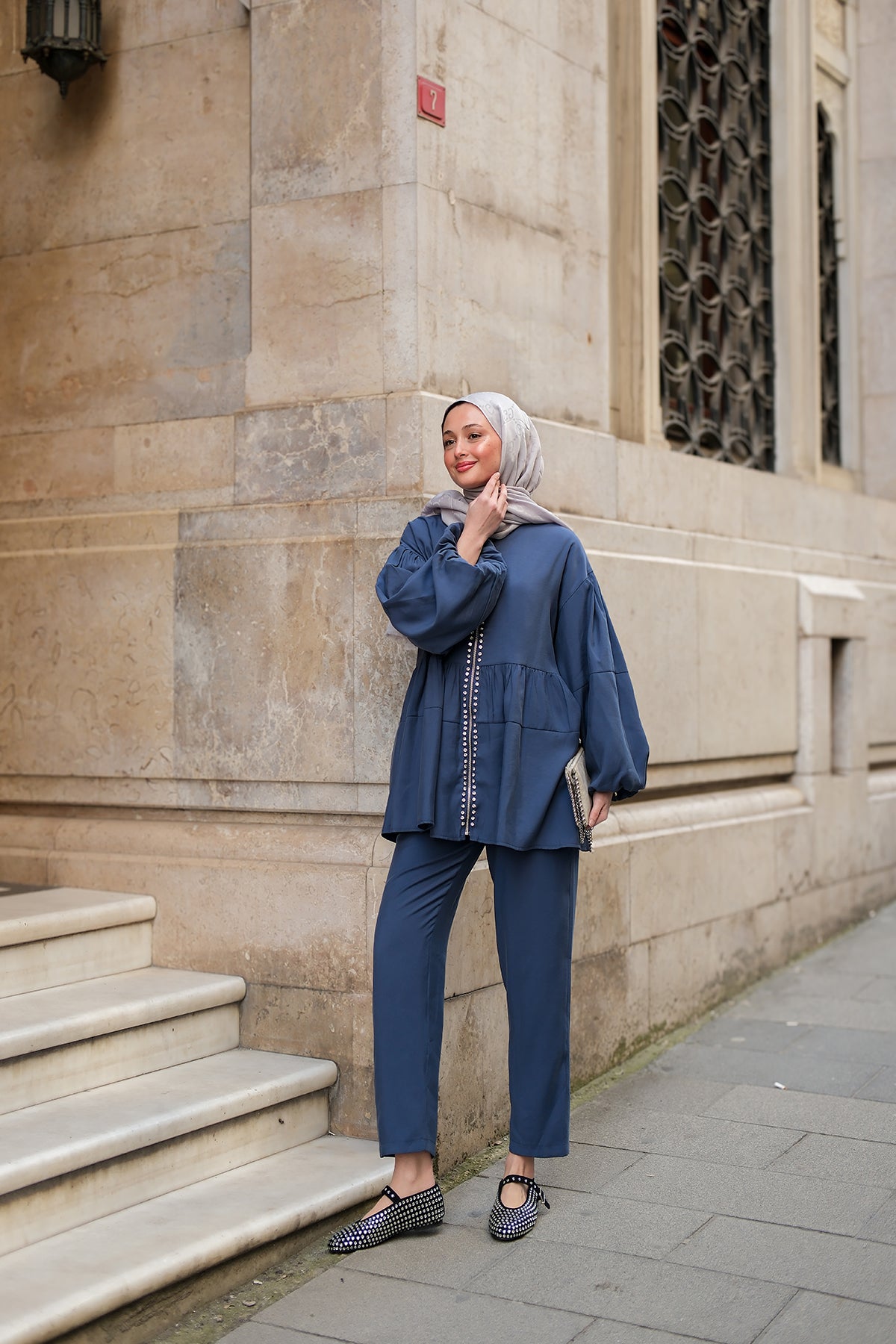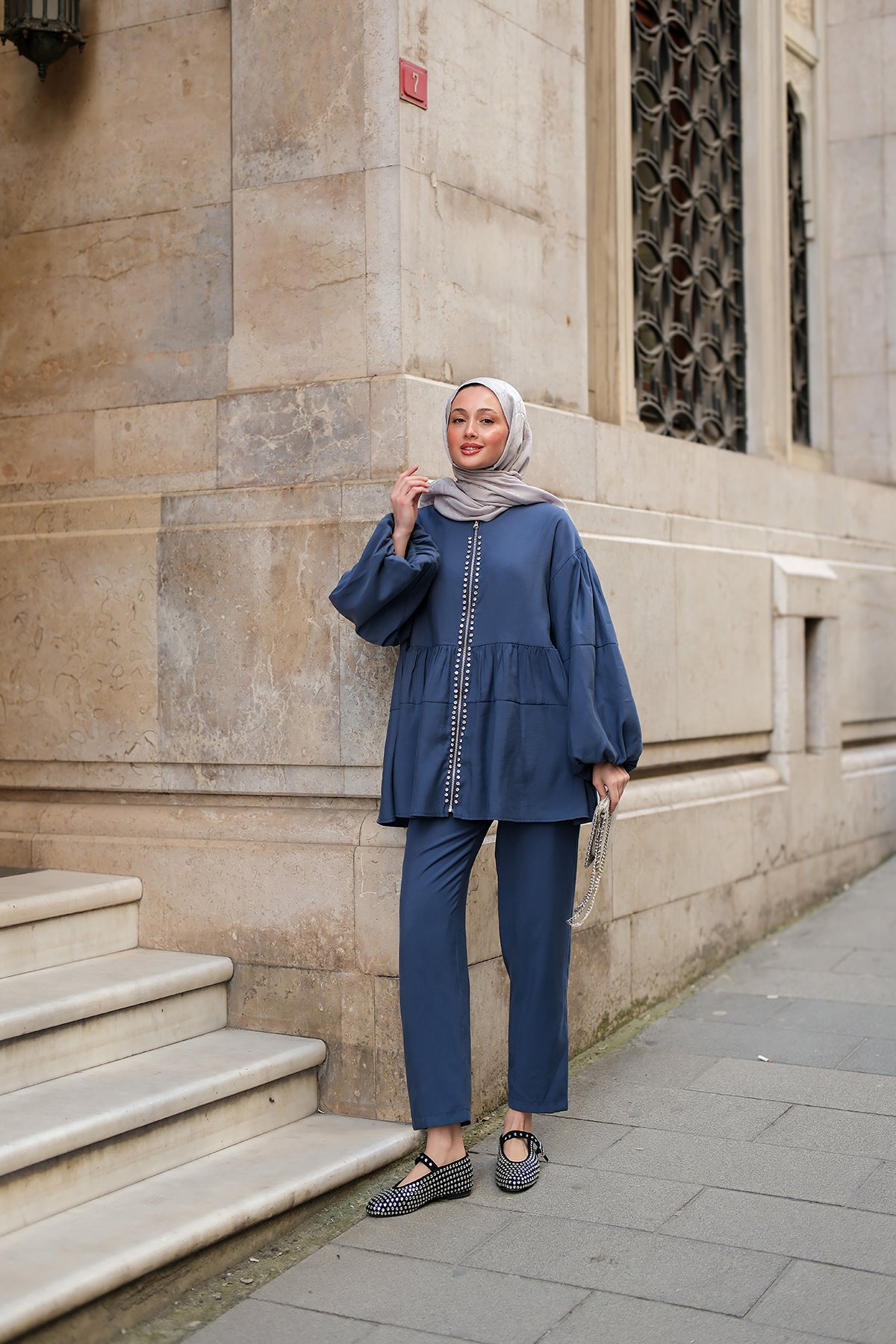 Indigo Blue Two-Piece Set with Zipper and Stone Details