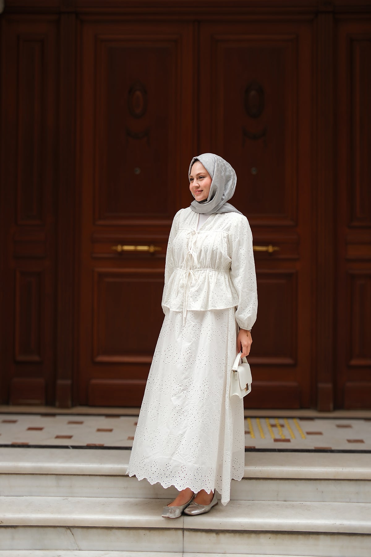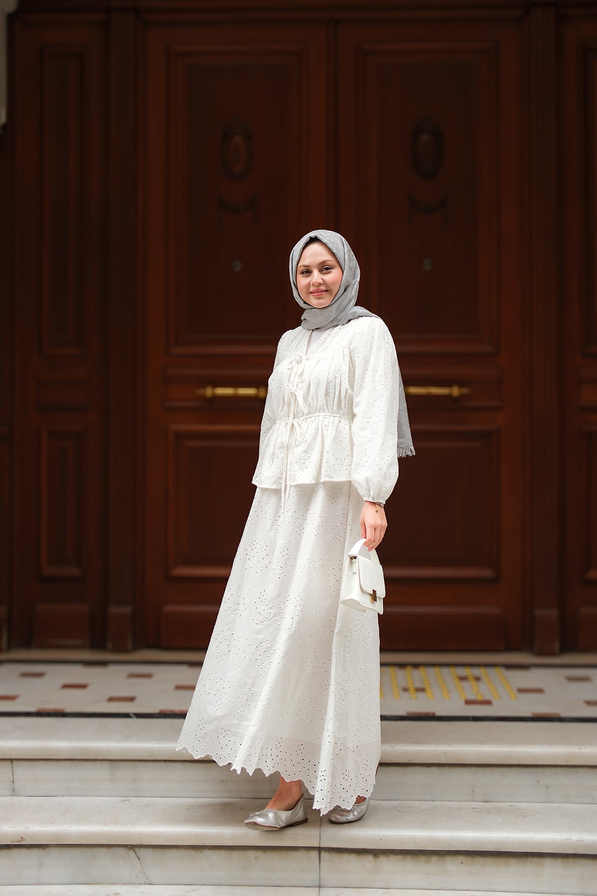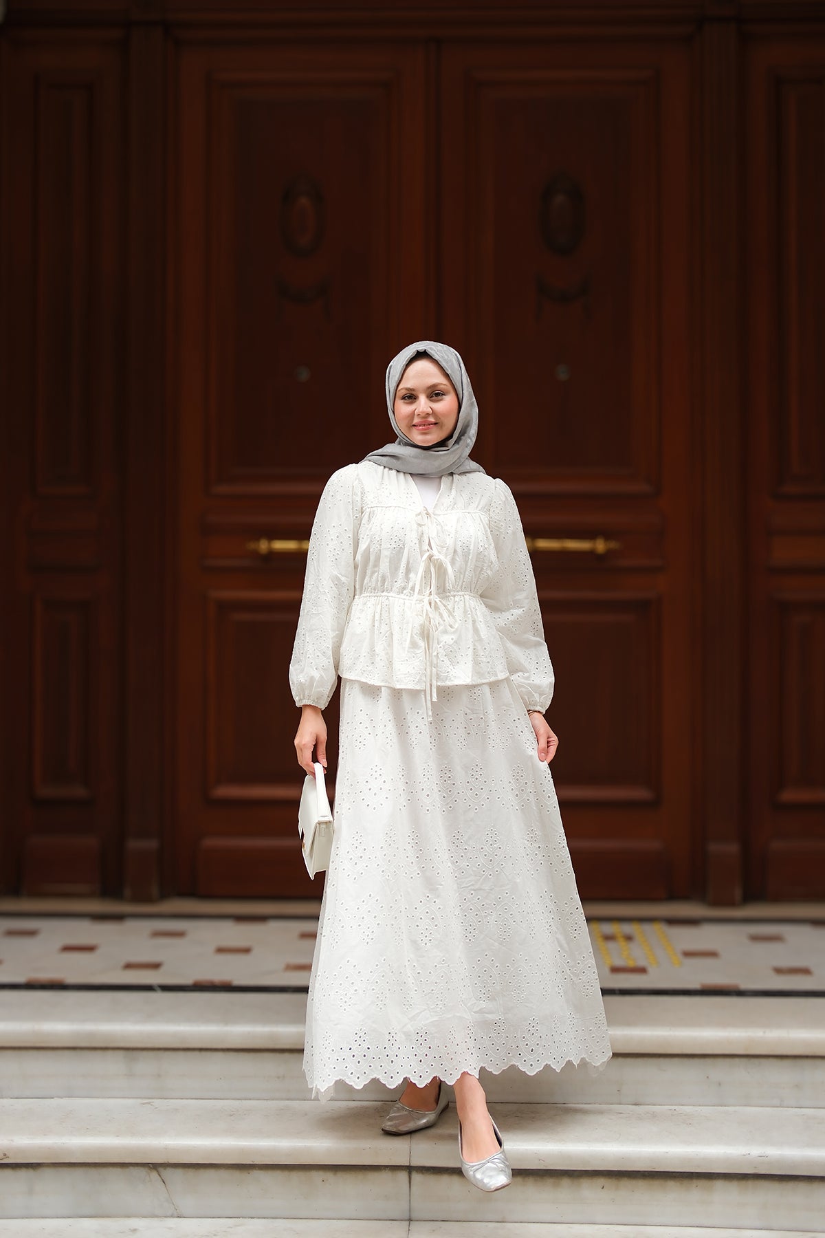 Ribbon Detail Front Broderie Set White