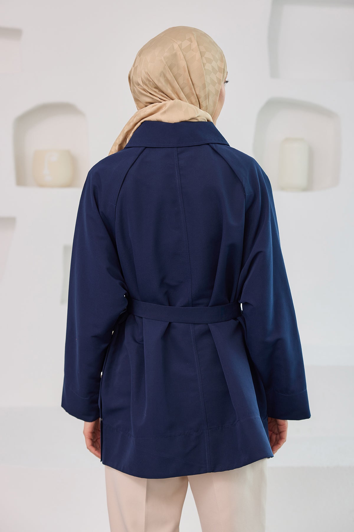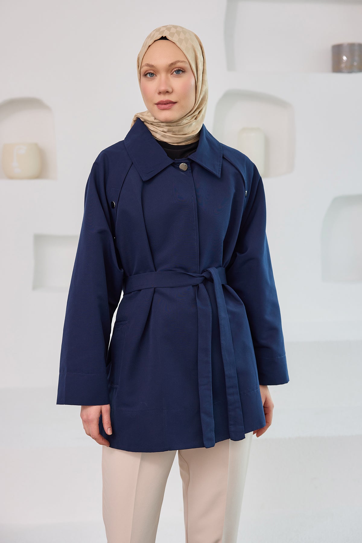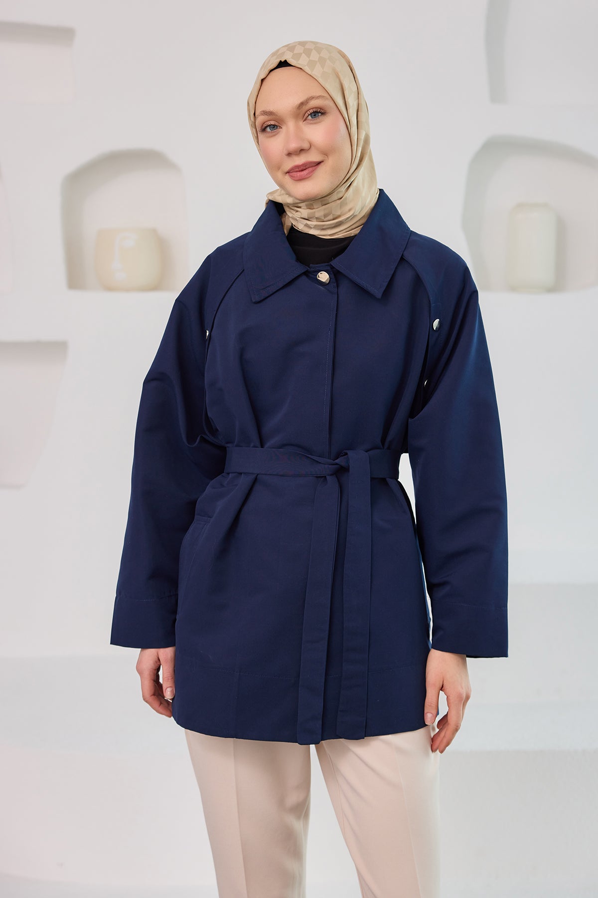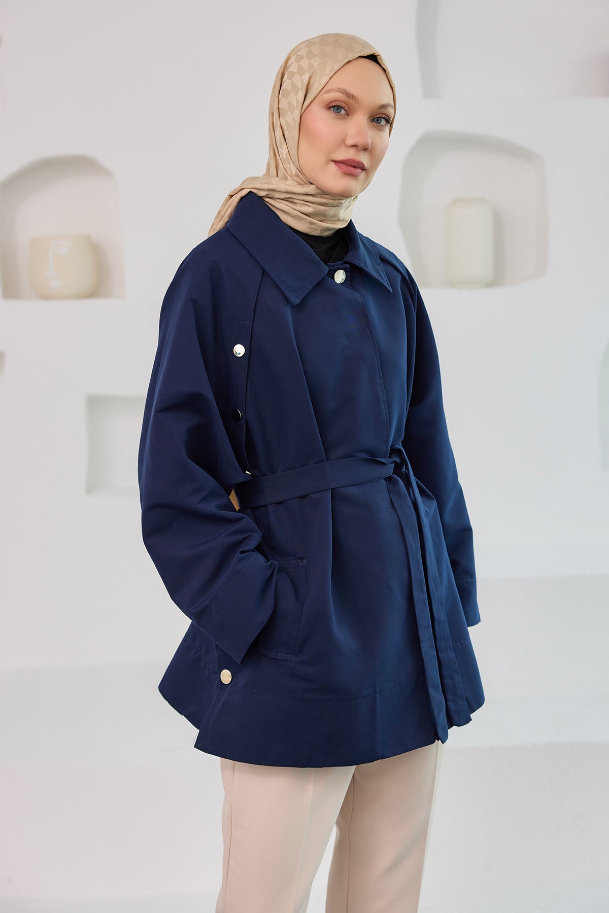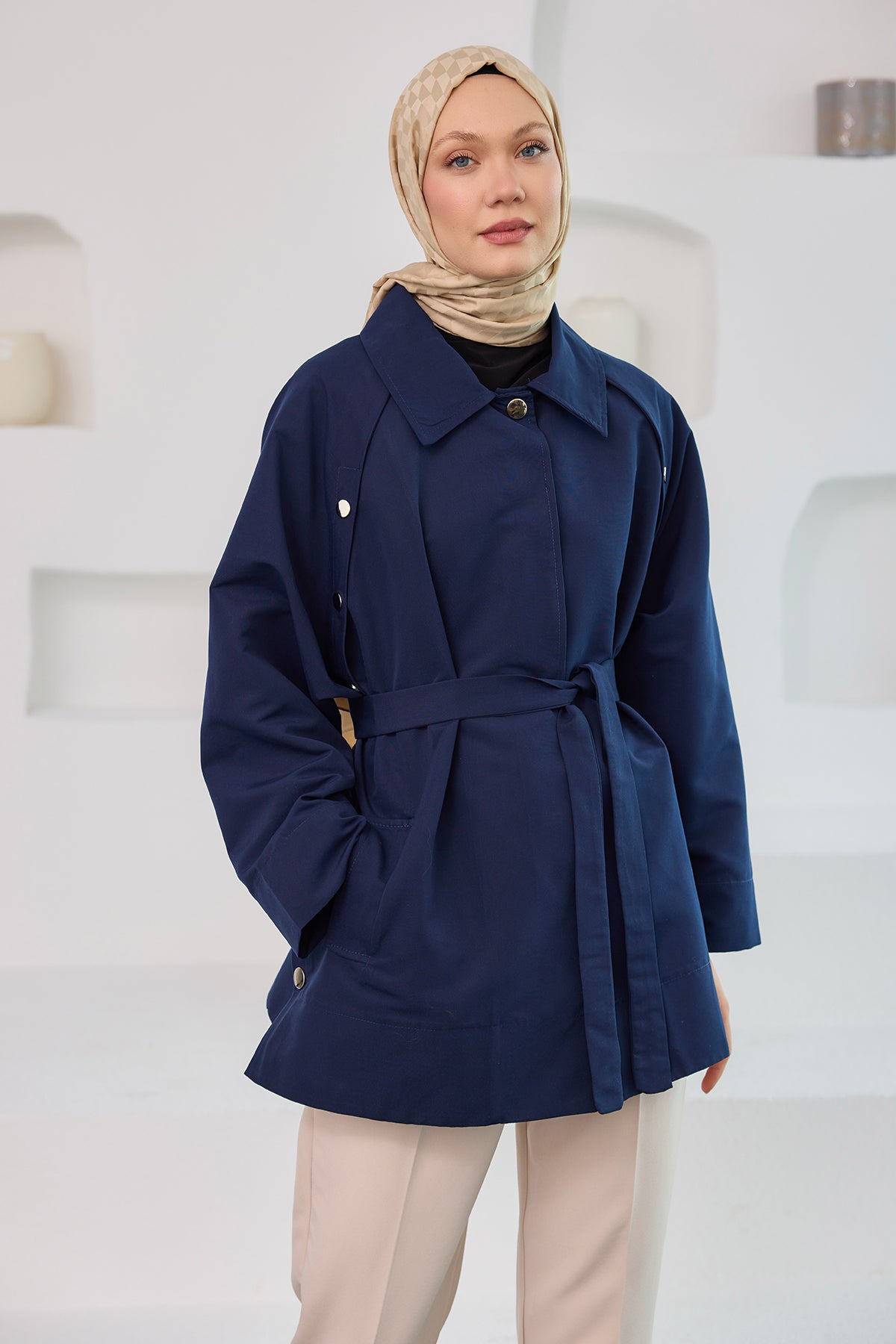 Sides Openable Snap Button Detail Short Trench Coat Navy
