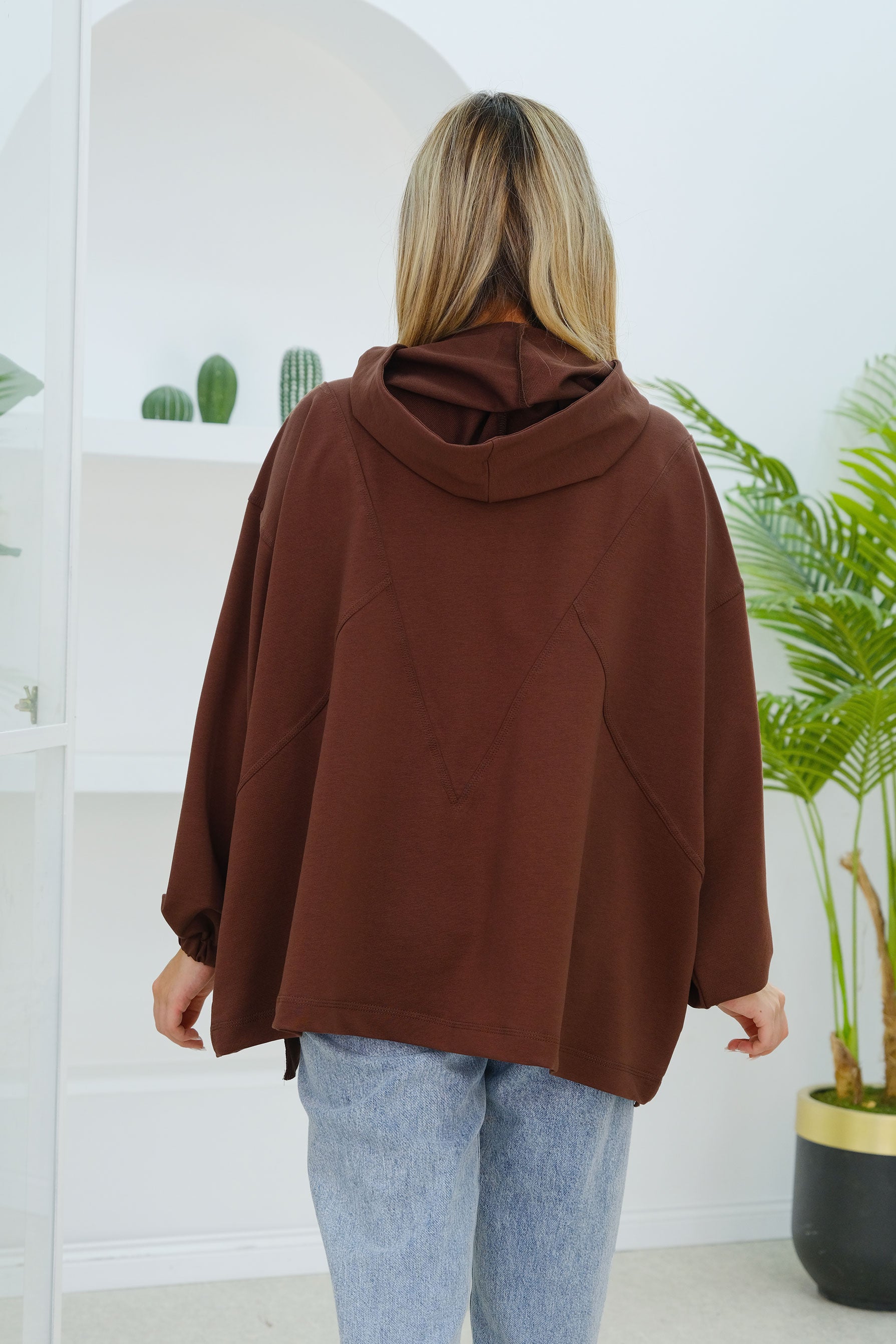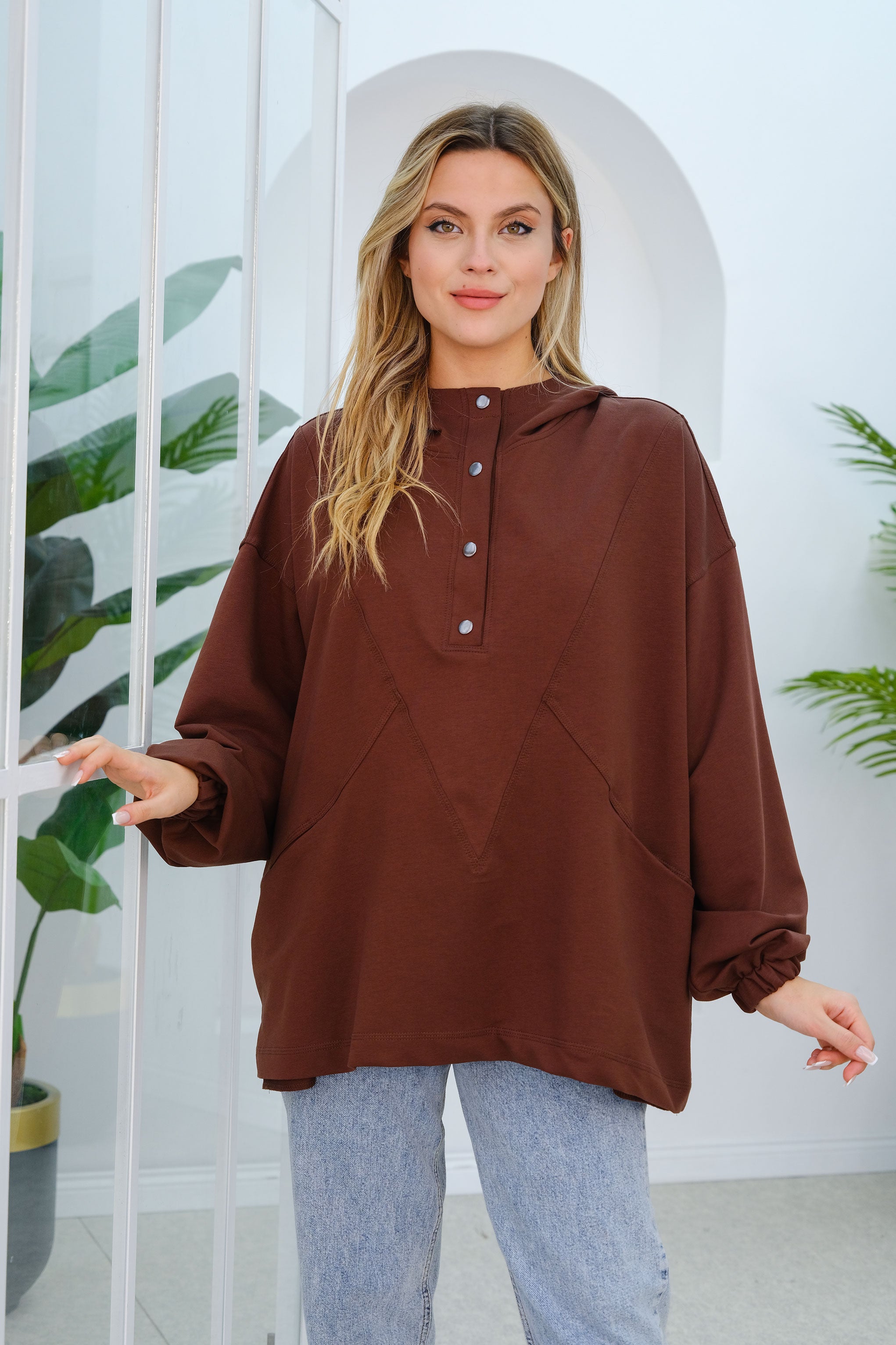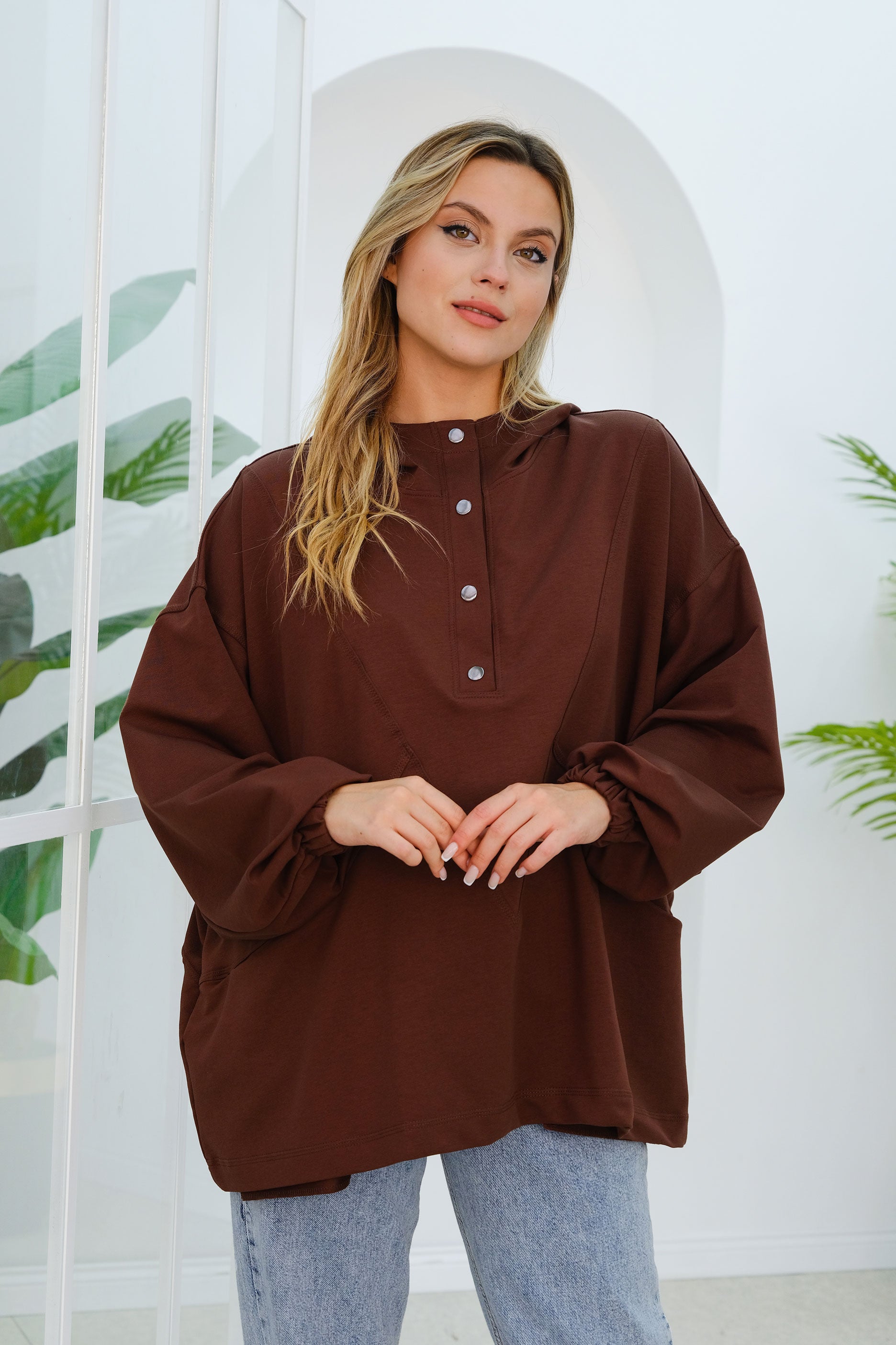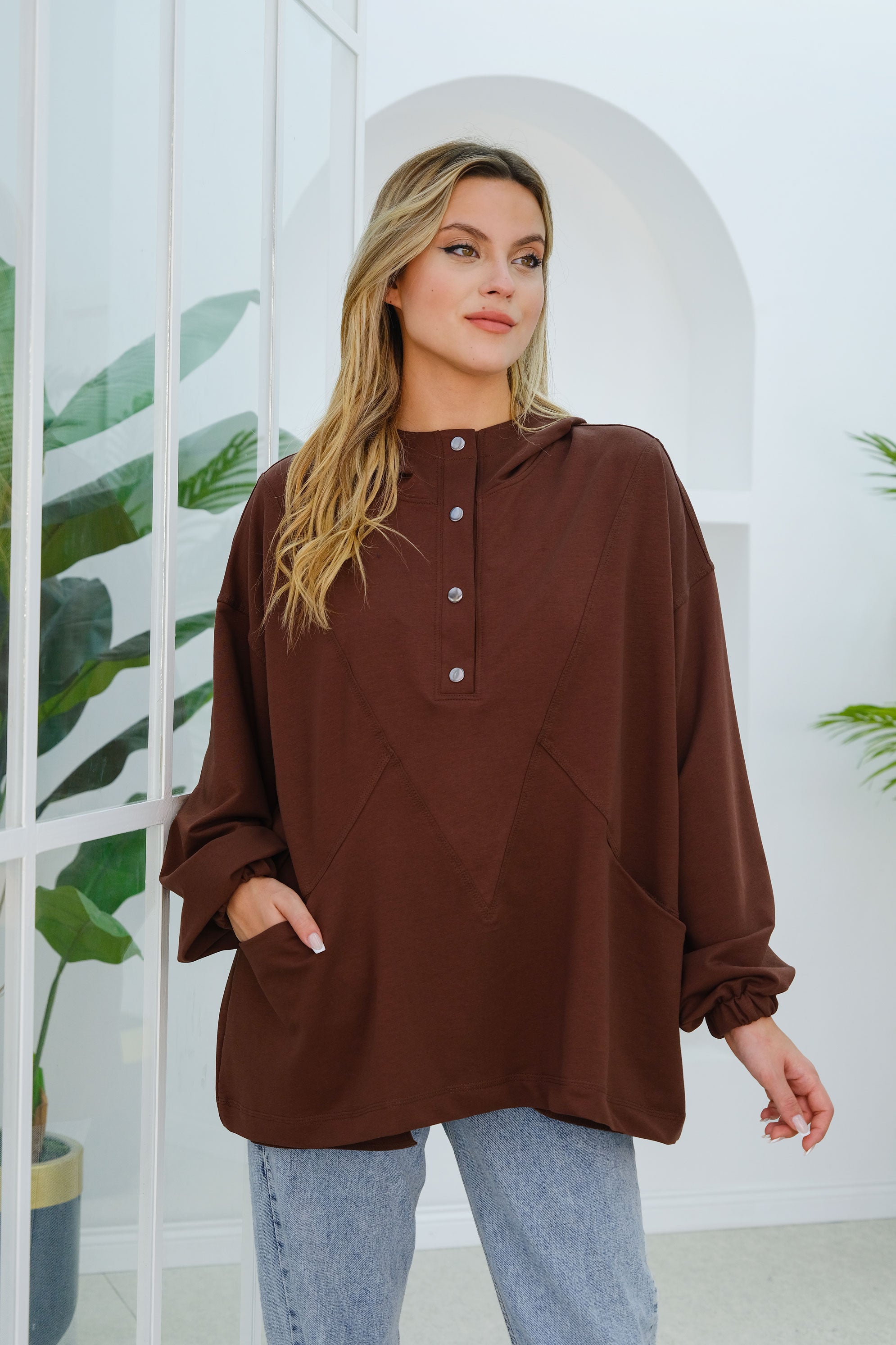 Stitch Detail Snap Button Tunic in Brown