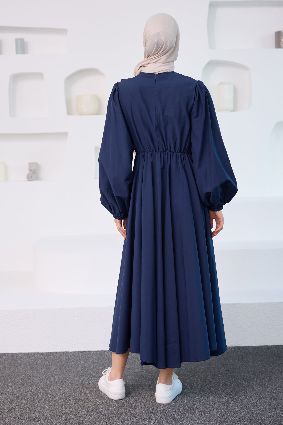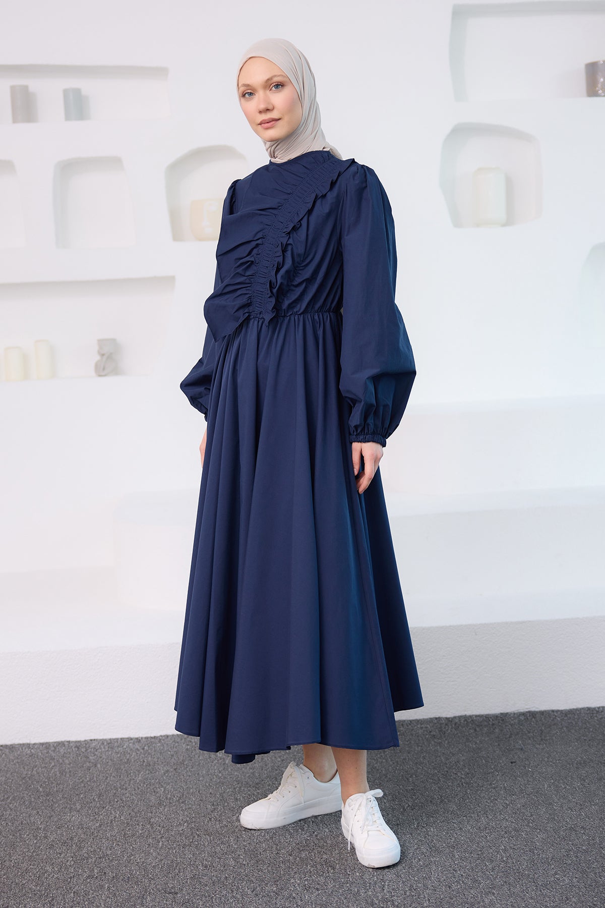 Asymmetric Ruched and Frilled Detail Dress Navy Blue