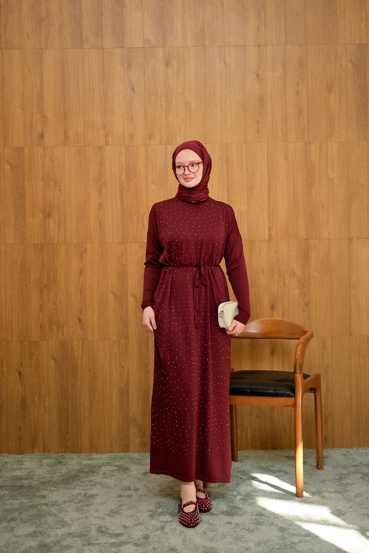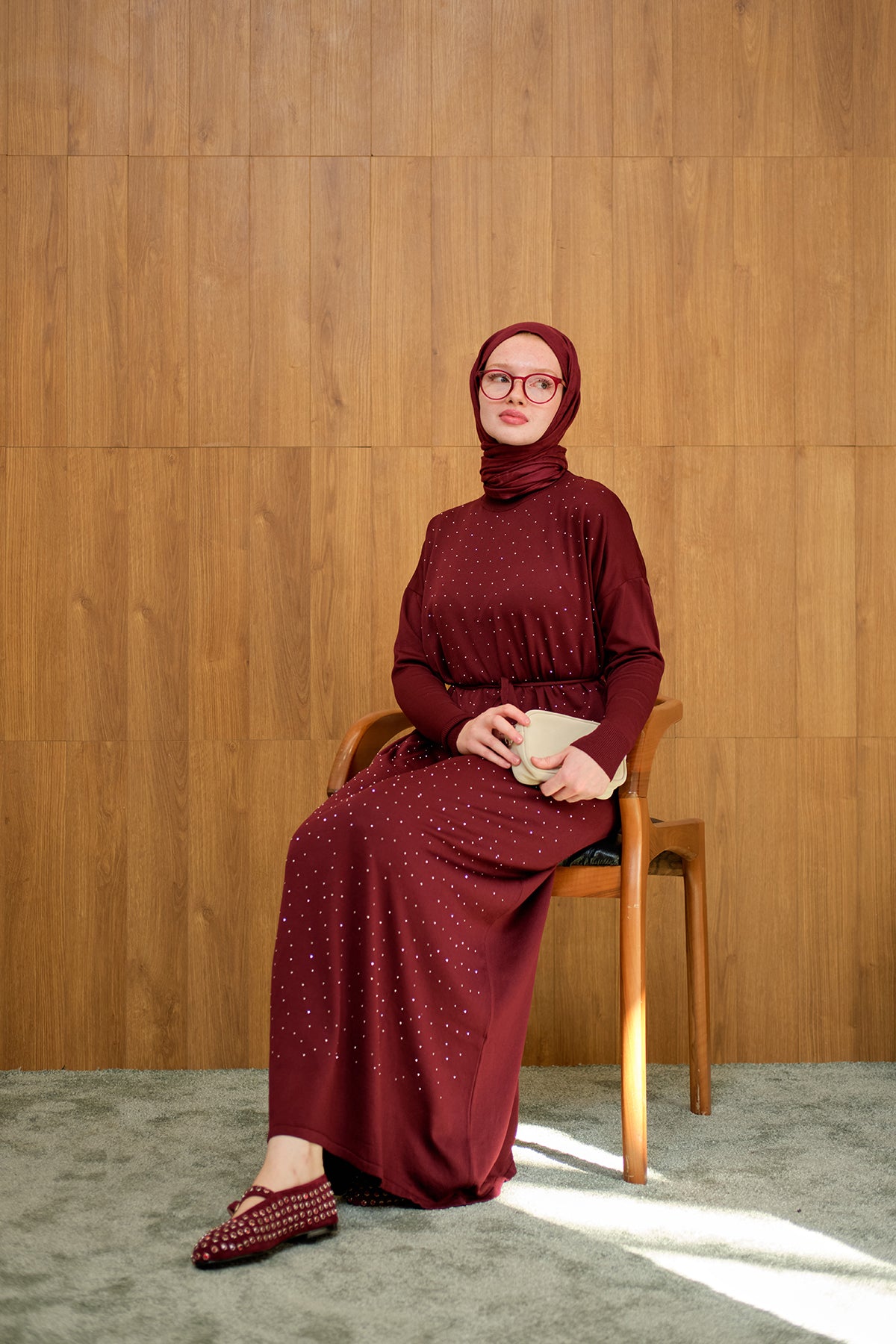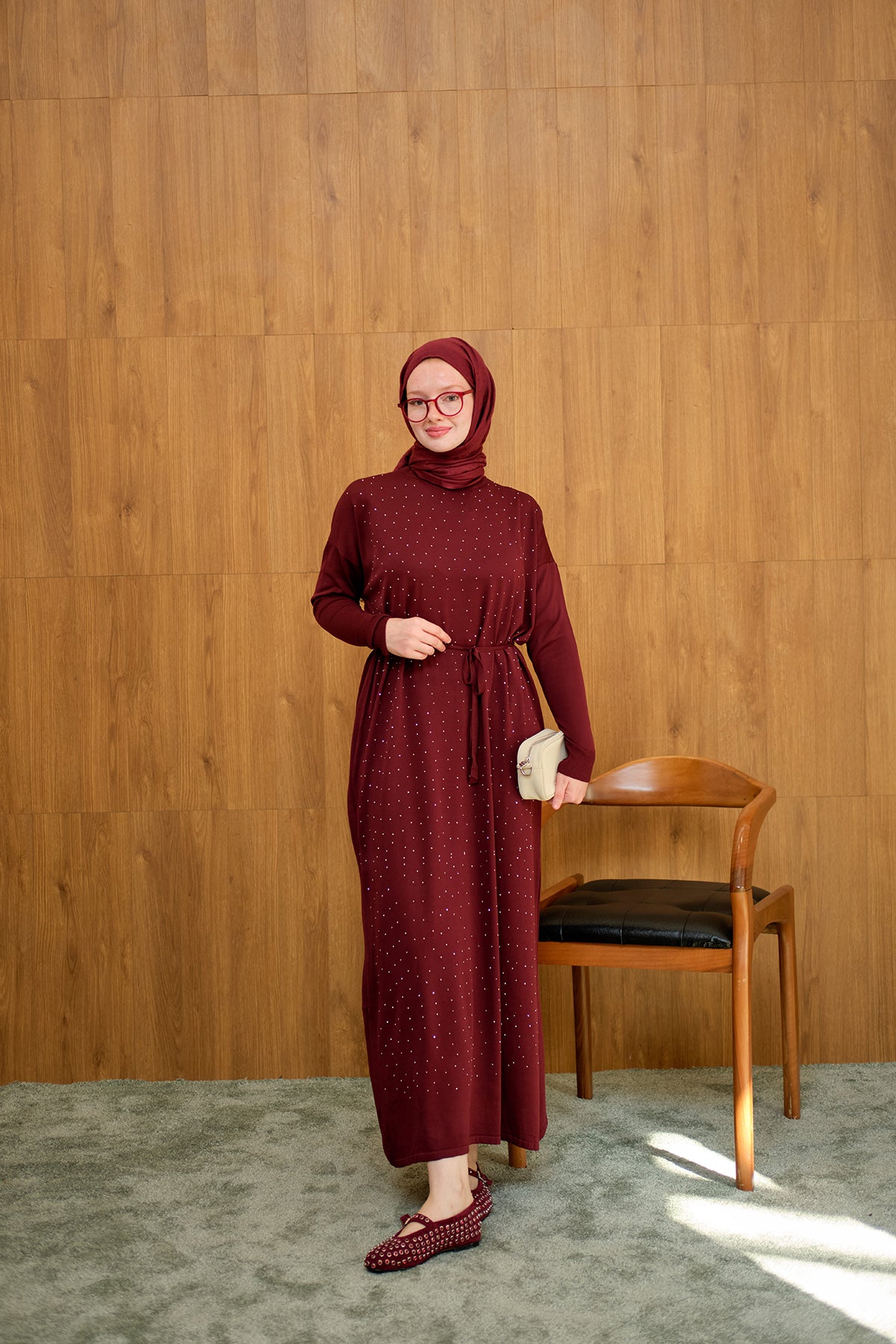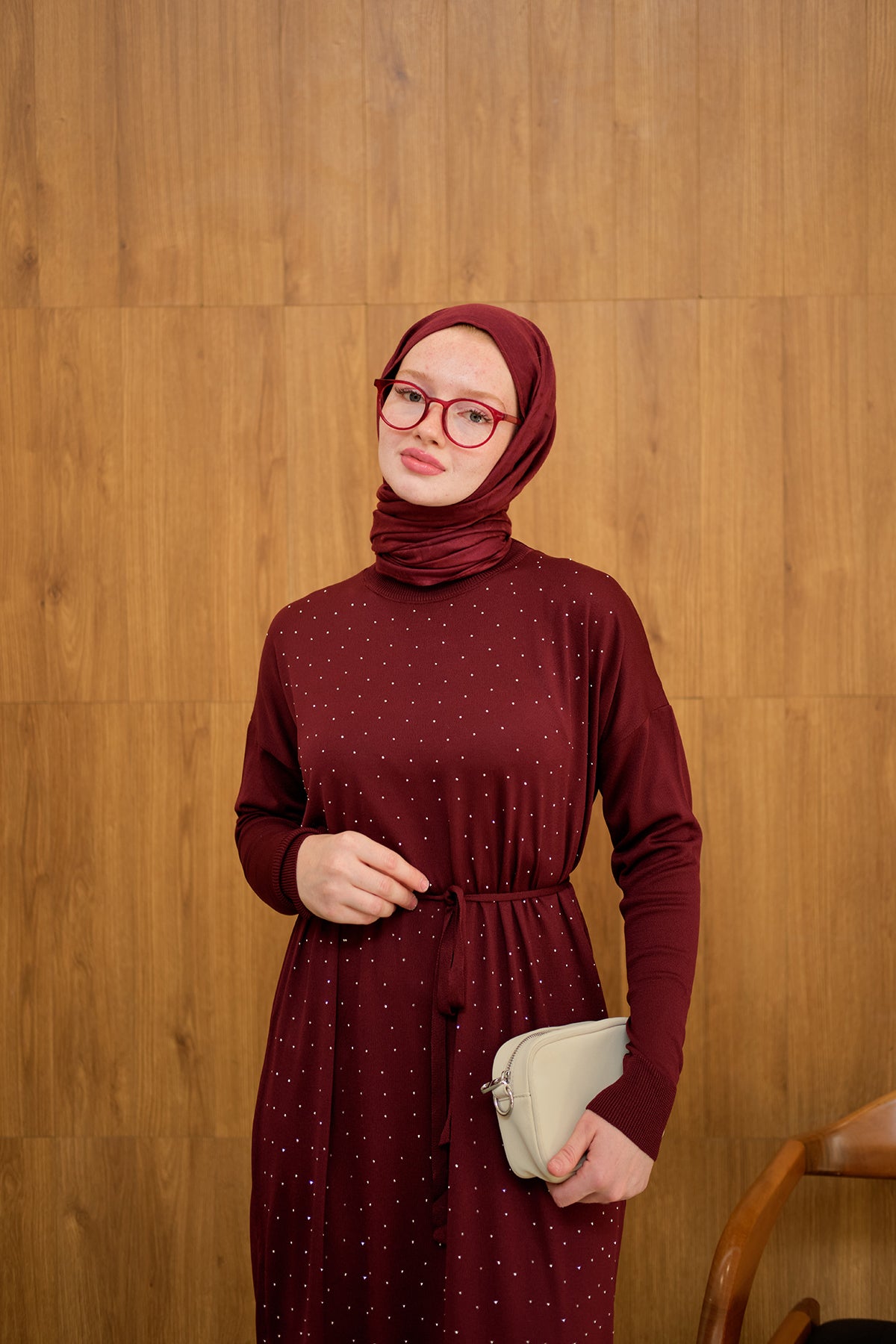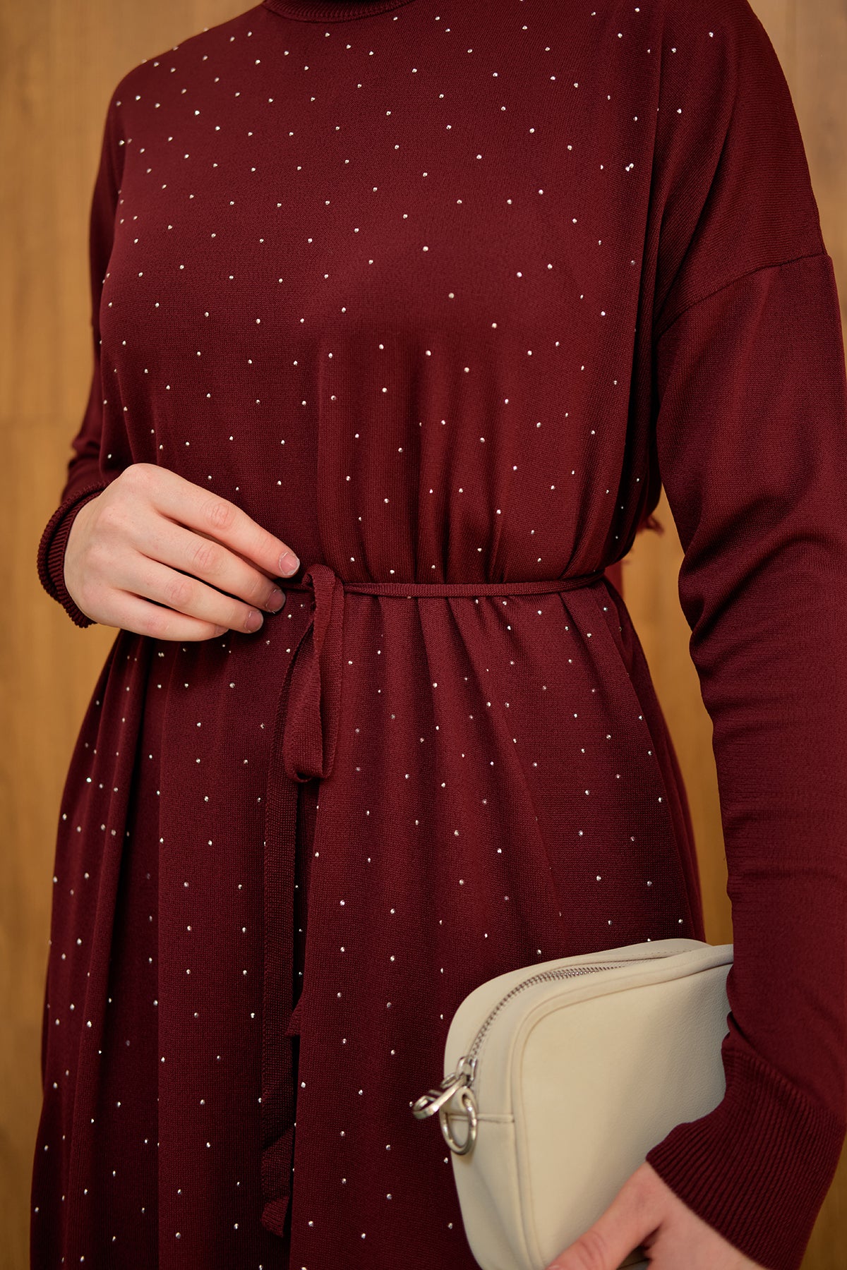 Bel Bağlamalı Taş Detay Triko Elbise Bordo