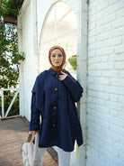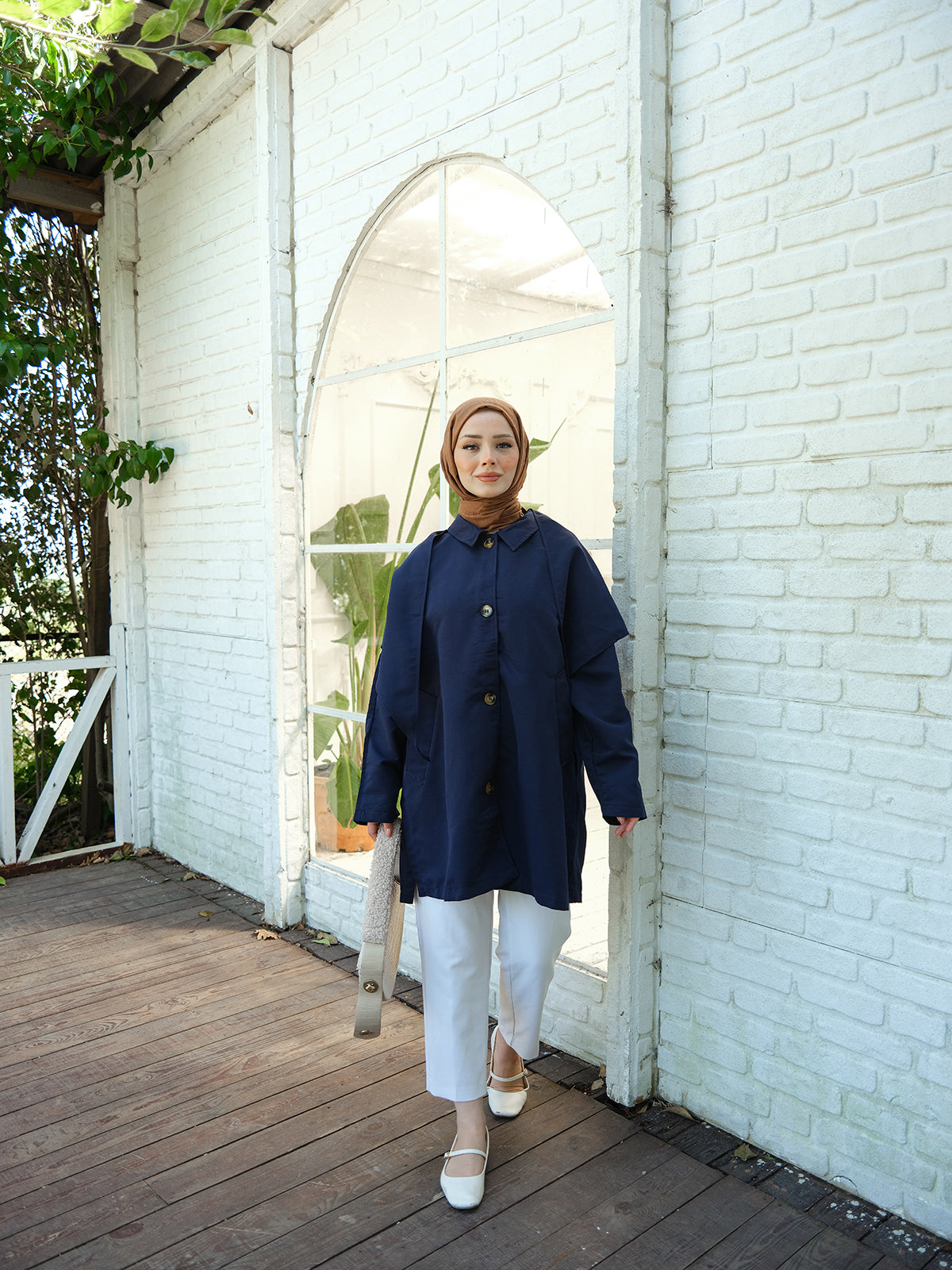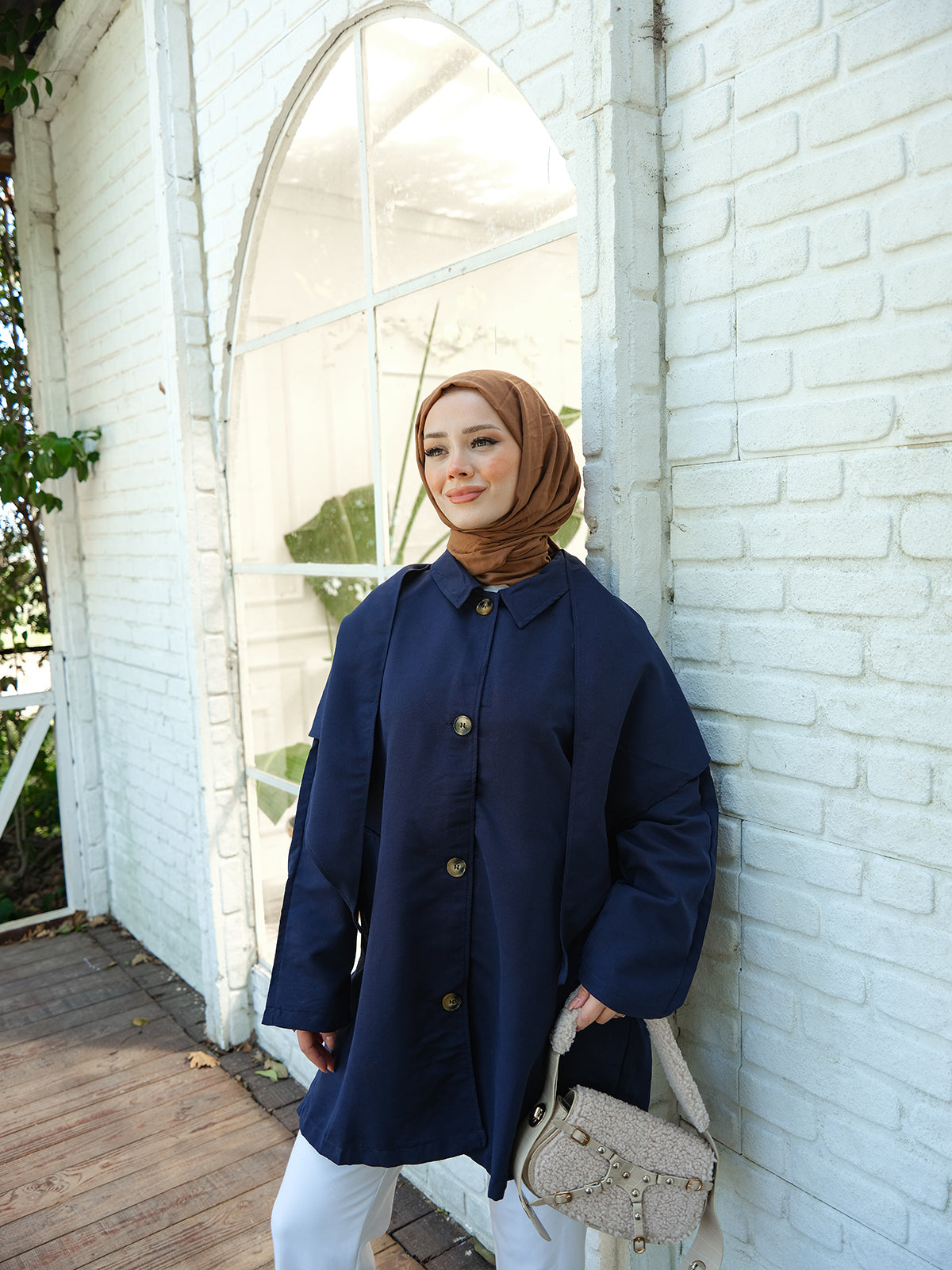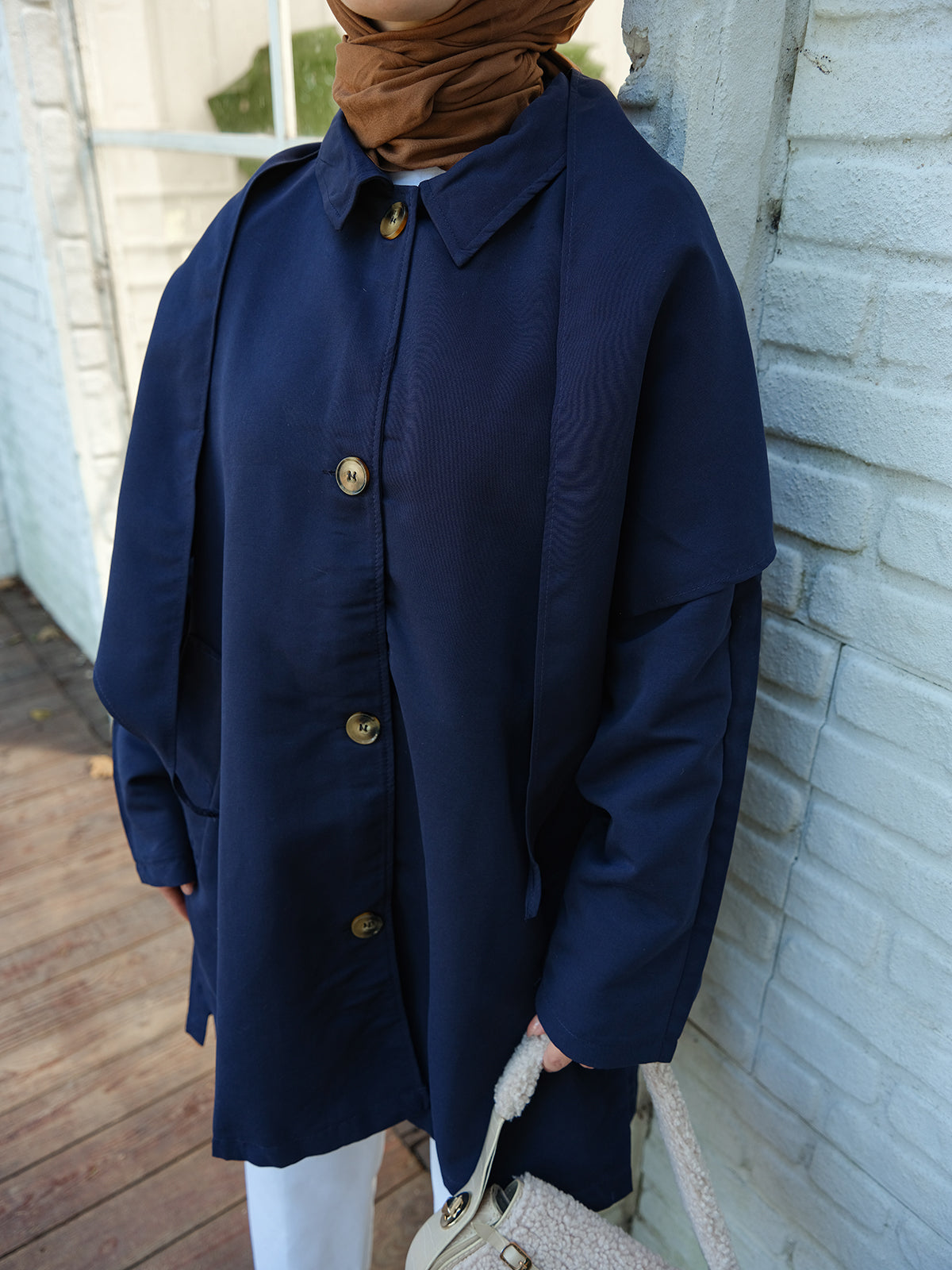Cape-Style Trench Coat with Pocket Detail – Navy Blue