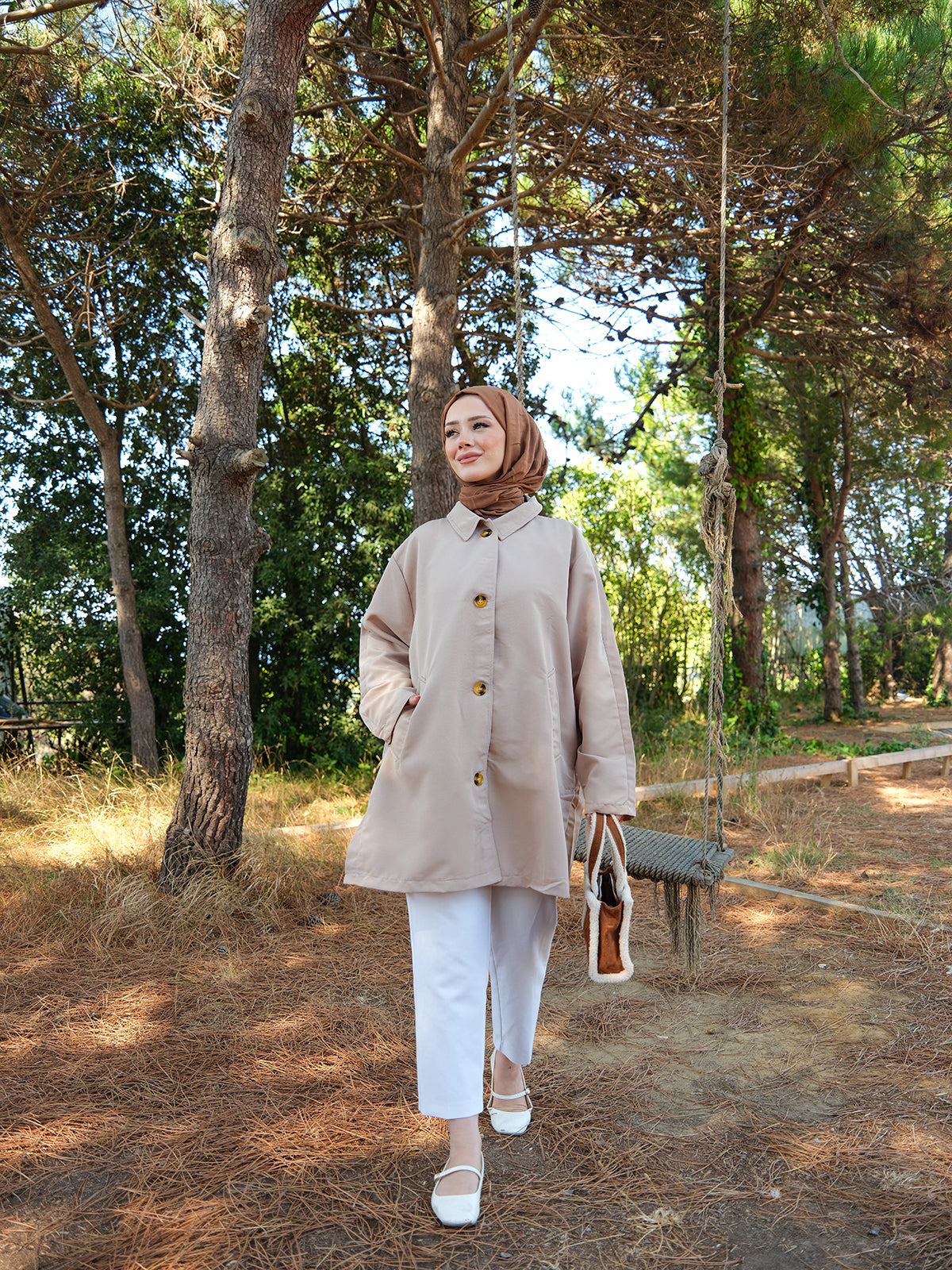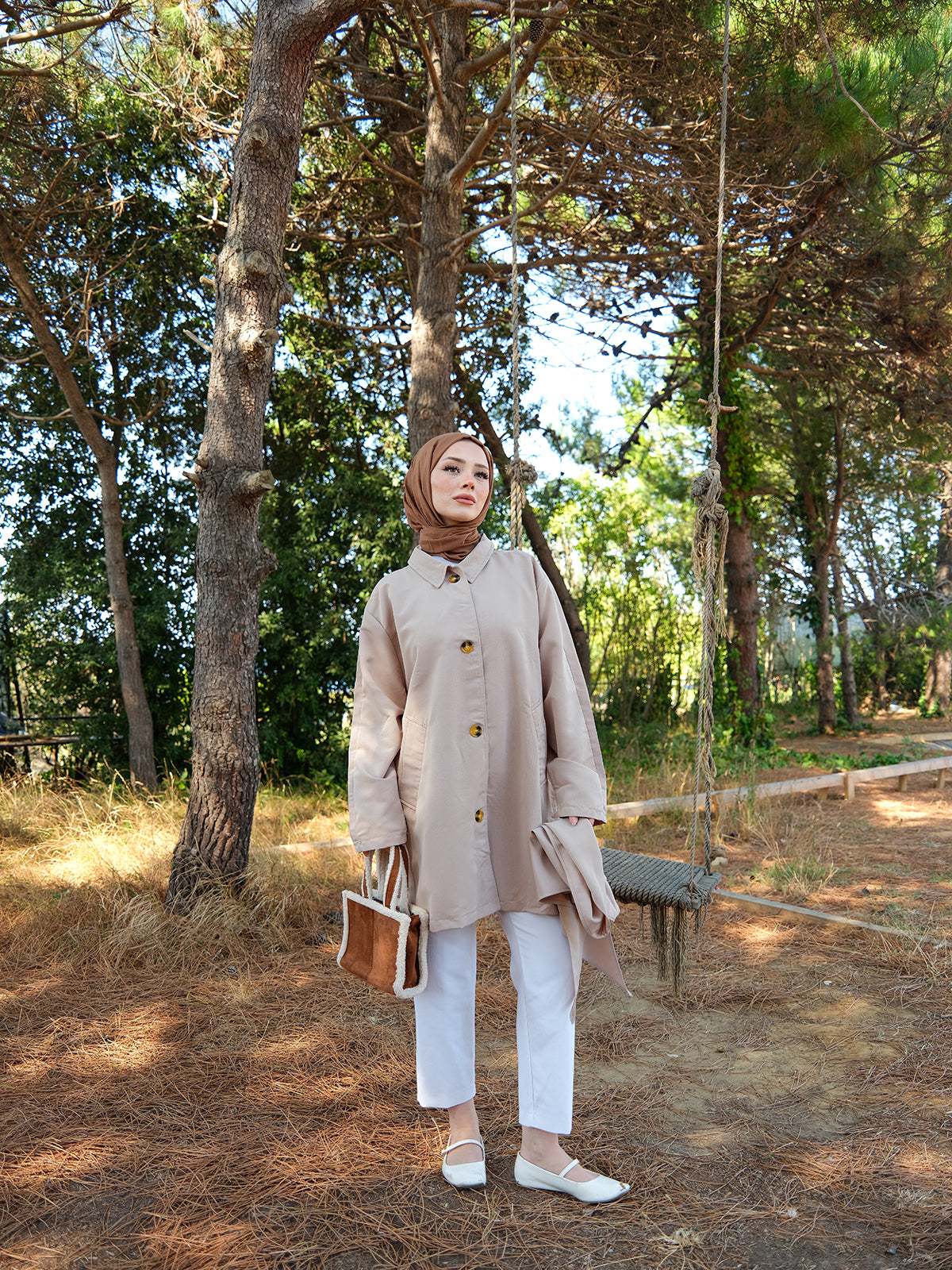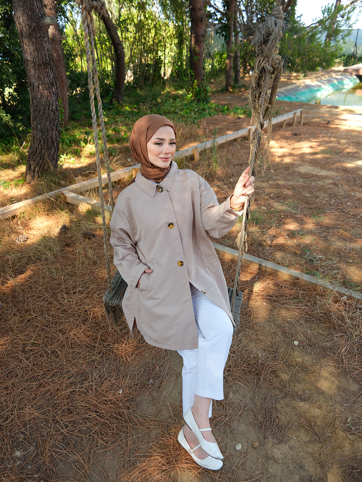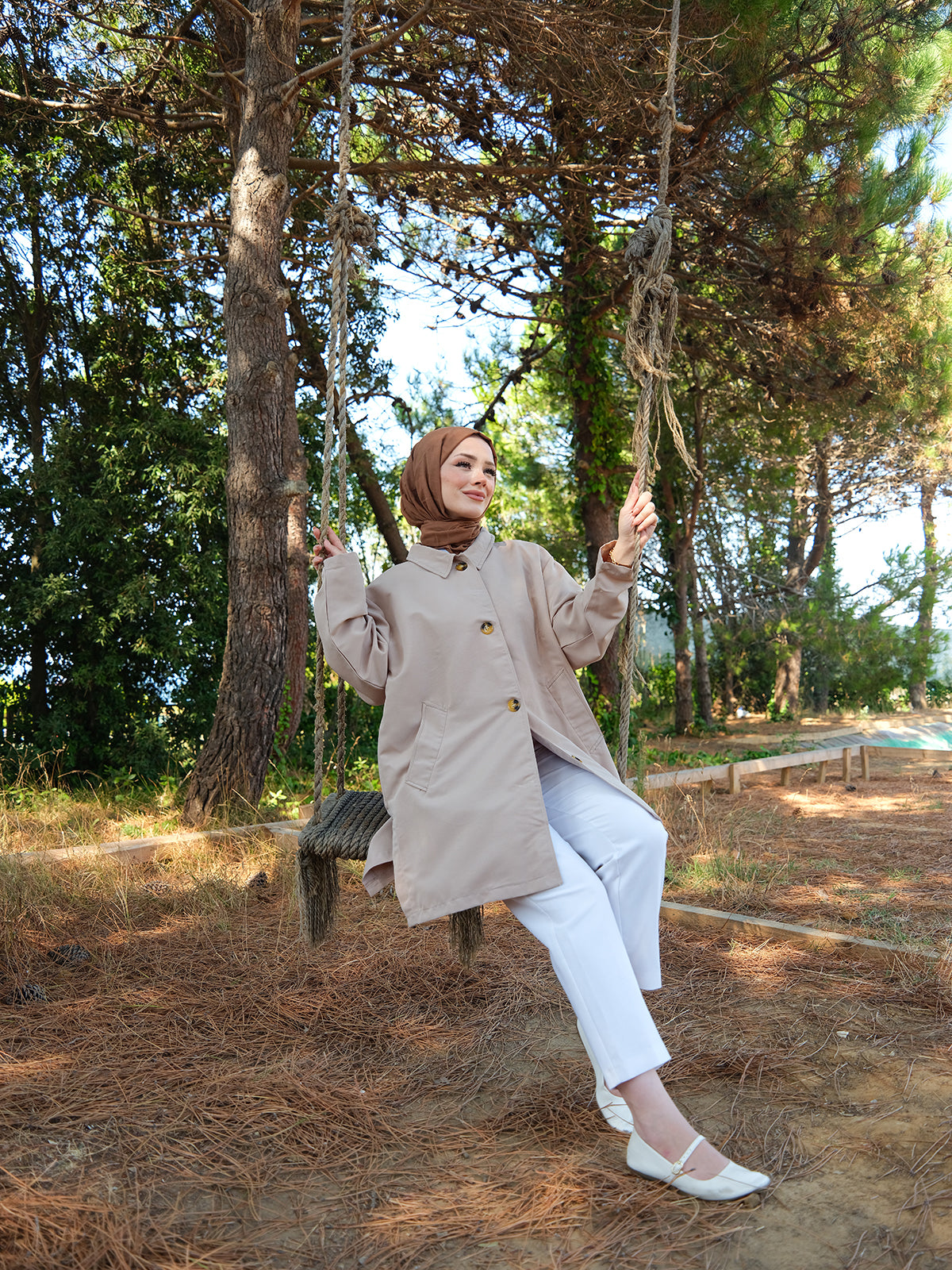 Cape-Style Trench Coat with Pocket Detail – Stone
