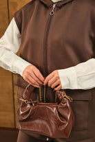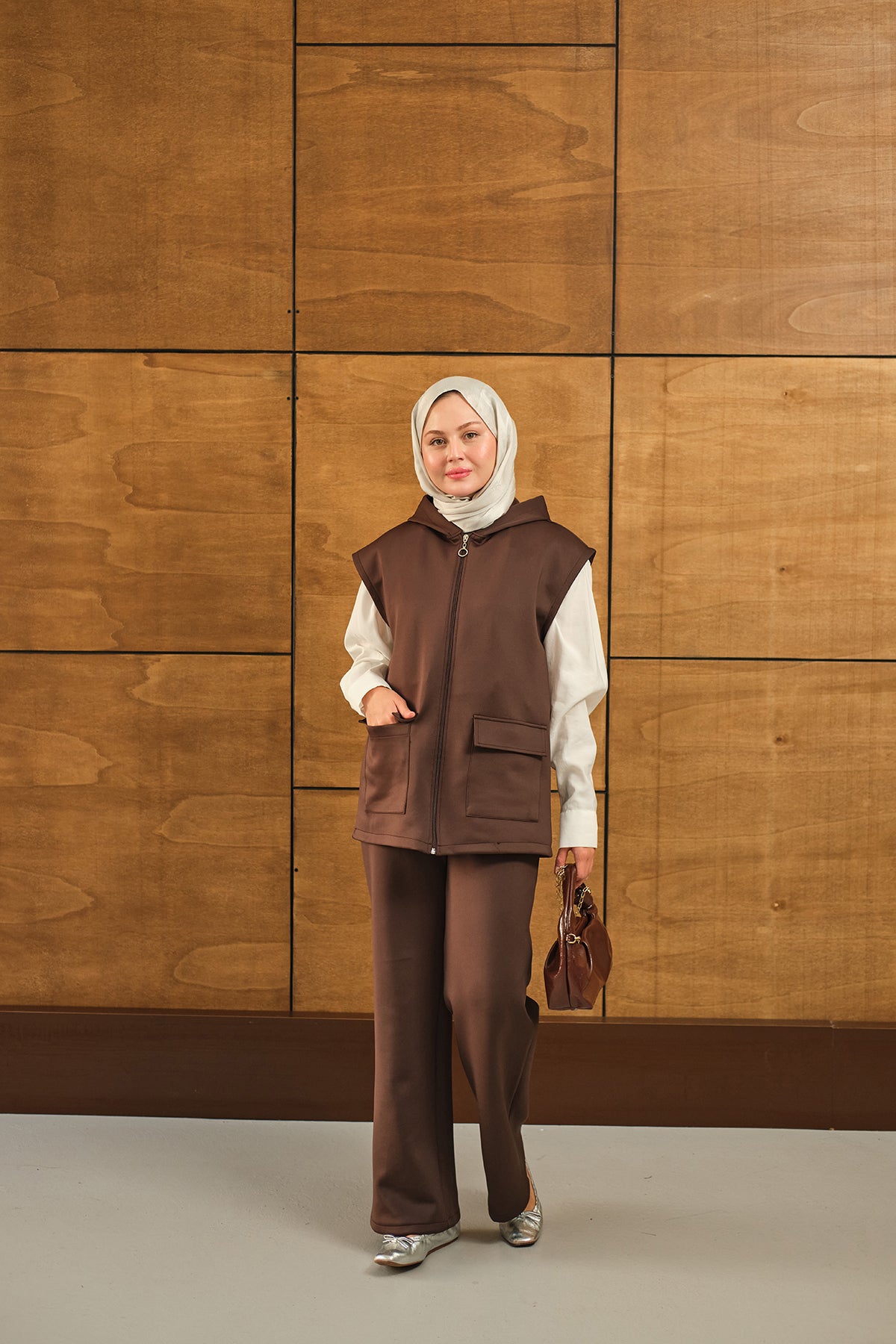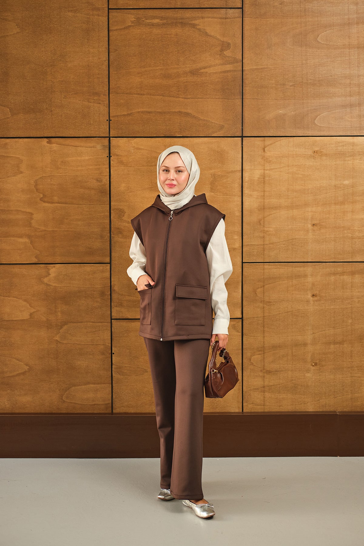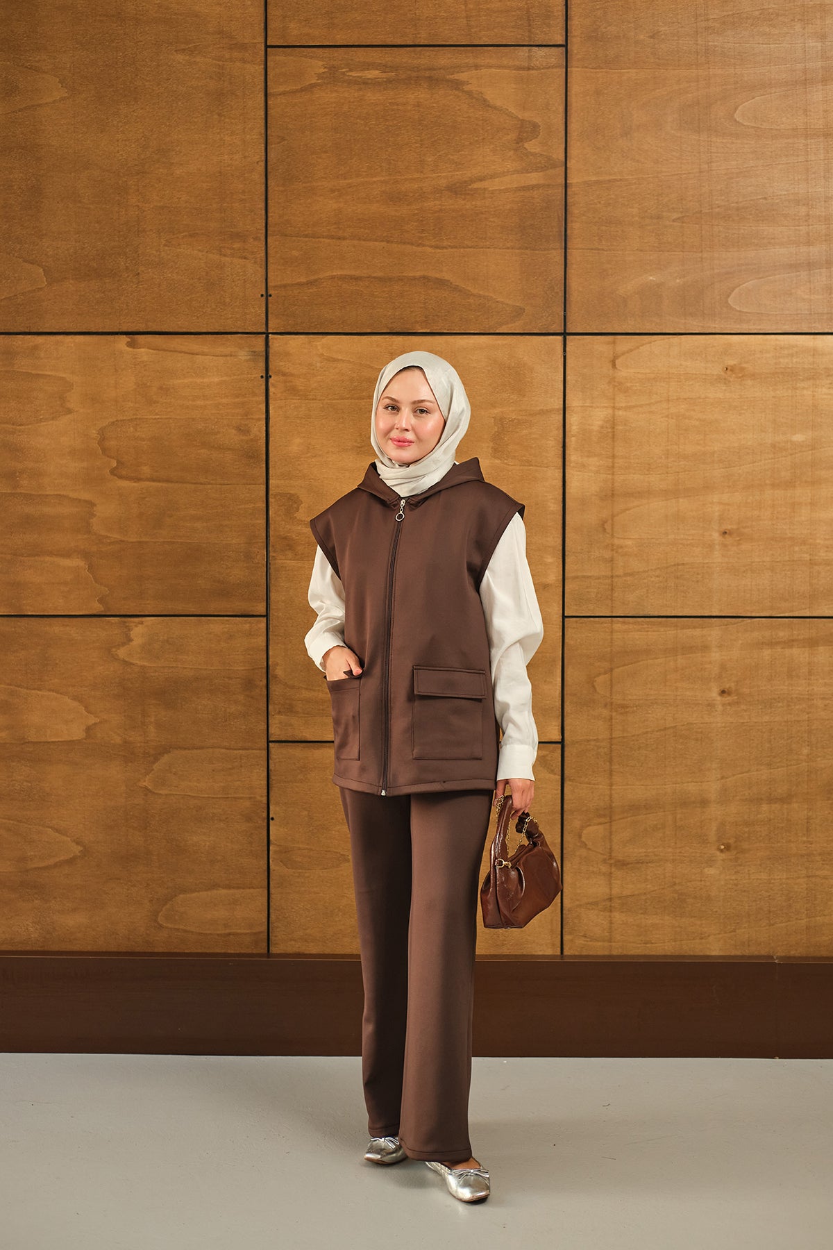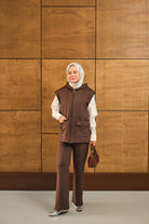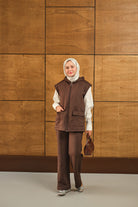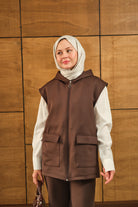 Çift Cepli Kapüşonlu Yelekli Takım Kahverengi