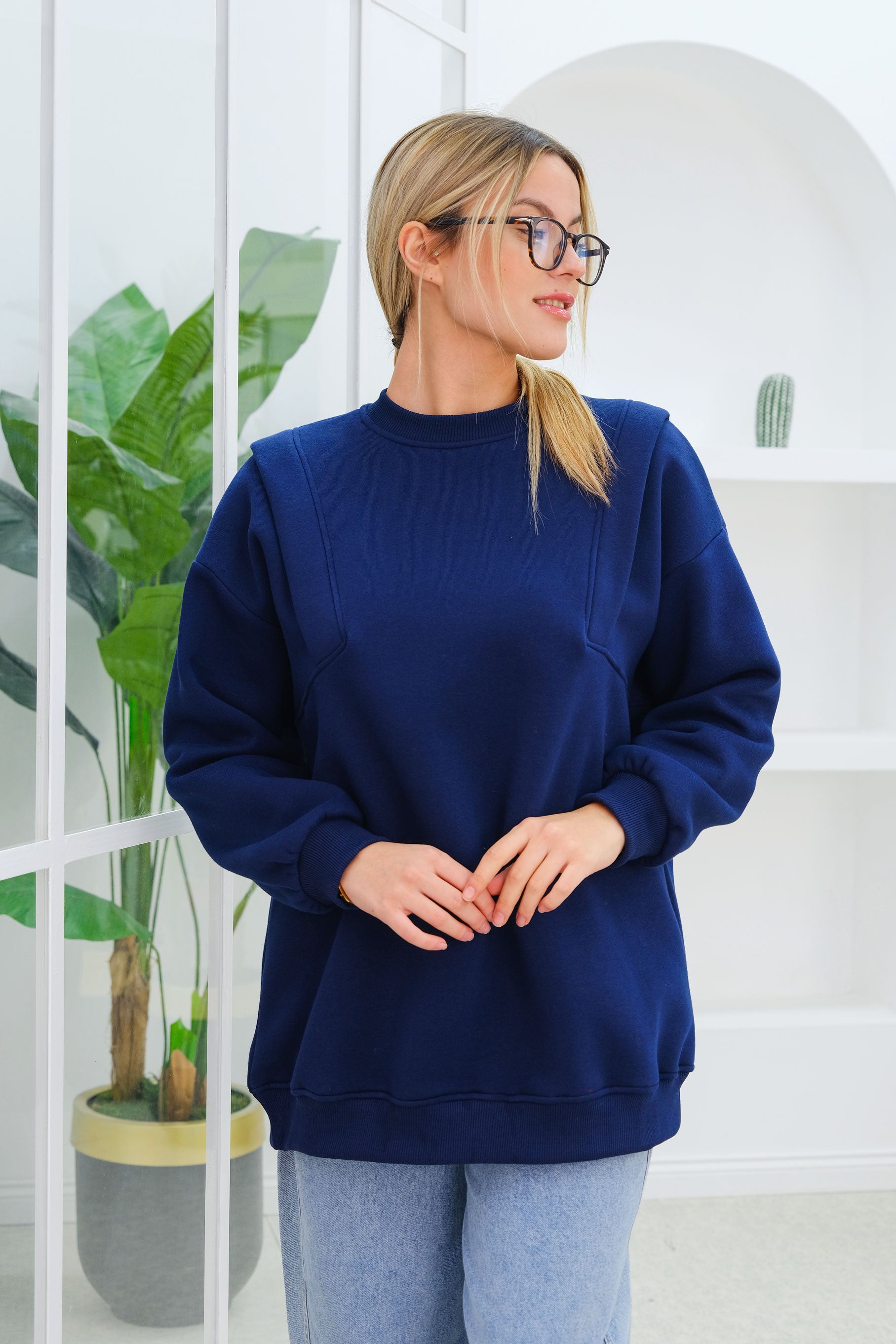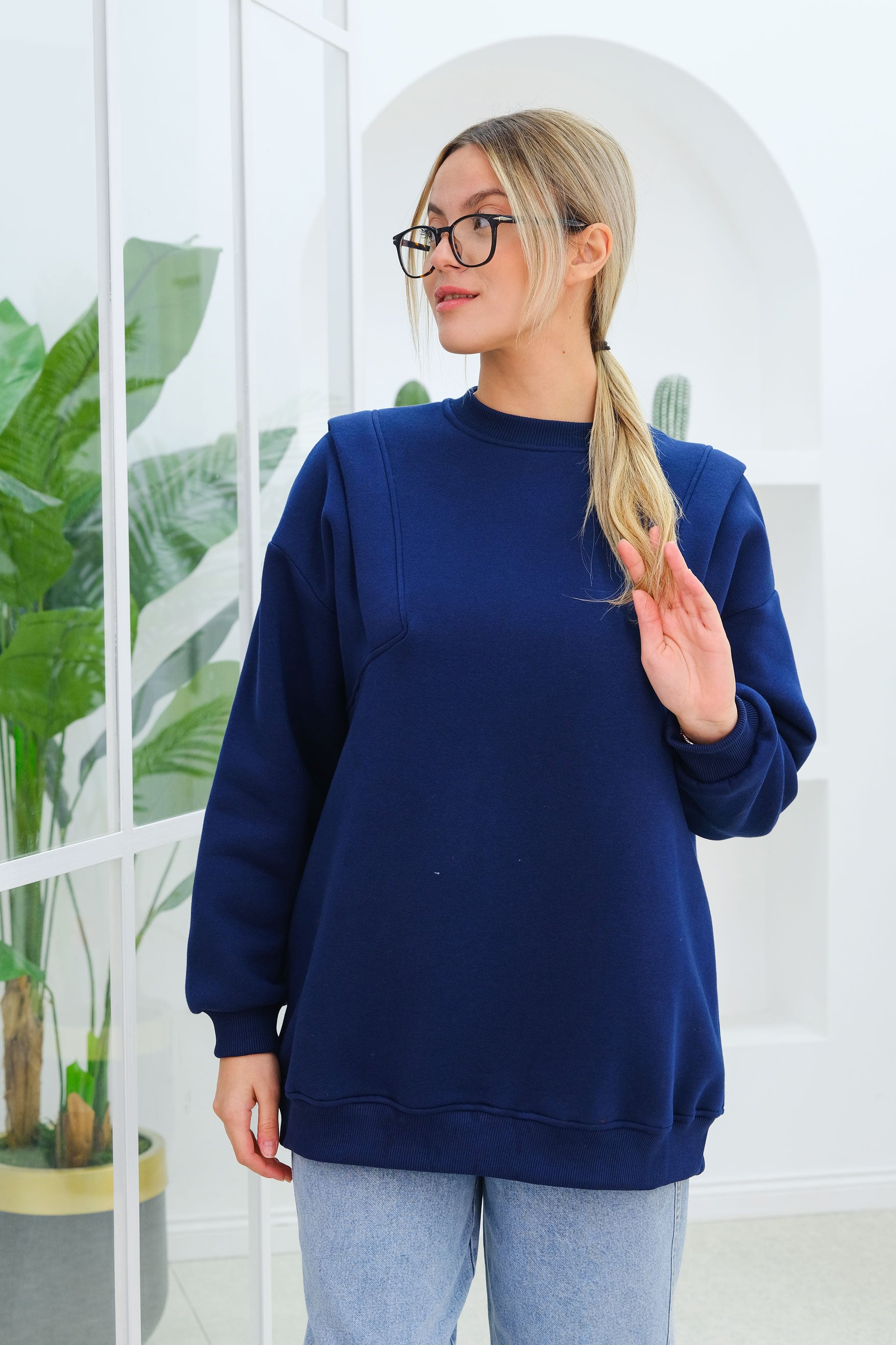 Double Shoulder Detailed Sweatshirt in Navy Blue