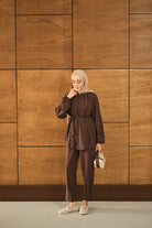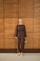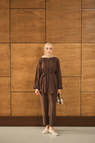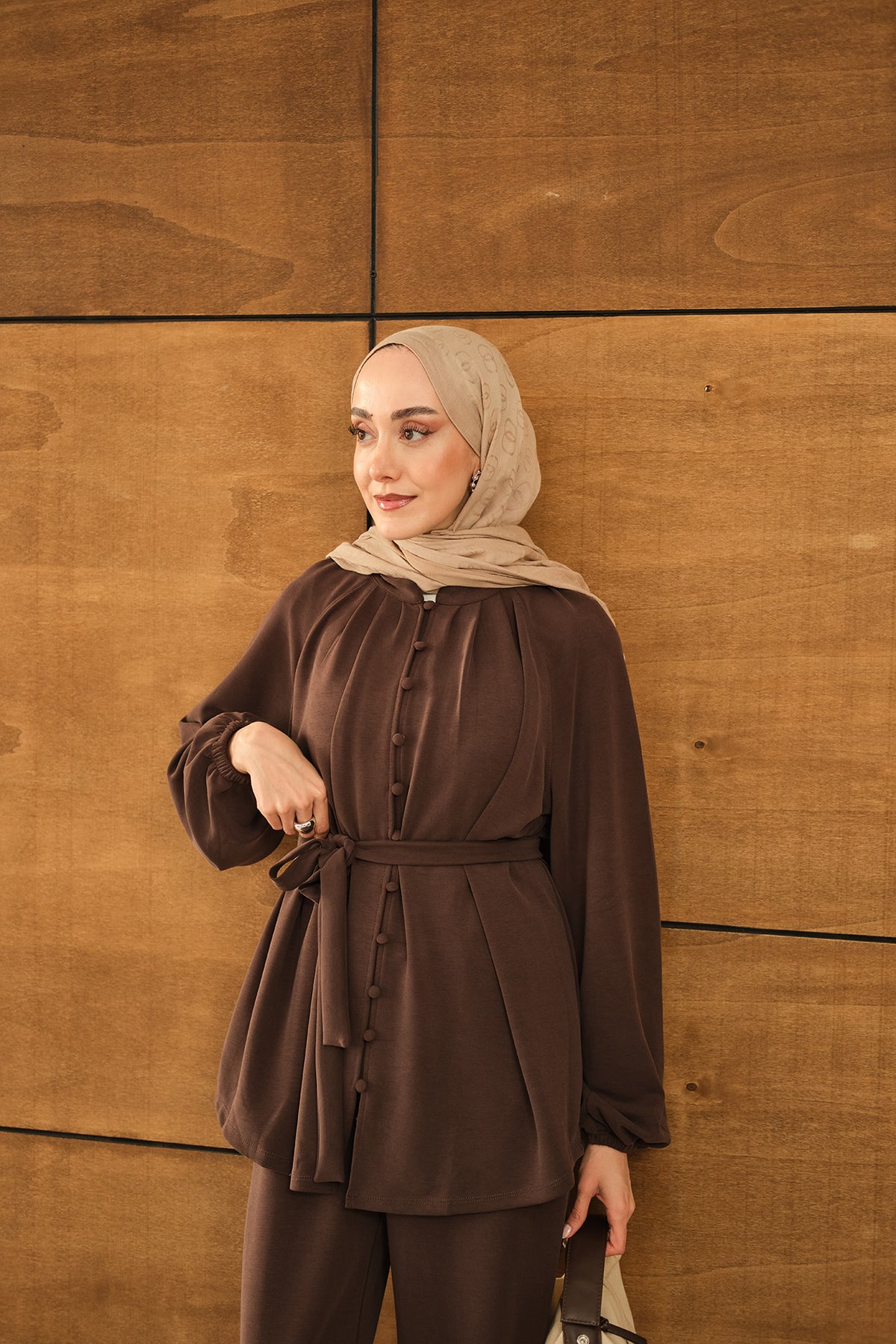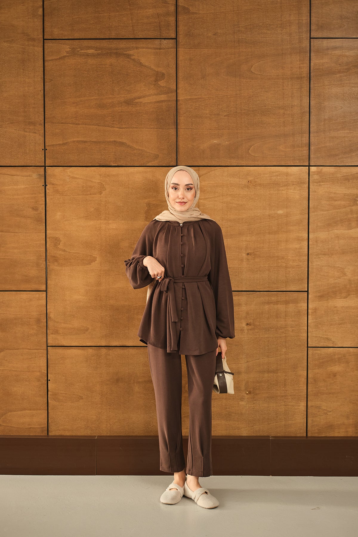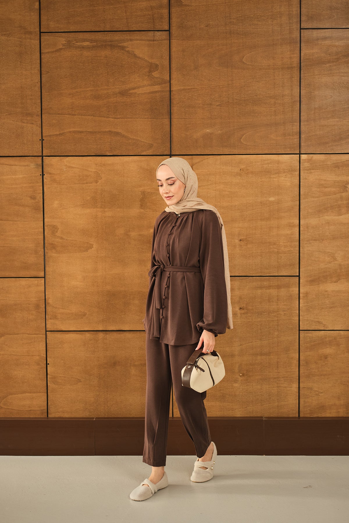 Düğme Detaylı Bel Bağlamalı Takım Kahverengi
