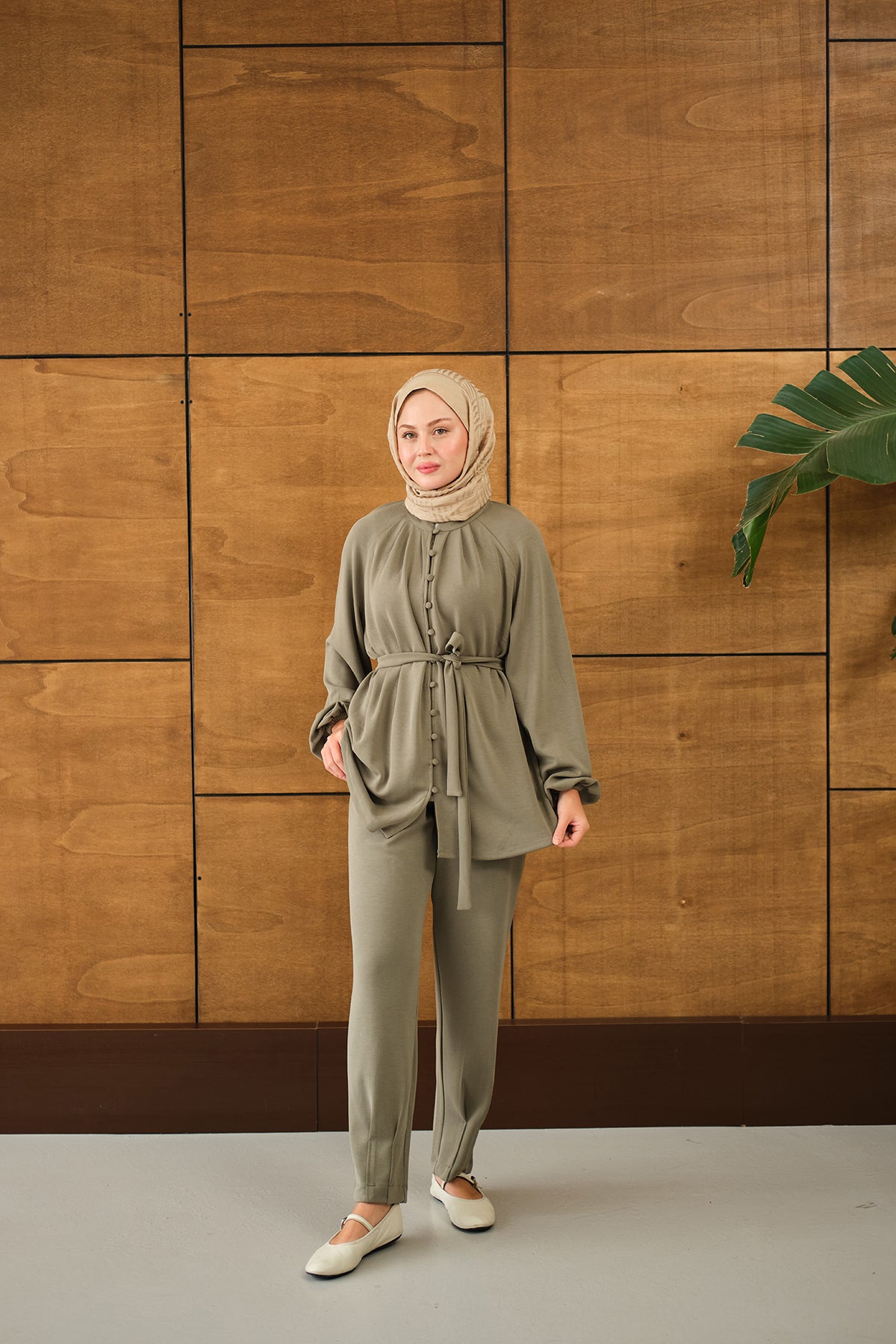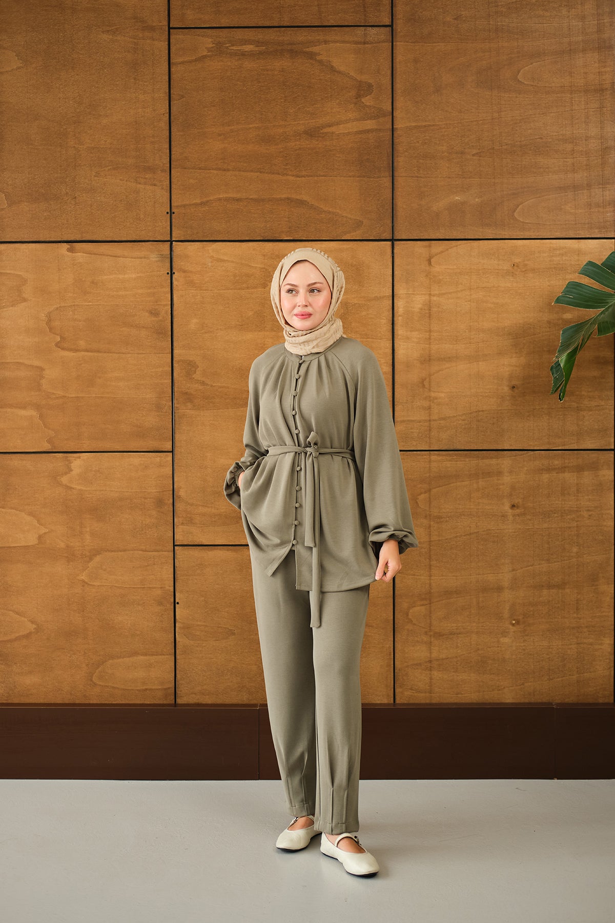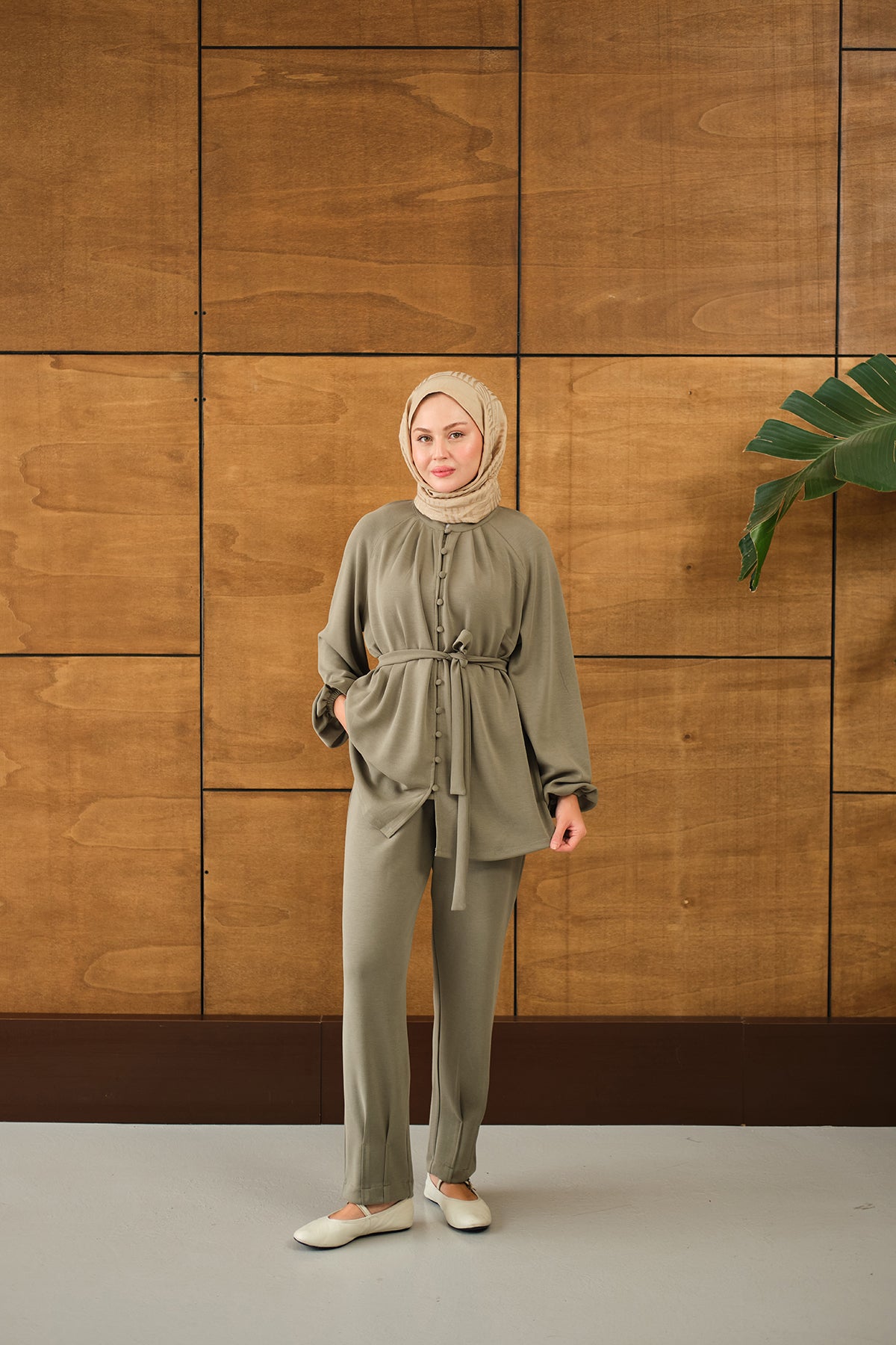 Düğme detaylı Bel Bağlamalı Takım Yeşil