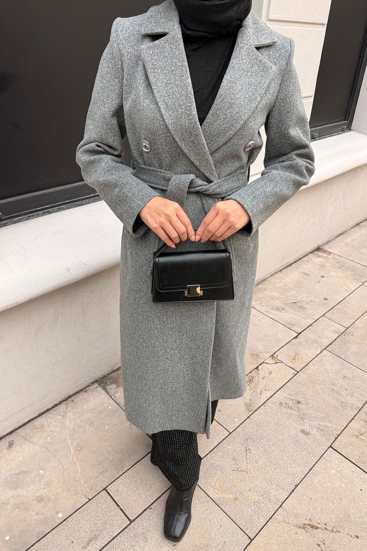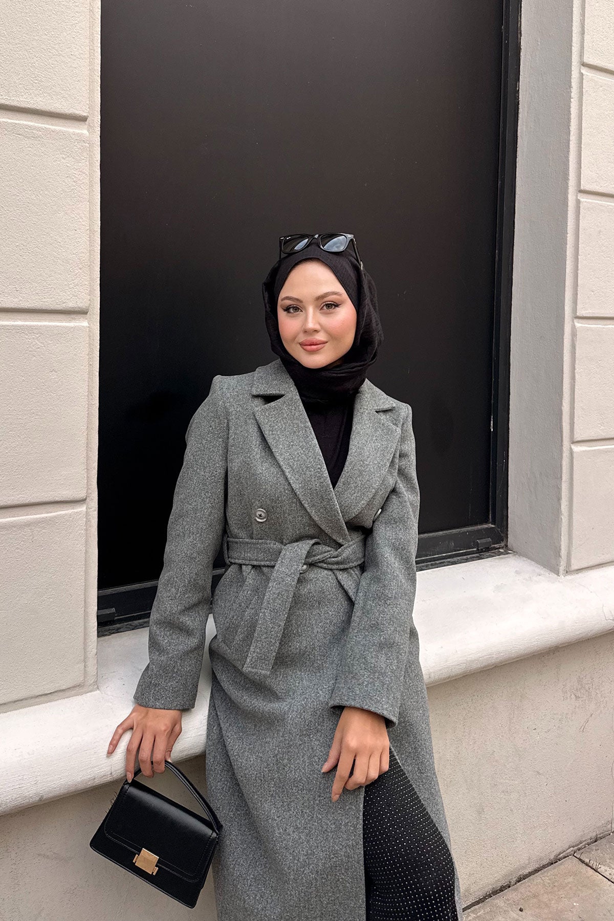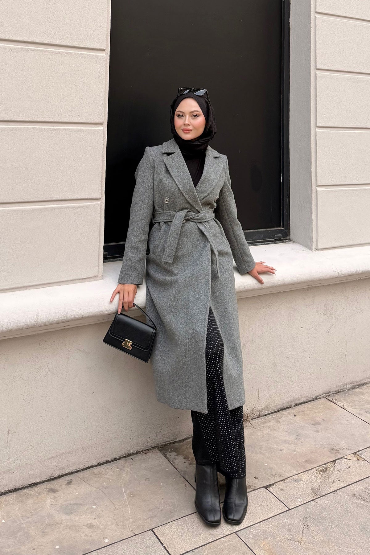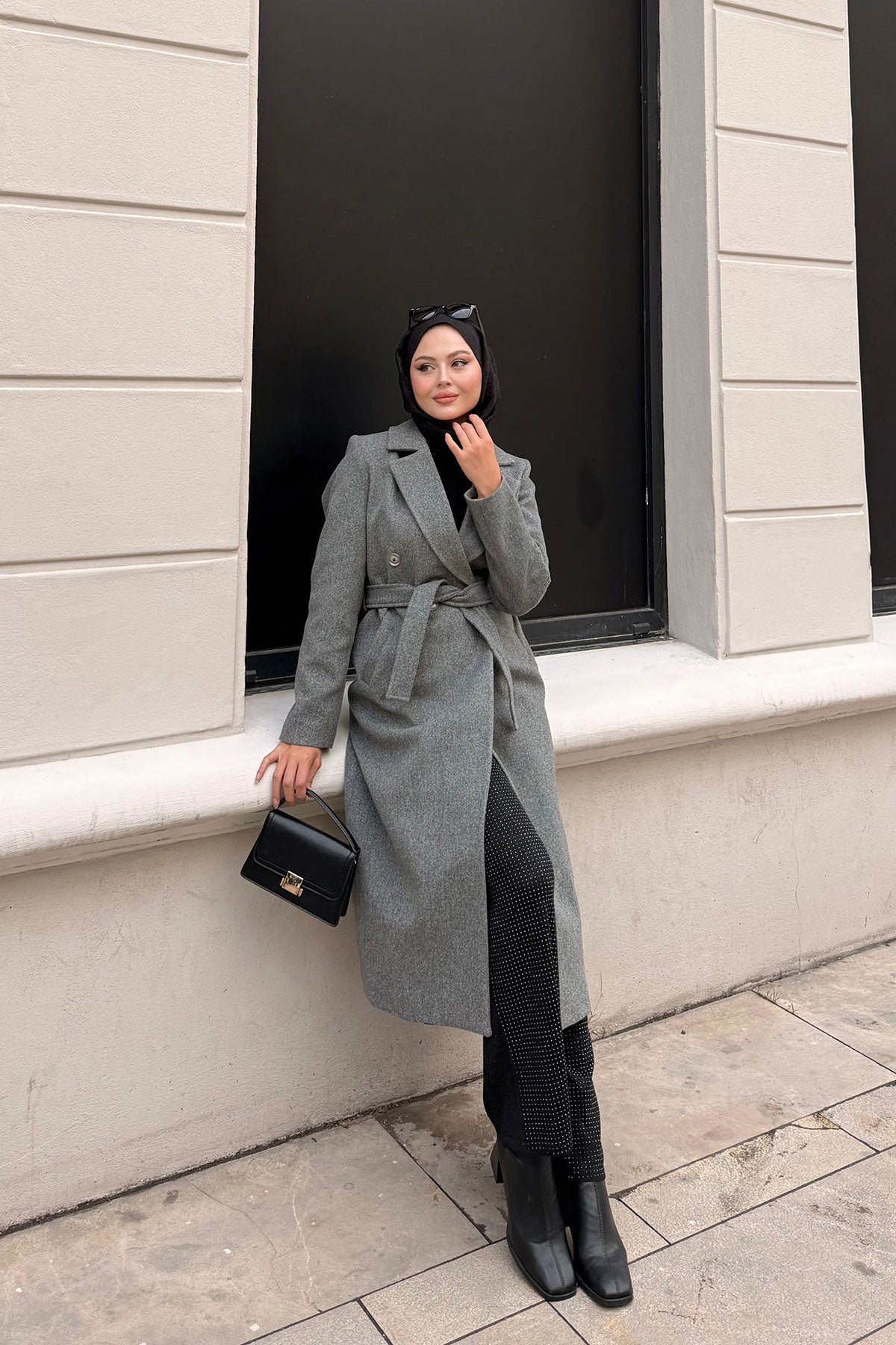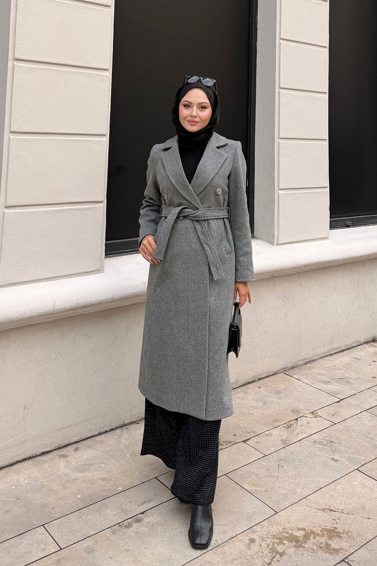 Düğme Ve Bel Bağlamalı Ara Boy Kaşe Kaban Füme