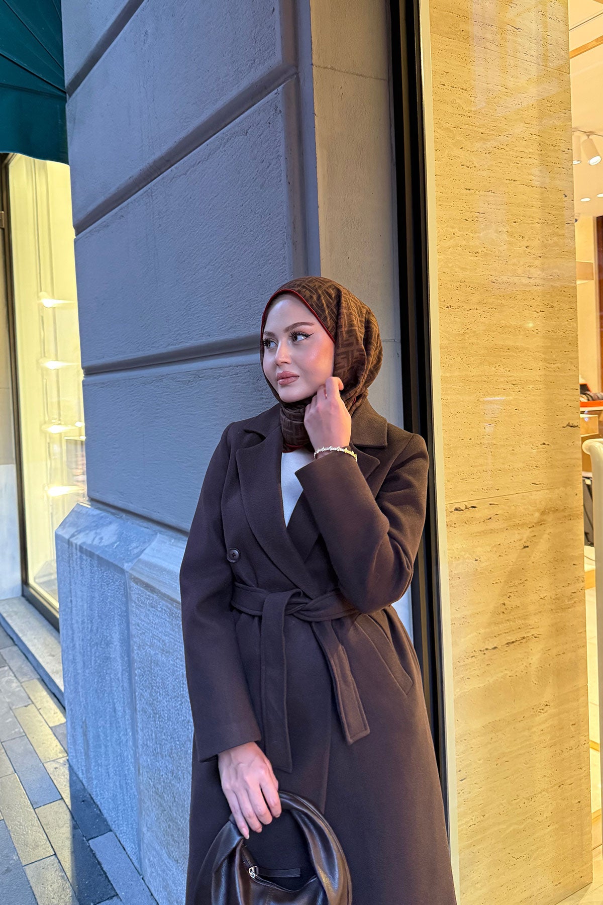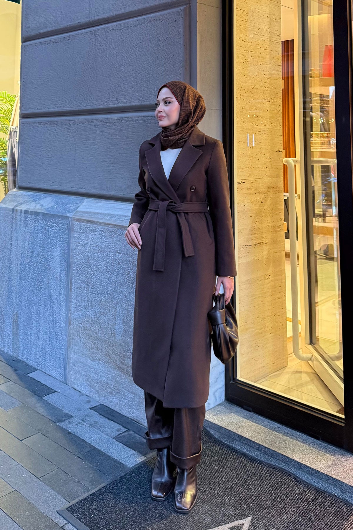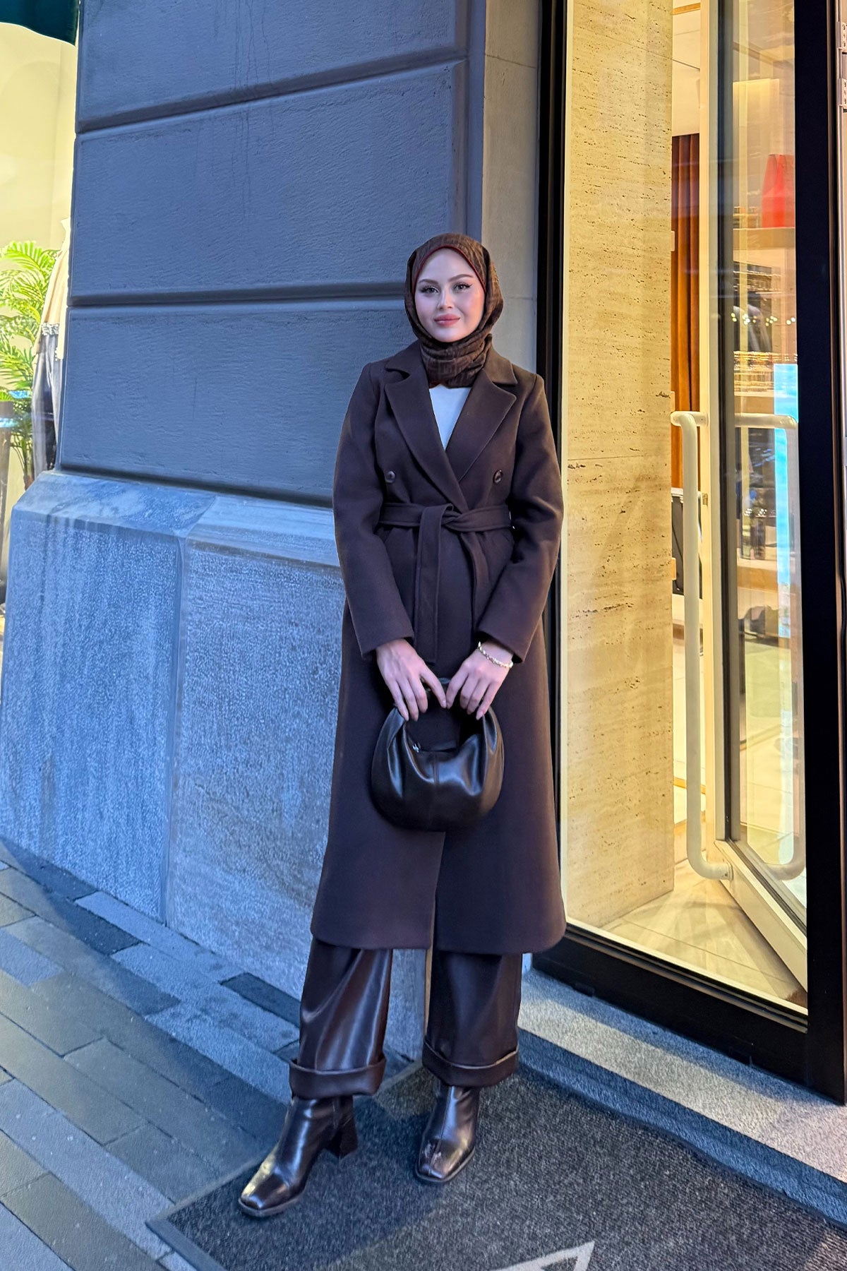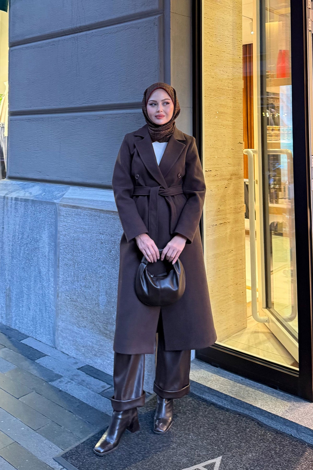 Düğme Ve Bel Bağlamalı Ara Boy Kaşe Kaban Kahverengi