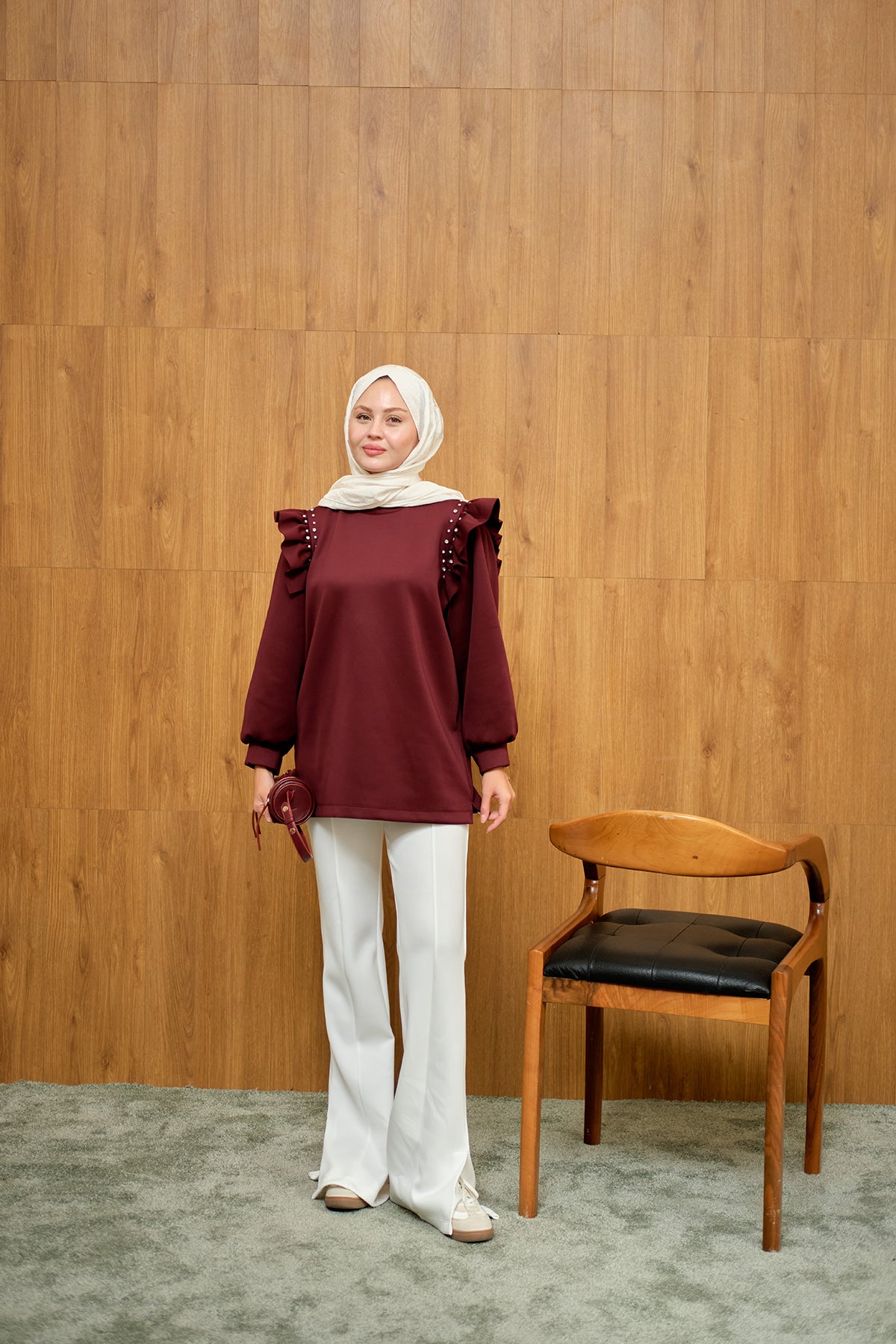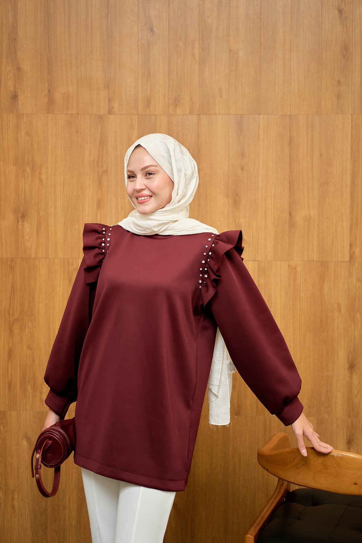 Fırfır Detay Taşlı Tunik Bordo