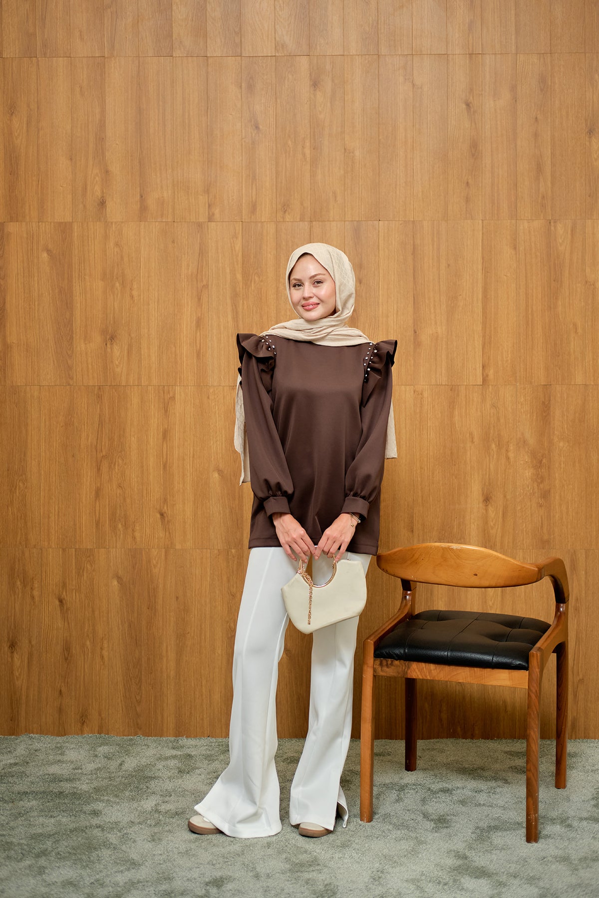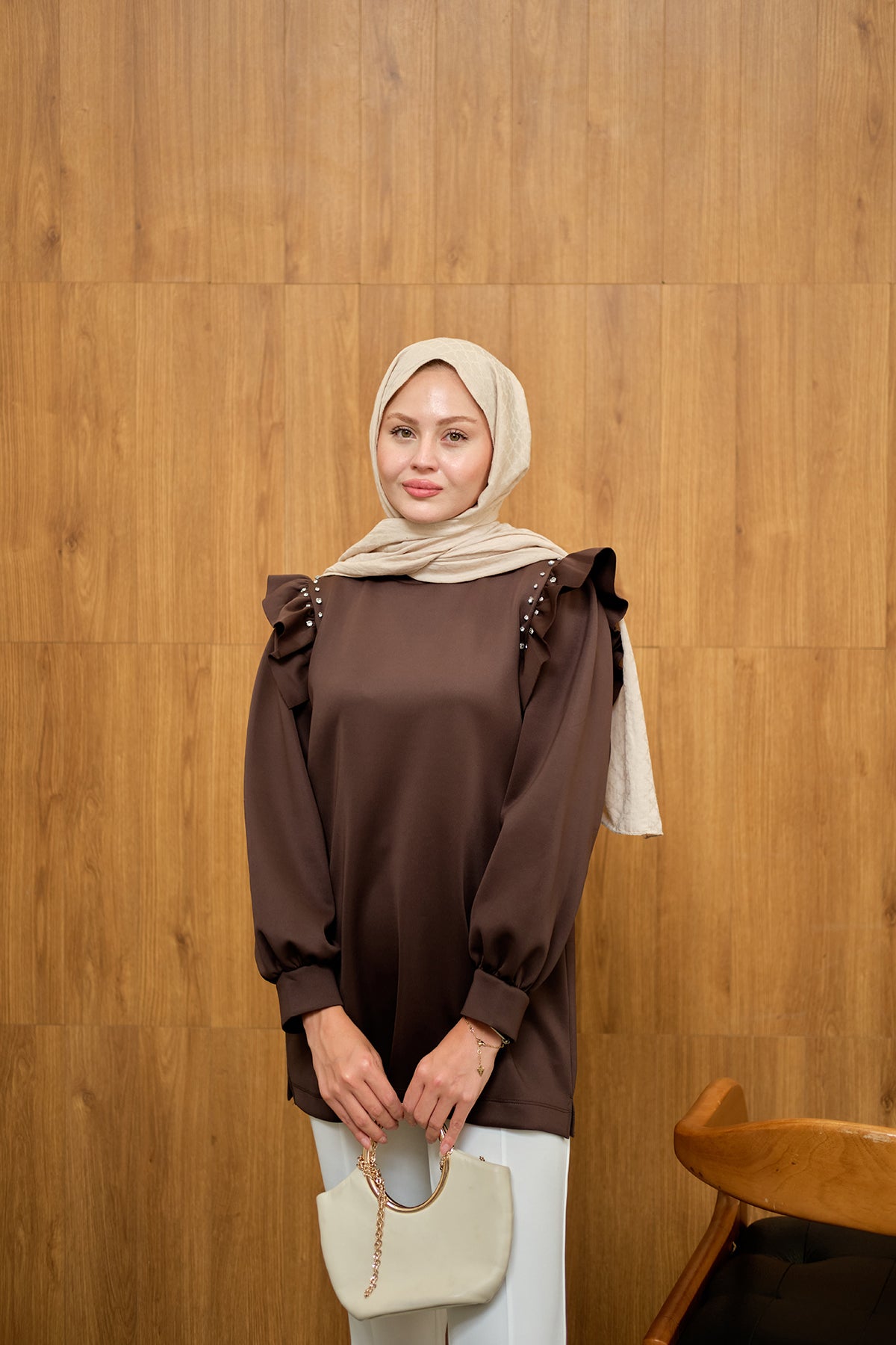 Fırfır Detay Taşlı Tunik Kahverengi