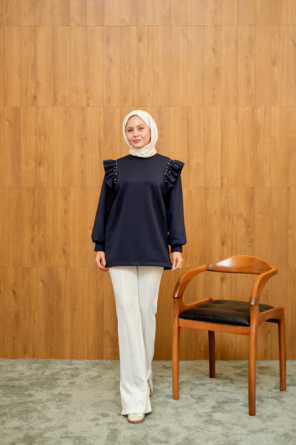 Fırfır Detay Taşlı Tunik Lacivert