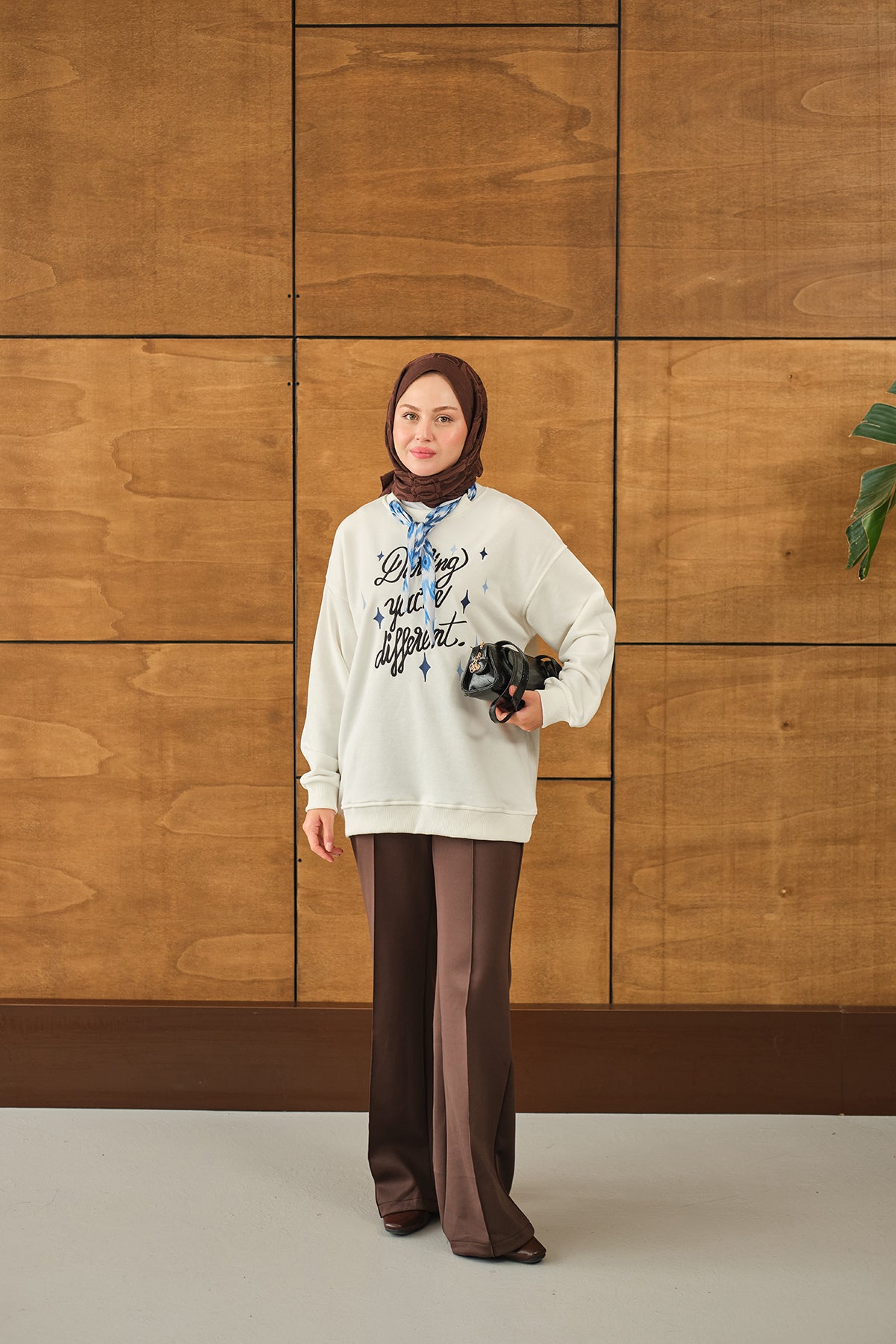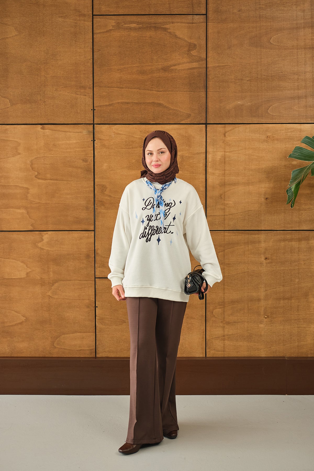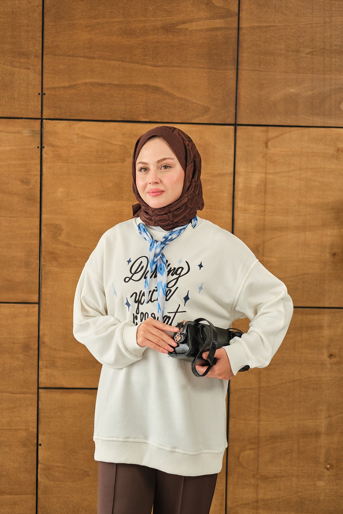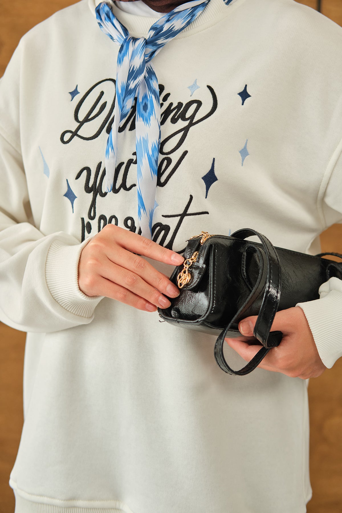 Fular Detay Yazı Nakışlı Sweat Beyaz