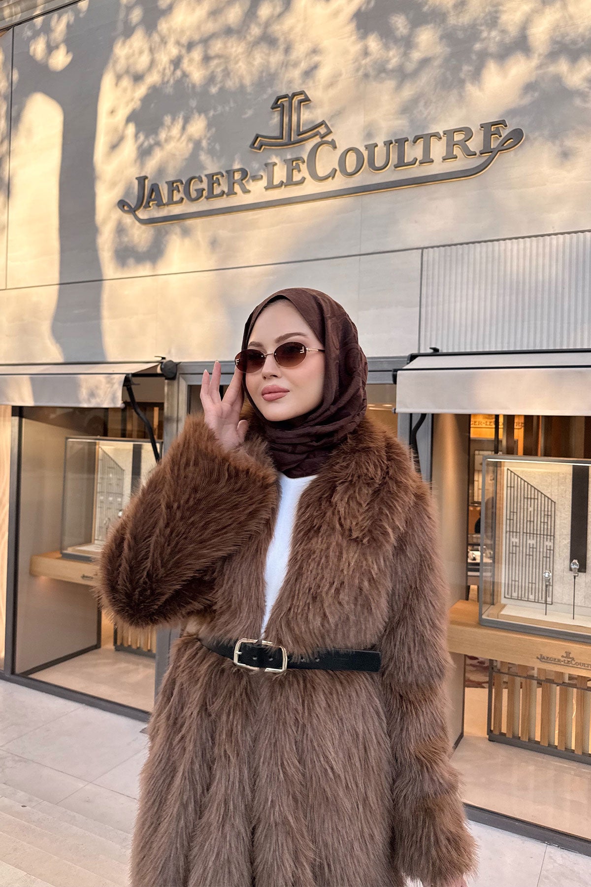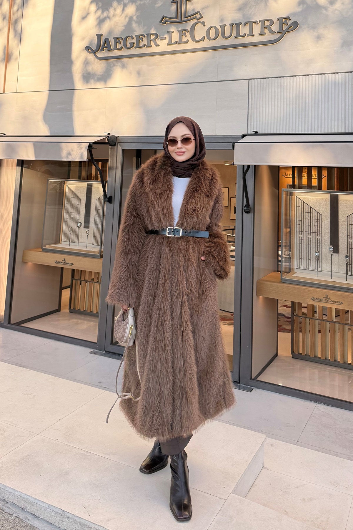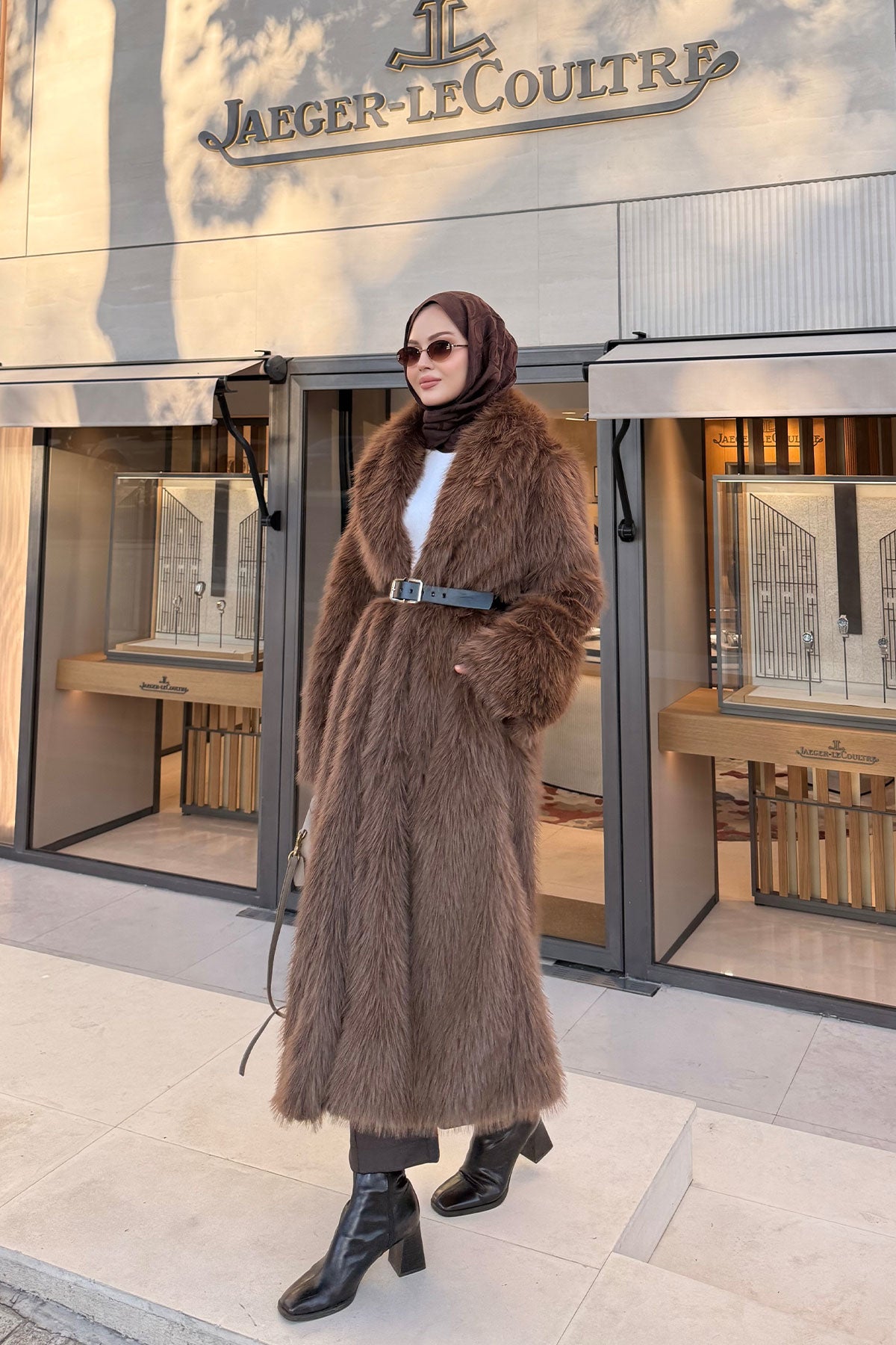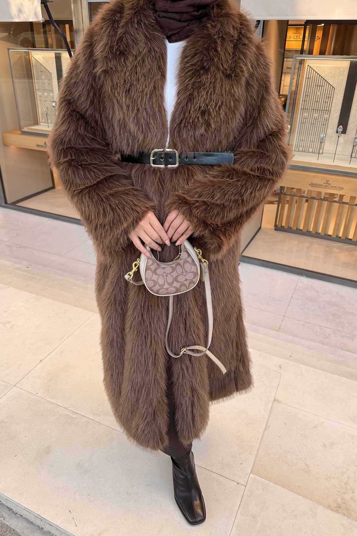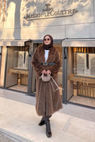 Fur Coat with Belt Detail - Brown