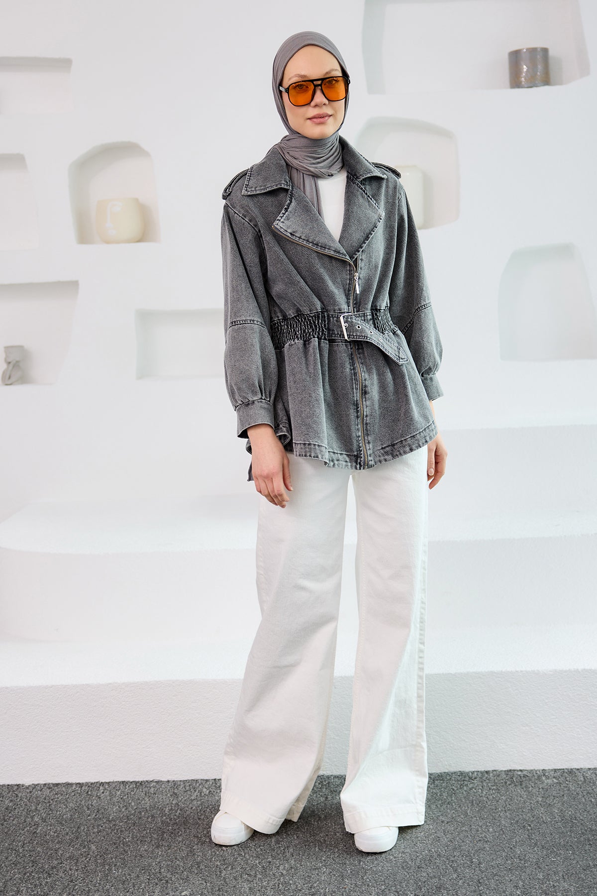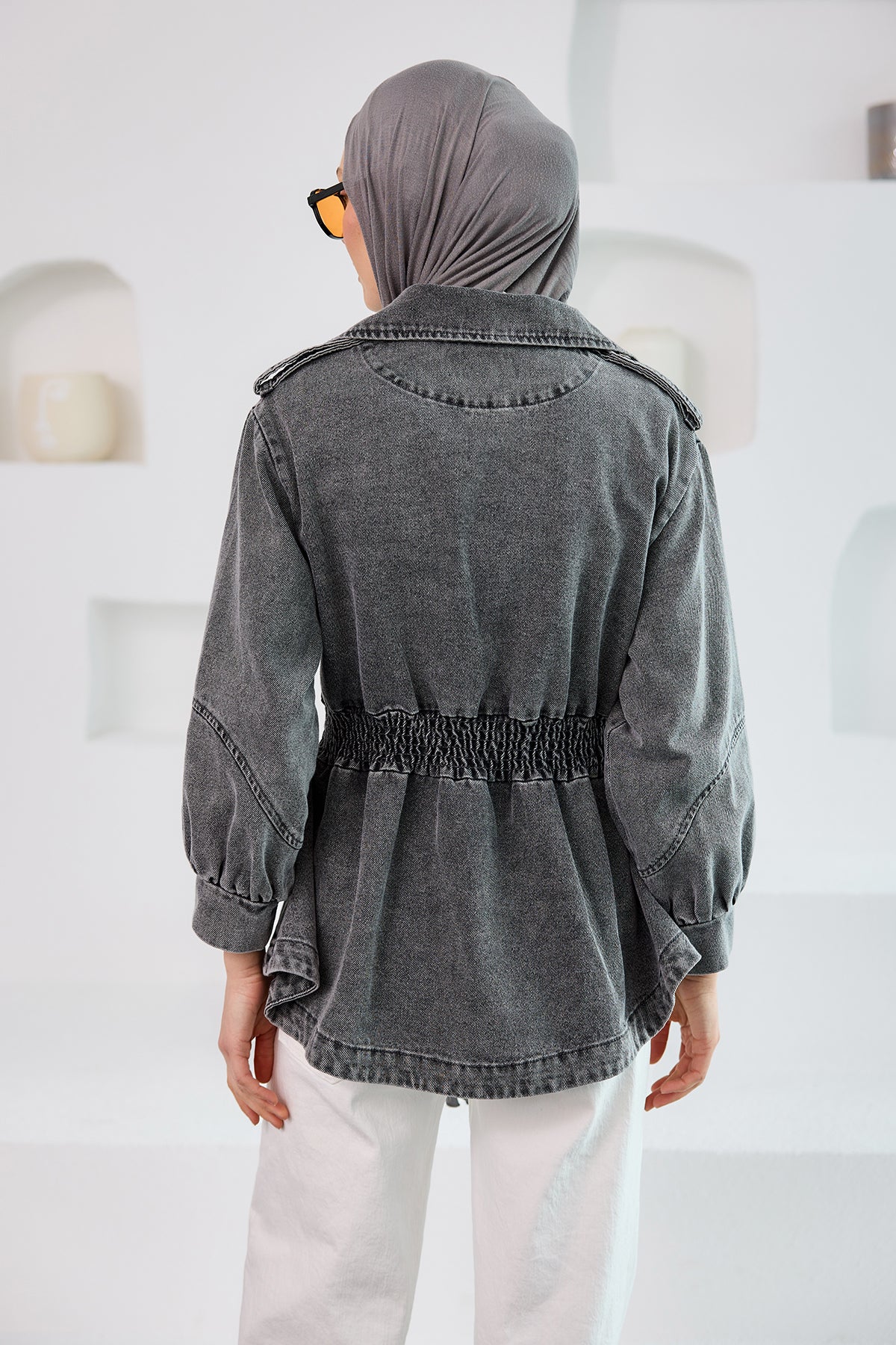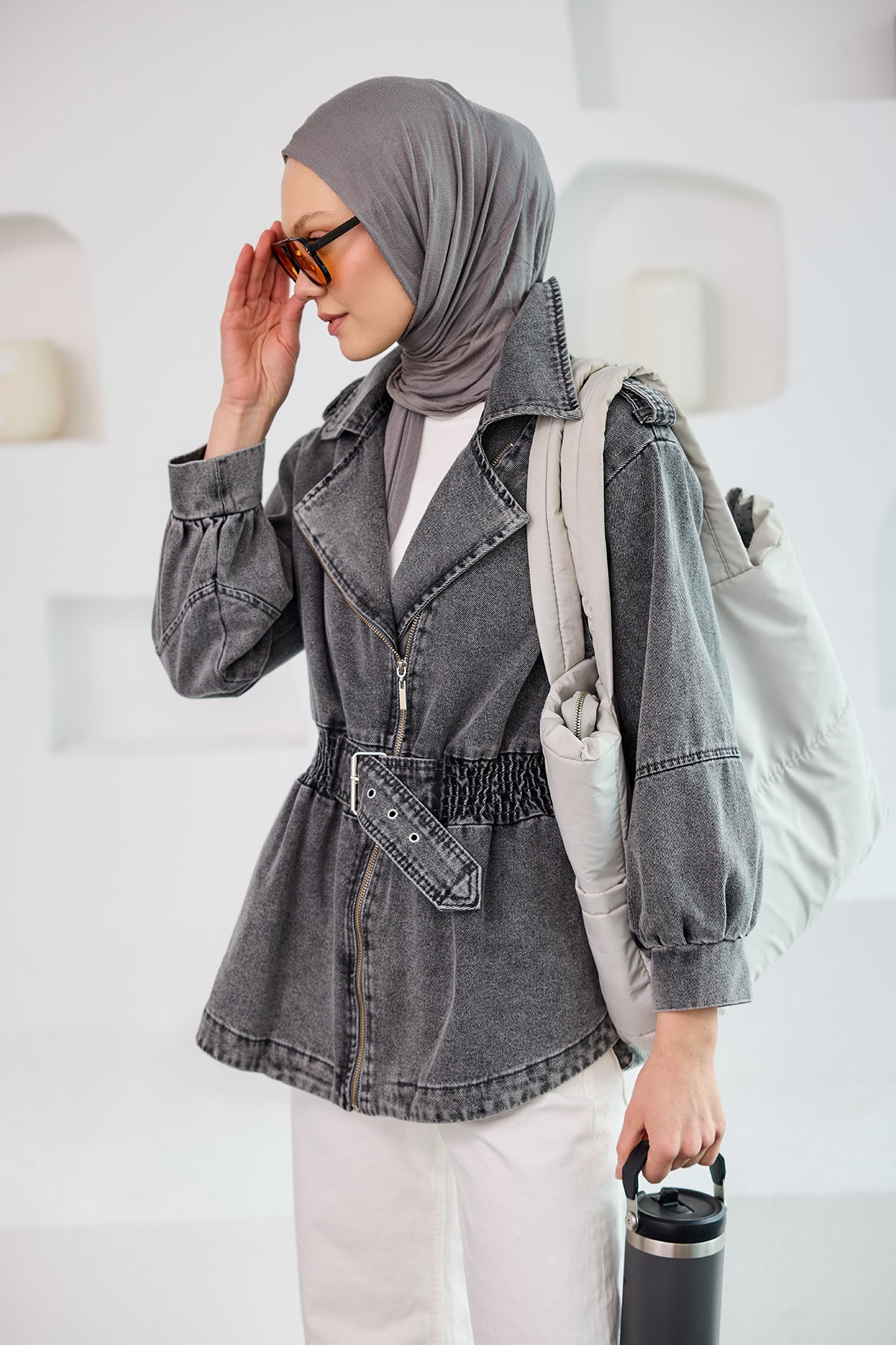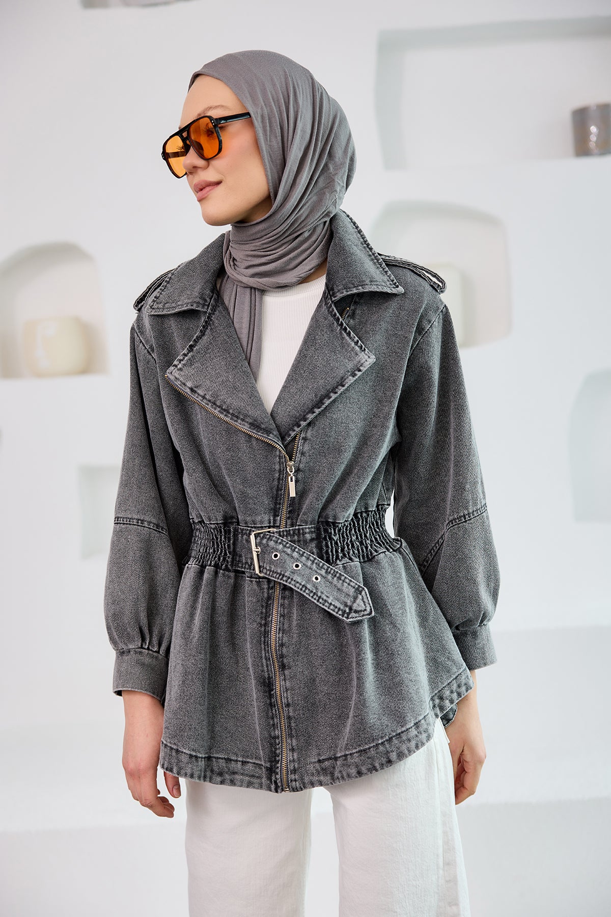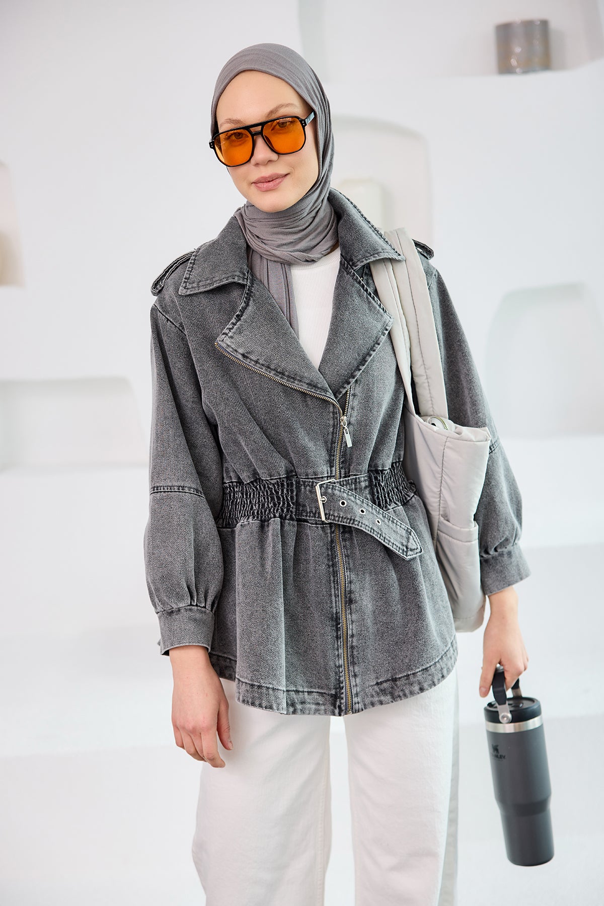 Jean Jacket with Drawstring Belt Detail in Charcoal Grey