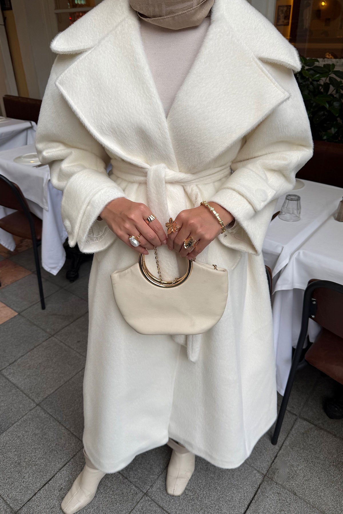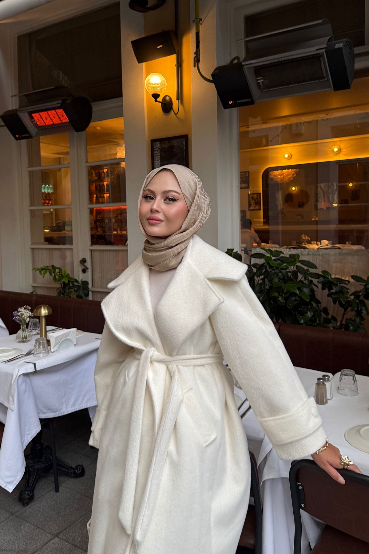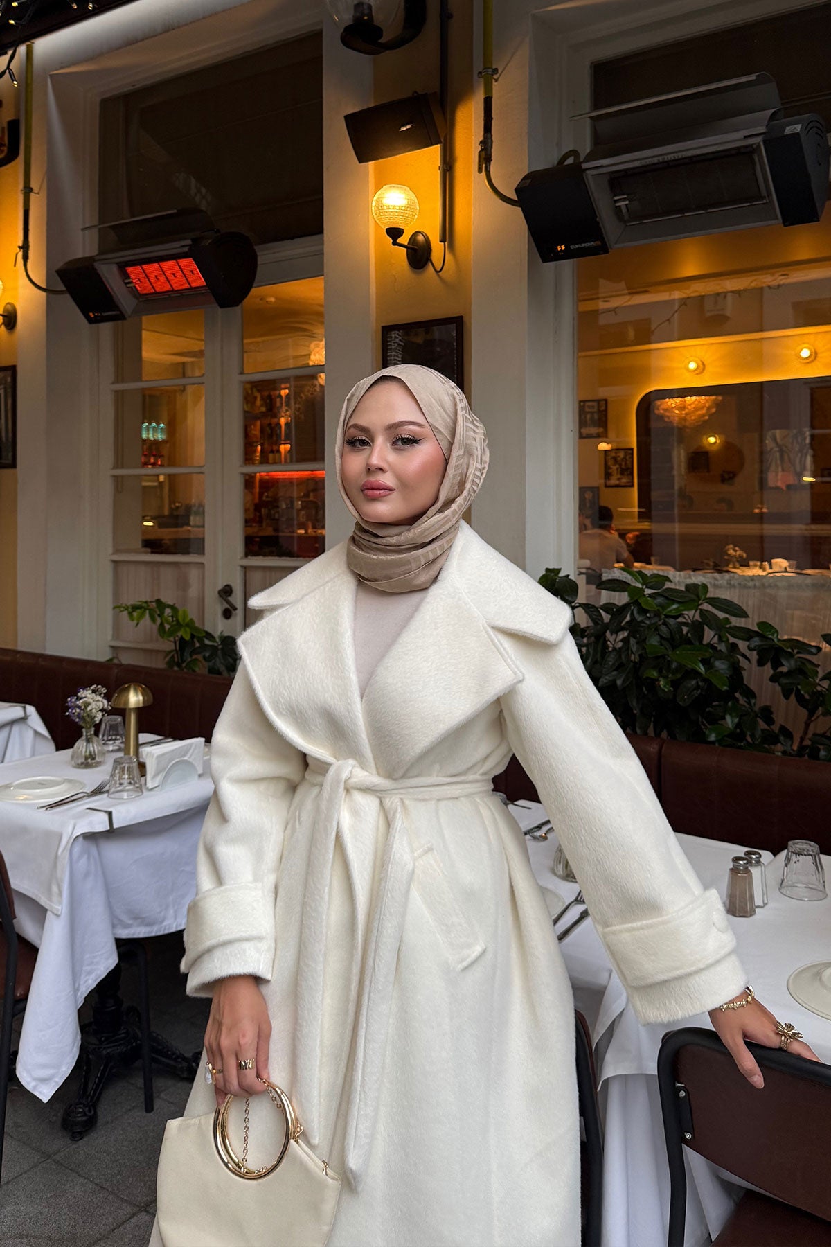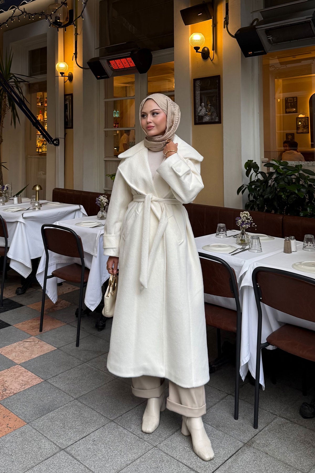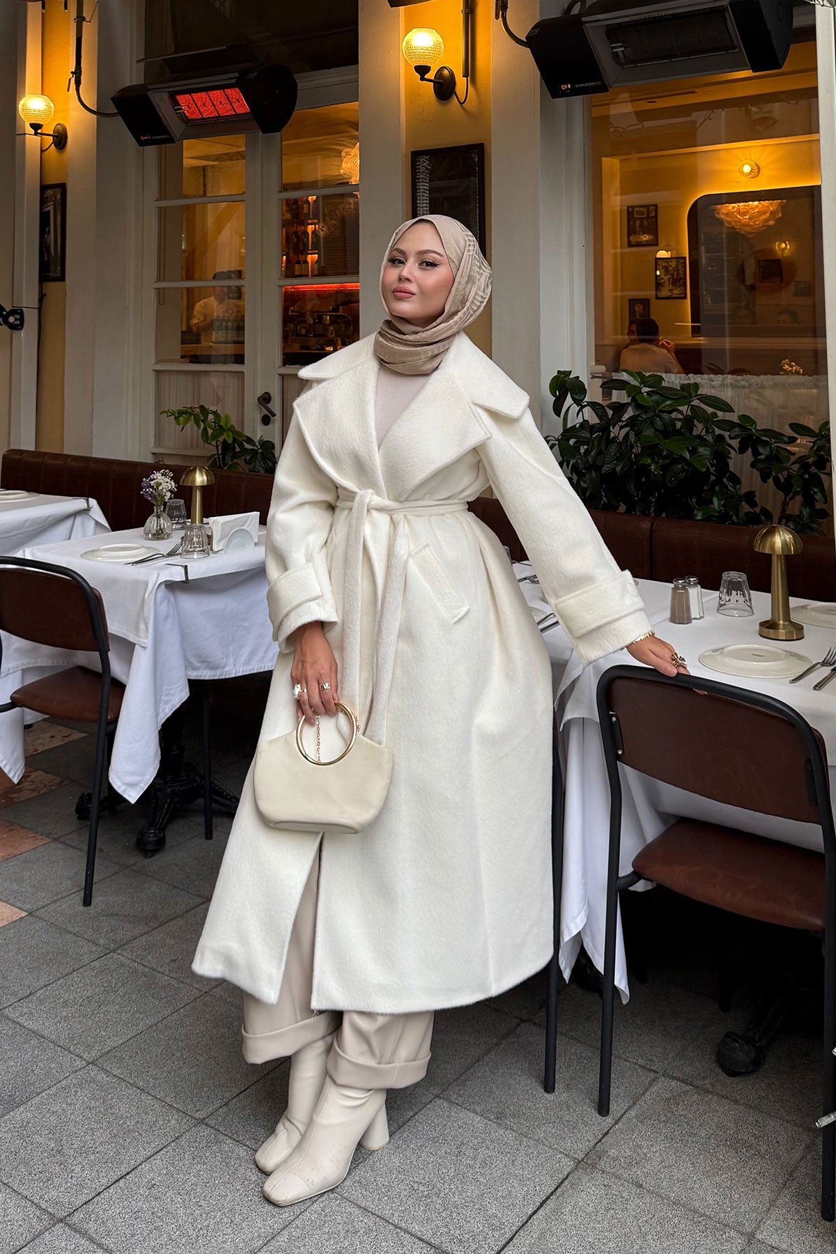 Kruvaze Yaka Bel Bağlamalı Kaban Ekru