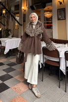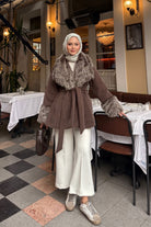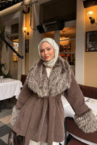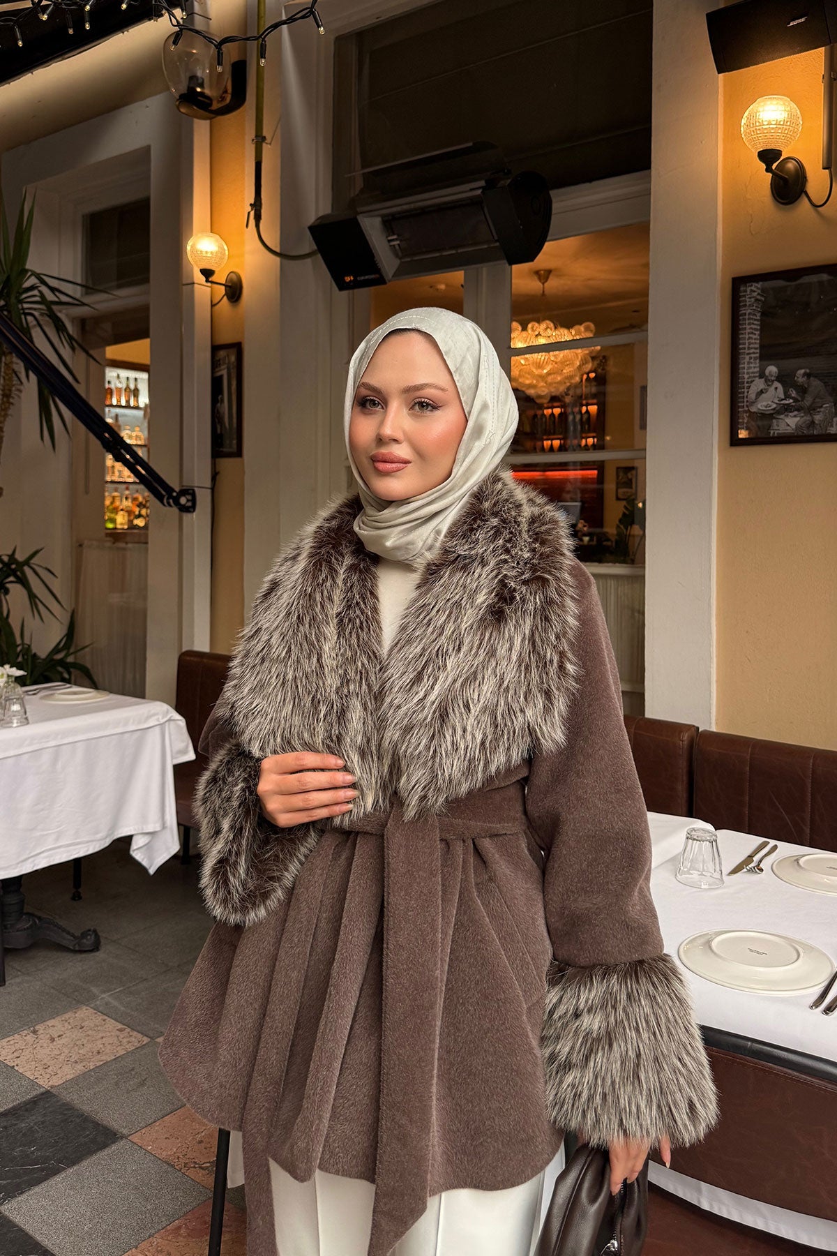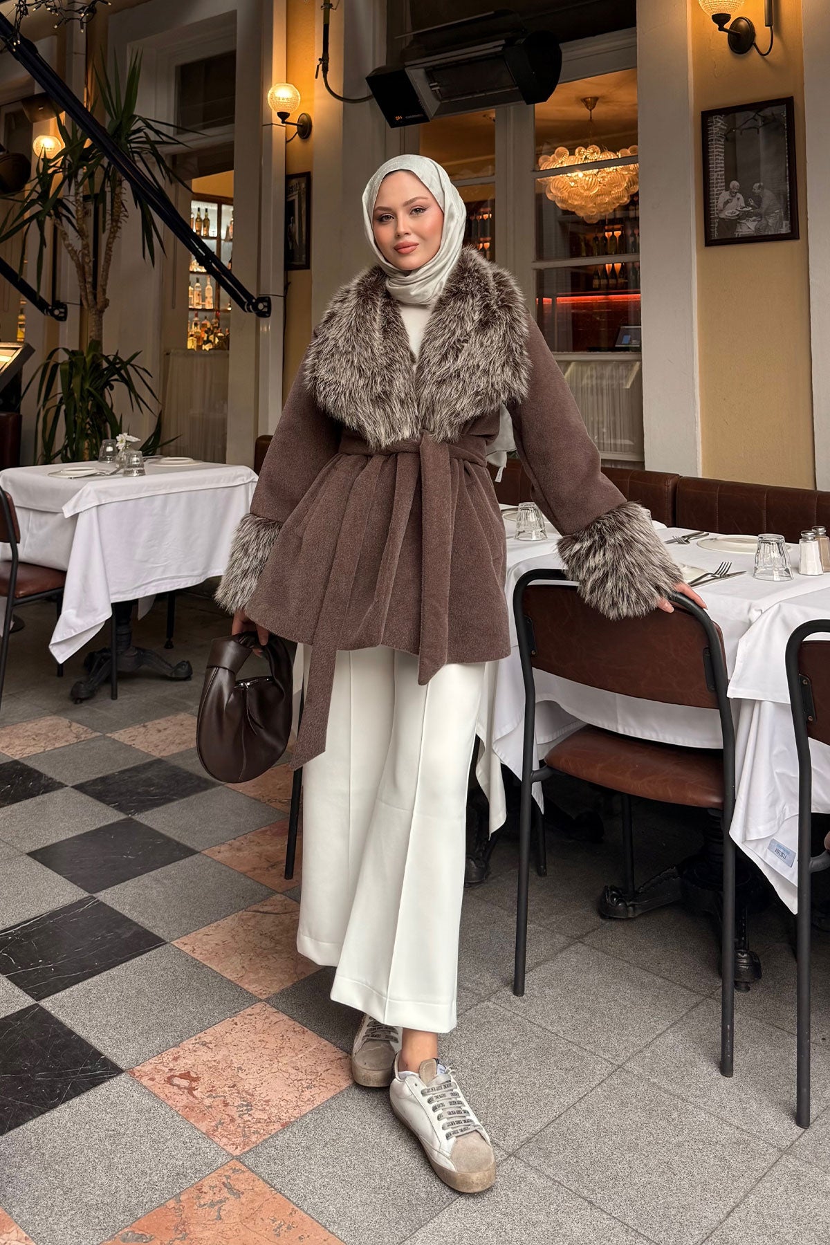 Kürk Detay Bel Bağlamalı Kısa Kaban Acı Kahve