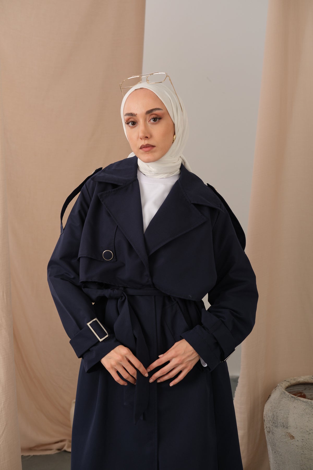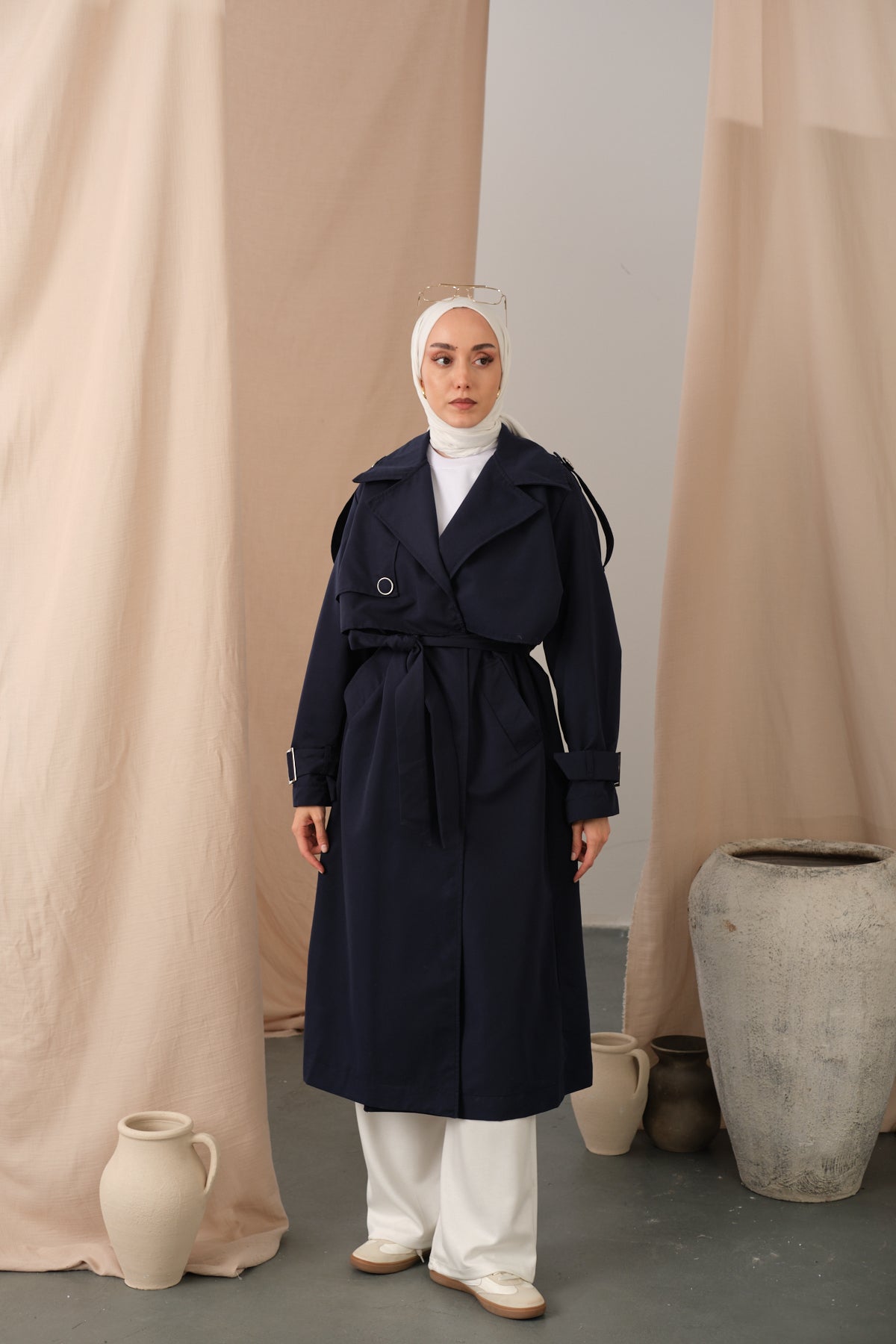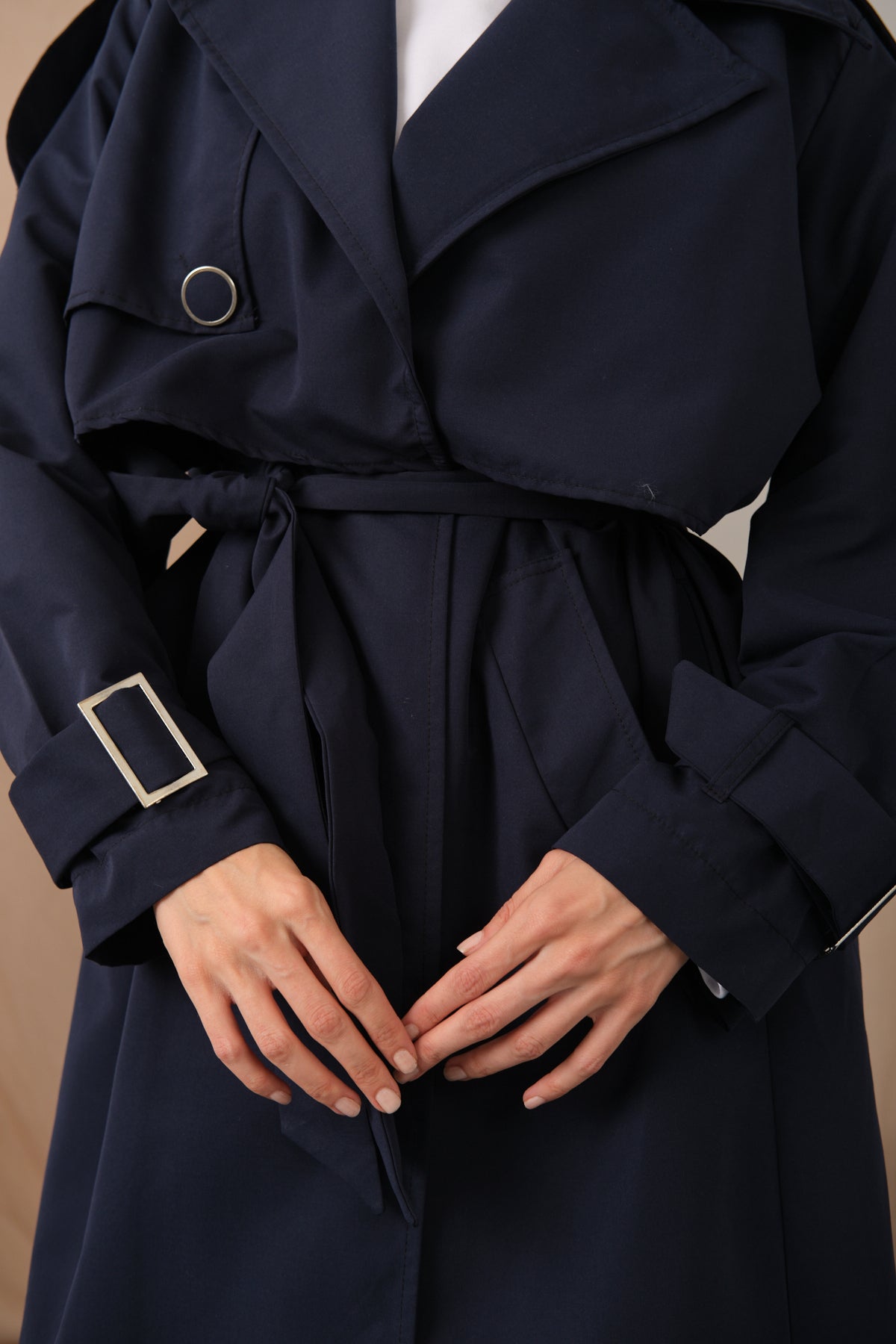 Sleeve Cuff Tie Detail Trench Coat - Navy Blue