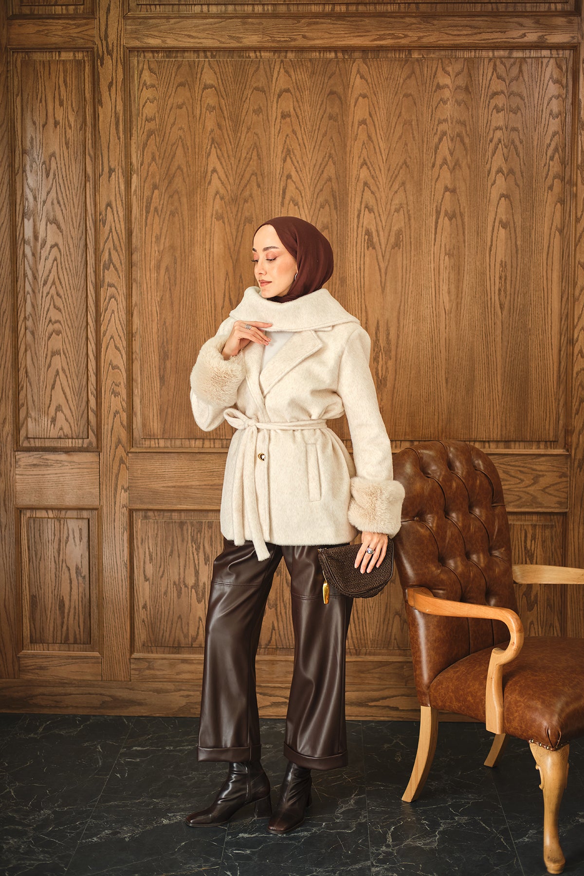 Wool Coat with Fur Trim and Bow Collar - Cream